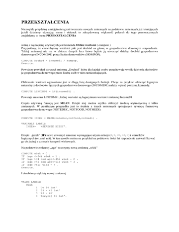 PRZEKSZTAŁCENIA Niezwykle przydatną umiejętnością jest tworzenie nowych zmiennych na podstawie zmiennych już istniejących jeżeli działamy używając menu i okienek to zdecydowaną większość poleceń do tego przeznaczonych znajdziemy w menu PRZEKSZTAŁCENIA Jedną z najczęściej używanych jest komenda Oblicz wartości ( compute ) Przypuśćmy, że chcielibyśmy wiedzieć jaki jest dochód na głowę w gospodarstwie domowym respondenta. Takiej zmiennej nie ma w zbiorze danych lecz łatwo będzie ją utworzyć dzieląc dochód gospodarstwa domowego (INCOME91) przez liczbę domowników (HOMPOP). COMPUTE Dochod = income91 / hompop. Execute. Powyższy przykład stworzył zmienną „Dochod” która dla każdej osoby przechowuje wynik dzielenia dochodów je gospodarstwa domowego przez liczbę osób w nim zamieszkujących. Obliczanie wartości wyposażone jest w długą listę dostępnych funkcji. Chcąc na przykład obliczyć logarytm naturalny z dochodów łącznych gospodarstwa domowego (INCOME91) należy wpisać poniższą komendę: COMPUTE LINCOM91 = LN(income91) . Powstaje zmienna LINCOM91, której wartości są logarytmem wartości zmiennej Income91 Często używaną funkcją jest MEAN. Dzięki niej można szybko obliczyć średnią arytmetyczną z kilku zmiennych. W poniższym przypadku jest to średnia z trzech zmiennych opisujących sytuację finansową gospodarstwa domowego (NOTEDUC, NOTFOOD, NOTMEDI): COMPUTE INDEX = MEAN(noteduc,notfood,notmedi) . VARIABLE LABELS INDEX= 'WSKAZNIK BIEDY'. Dzięki „jeżeli” (IF) łatwo utworzyć zmienne wymagające użycia relacji (<, >, =>, =<, =) i warunków logicznych (or, and, not). W ten sposób można na przykład na podstawie ilości lat respondenta zakwalifikować go do jednej z czterech kategorii wiekowych. Na podstawie zmiennej „age” tworzymy nową zmienną „wiek” COMPUTE wiek = 0 . IF (age <=34) wiek = 1 . IF (age >34 and age<=45) wiek = 2 . IF (age >45 and age<=61) wiek = 3 . IF (age >61) wiek = 4 . Execute. I dorabiamy etykiety nowej zmiennej VALUE LABELS WIEK 1 'Do 34 lat' 2 '35 - 45 lat' 3 '46 - 61' 4 'Powyżej 61 lat'. Identyczny efekt jak poprzednio możemy osiągnąć przez Rekodowanie. Polega na zmienianiu wartości zmiennych, czyli na nadawaniu wartościom zmiennej innych wartości (1=5, 2=6) lub na przypisywaniu podzakresom zmiennej określonych kodów (1,2,3=1; 4,5,6=2). RECODE age (1 THRU 34=1)(35 THRU 45=2) (46 THRU 61=3)(99=9). W tym wypadku oryginalne wartości zmiennej AGE zostały utracone. Aby zachować oryginalne wartości zmiennej należy podczas rekodowania utworzyć nową zmienną . Pokazuje to poniższy zapis : RECODE age (1 THRU 34=1)(35 THRU 45=2) (46 THRU 61=3)(99=9) INTO GRUPAGE . Nowo powstałą zmienną GRUPAGE możemy opisać identycznie jak poprzednio, nadając etykietę samej zmiennej VARIABLE LABEL GRUPAGE 'KATEGORIE WIEKOWE'. i jej wartościom: VALUE LABELS GRUPAGE 1 'Do 34 lat' 2 '35 - 45 lat' 3 '46 - 61' 4 'Powyżej 61 lat'. W zmiennej oryginalnej kodem określającym braki danych było 99, w nowej zmiennej jest to 9. Braki danych deklarujemy w następujący sposób : MISSING VALUE GRUPAGE (9). Braki danych z reguły kodujemy jako 9 (lub 99 lub 999) Odpowiedzi typu "nie wiem" jako 8 (lub 98 lub 998), zależnie wartości danej zmiennej, w której występują. Z reguły w deklarujemy braki danych i odpowiedzi typu "nie wiem" jako missing values. Innym popularnym sposobem deklarowania braków danych jest użycie wartości ujemnych, lecz my pozostaniemy przy 9. Została utworzona nowa zmienna, której wartość 1 oznacza osobę do 34 lat, 2 od 35 do 45 lat, 3-powyżej 45, 9 to brak danych. Kolejną komendą dającą możliwość tworzenia nowych zmiennych jest Rangowanie obserwacji (RANK.) Służy ona do rangowania wartości zmiennej według szeregu dostępnych kryteriów. Najczęściej używa się rangowania według wartości percentyli. Wyobraźmy sobie, że chcielibyśmy porangować dochody łączne gospodarstwa domowego od gospodarstw najbiedniejszych do najzasobniejszych. Możemy to zrobić dzieląc je według wartości decyli na 10 grup i przypisując poszczególnym grupom rangi od 1 do 10. RANK VARIABLES=income91 /TIES=MEAN . (A) /NTILES (10) /PRINT=YES Powstaje nowa zmienna ciągła, której wartości mówią nam do którego decyla dochodów należy gospodarstwo domowe respondenta. Dodatkowo, używając rank możemy rangować oddzielnie podgrupy osób badanych. Przykładowo jeśli porangowalibyśmy, wzrost respondentów prawdopodobnie najwyższe pozycje zajmowali by mężczyźni. Jeśli karzemy porangować wzrost według płci kobiety i mężczyźni zostaną porangowani oddzielnie w ten sposób np. rangę 1 otrzymają dwie osoby: najwyższa kobieta jak i mężczyzna, a nie jeden najwyższy respondent. Inną bardzo przydatną komendą służącą do tworzenia nowych zmiennych jest Zlicz wystąpienia (COUNT). Jej zastosowanie ilustruje poniższa procedura tworzenia “wskaźnika szczęścia”. Chcąc utworzyć taki wskaźnik można zliczyć wszystkie wartości oznaczające “bardzo szczęśliwy” (1) i “raczej szczęśliwy” (2) dla zmiennych opisujących poczucie szczęścia respondenta pięć lat temu (HAPPAS5), obecnie (HAPUNHAP) i za pięć lat (HAPFUT5). COUNT happy = happas5 hapunhap hapfut5 (1 thru 2) . VARIABLE LABELS happy 'WSKAZNIK SZCZESCIA(ile razy był b szczęśliwy )' . Powstaje nowa zmienna HAPPY, w której 0 oznacza, że respondent nie wskazał 1 lub 2 na żadnej z trzech zmiennych, a 3 mówi nam, że mamy do czynienia z wielkim optymistą, który był, jest i będzie szczęśliwy. DANE W zbiorze można wykonywać analizy na wybranej grupie przypadków. Wyboru przypadków (filtrowania) dokonuje się poprzez Wybierz Obserwacje: Dokonać możemy tego na dwa sposoby tak aby nie wybrane obserwacje zostały trwale usunięte lub czasowo wyłączone z analiz („odfiltrowane”) Poniższy przykład ilustruje polecenia wyłączające czasowo wszystkie osoby, kt