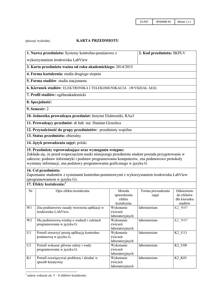 Z1-PU7 (pieczęć wydziału) WYDANIE N1 Strona 1 z 1 KARTA PRZEDMIOTU 1. Nazwa przedmiotu: Systemy kontrolno-pomiarowe z 2. Kod przedmiotu: SKPLV wykorzystaniem środowiska LabView 3. Karta przedmiotu ważna od roku akademickiego: 2014/2015 4. Forma kształcenia: studia drugiego stopnia 5. Forma studiów: studia stacjonarne 6. Kierunek studiów: ELEKTRONIKA I TELEKOMUNIKACJA (WYDZIAŁ AEiI) 7. Profil studiów: ogólnoakademicki 8. Specjalność: 9. Semestr: 2 10. Jednostka prowadząca przedmiot: Instytut Elektroniki, RAu3 11. Prowadzący przedmiot: dr hab. inż. Damian Grzechca 12. Przynależność do grupy przedmiotów: przedmioty wspólne 13. Status przedmiotu: obieralny 14. Język prowadzenia zajęć: polski 15. Przedmioty wprowadzające oraz wymagania wstępne: Zakłada się, że przed rozpoczęciem nauki niniejszego przedmiotu student posiada przygotowanie w zakresie: podstaw informatyki i podstaw programowania komputerów, zna podstawowe protokoły wymiany informacji, zna podstawy programowania graficznego w języku G 16. Cel przedmiotu: Zapoznanie studentów z systemami kontrolno-pomiarowymi z wykorzystaniem środowiska LabView (programowaniem w języku G). 17. Efekty kształcenia:1 Nr 1 Opis efektu kształcenia W1 Zna podstawowe zasady tworzenia aplikacji w środowisku LAbView. W2 Ma podstawową wiedzę o wadach i zaletach programowania w języku G. U1 Potrafi stworzyć prostą aplikację kontrolnopomiarową w języku G. U2 Potrafi wskazać główne zalety i wady programowania w języku G. K1 Potrafi rozwiązywać problemy i działać w sposób kreatywny należy wskazać ok. 5 – 8 efektów kształcenia Metoda sprawdzenia efektu kształcenia Wykonanie ćwiczeń laboratoryjnych Wykonanie ćwiczeń laboratoryjnych Wykonanie ćwiczeń laboratoryjnych Wykonanie ćwiczeń laboratoryjnych Wykonanie ćwiczeń laboratoryjnych Forma prowadzenia zajęć laboratorium Odniesienie do efektów dla kierunku studiów K2_W07 laboratorium K2_W07 laboratorium K2_U13 laboratorium K2_U08 laboratorium K2_K01 Z1-PU7 WYDANIE N1 Strona 2 z 2 18. Formy zajęć dydaktycznych i ich wymiar (liczba godzin) W.: Ćw.: L.: 30 19. Treści kształcenia: (oddzielnie dla każdej z form zajęć dydaktycznych W./Ćw./L./P./Sem.) Zagadnienia: 1. Opis środowiska LabView firmy National Instruments. Podział na panel czołowy i kreator schematów (blok diagram). Idea przepływu danych w środowisku LabView. Budowa prostych aplikacji z wykorzystaniem zdarzeń oraz funkcji wbudowanych. (4 godz.) 2. Budowa programu mieszanego (LabView + Matlab). Metody tworzenia aplikacji wynikowej (postać wykonywalna, plik instalatora). (4 godz.) 3. Karta dźwiękowa, jako najprostsze urządzenie do pozyskiwania i przetwarzania danych. Budowa oscyloskopu oraz analizatora widma z wykorzystaniem karty dźwiękowej. (4 godz.) 4. Konfiguracja karty MyRIO, budowa systemu opartego na pomiarze wielkości fizycznych i przesył danych do komputera PC za pomocą protokołu UDP. (4 godz.) 5. Wykorzystanie bibliotek DLL do komunikacji z urządzeniami wejścia-wyjścia (tzw. 3rd party hardware). (4 godz.) 6. Budowa aplikacji kontrolno-pomiarowej z interfejsem www. Tworzenie interfejsu użytkownika oraz logiki aplikacji. (4 godz.) 7. Aplikacja kontrolno-pomiarowa z wykorzystaniem Lego Technics (Mindstorms) (4 godz.) 20. Egzamin: nie 21. Literatura podstawowa: [1] Strona National Instruments: www.ni.com [2] Polskie Centrum LabView: www.labview.pl 22. Literatura uzupełniająca: 23. Nakład pracy studenta potrzebny do osiągnięcia efektów kształcenia Lp. Forma zajęć Liczba godzin kontaktowych / pracy studenta 0/0 1 Wykład 2 Ćwiczenia 3 Laboratorium 4 Projekt 0/0 5 Seminarium 0/0 6 Inne 10/5 Suma godzin 40/20 0/0 30/15 24. Suma wszystkich godzin: 60 25. Liczba punktów ECTS:2 2 26. Liczba punktów ECTS uzyskanych na zajęciach z bezpośrednim udziałem nauczyciela akademickiego: 1 27. Liczba punktów ECTS uzyskanych na zajęciach o charakterze praktycznym (laboratoria, projekty): 2 26. Uwagi: 2 1 punkt ECTS – 25-30 godzin. Z1-PU7 WYDANIE N1 Zatwierdzono: ……………………………. ………………………………………………… (data i podpis prowadzącego) (data i podpis dyrektora instytutu/kierownika katedry/ Dyrektora Kolegium Języków Obcych/kierownika lub dyrektora jednostki międzywydziałowej) Strona 3 z 3