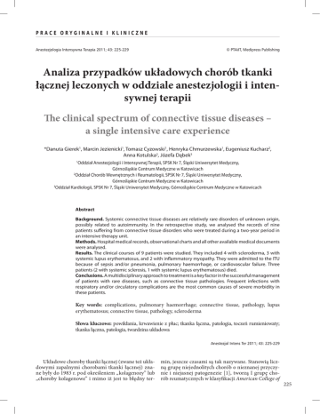 prace oryginalne i kliniczne Anestezjologia Intensywna Terapia 2011; 43: 225-229 © PTAiIT, Medipress Publishing Analiza przypadków układowych chorób tkanki łącznej leczonych w oddziale anestezjologii i intensywnej terapii The clinical spectrum of connective tissue diseases – a single intensive care experience *Danuta Gierek1, Marcin Jezienicki1, Tomasz Cyzowski1, Henryka Chmurzewska1, Eugeniusz Kucharz2, Anna Kotulska2, Józefa Dąbek3 Oddział Anestezjologii i Intensywnej Terapii, SPSK Nr 7, Śląski Uniwersytet Medyczny, Górnośląskie Centrum Medyczne w Katowicach 2 Oddział Chorób Wewnętrznych i Reumatologii, SPSK Nr 7, Śląski Uniwersytet Medyczny, Górnośląskie Centrum Medyczne w Katowicach 3 Oddział Kardiologii, SPSK Nr 7, Śląski Uniwersytet Medyczny, Górnośląskie Centrum Medyczne w Katowicach 1 Abstract Background. Systemic connective tissue diseases are relatively rare disorders of unknown origin, possibly related to autoimmunity. In the retrospective study, we analysed the records of nine patients suffering from connective tissue disorders who were treated during a two-year period in an intensive therapy unit. Methods. Hospital medical records, observational charts and all other available medical documents were analysed. Results. The clinical courses of 9 patients were studied. They included 4 with scleroderma, 3 with systemic lupus erythematosus, and 2 with inflammatory myopathy. They were admitted to the ITU because of sepsis and/or pneumonia, pulmonary haemorrhage, or cardiovascular failure. Three patients (2 with systemic sclerosis, 1 with systemic lupus erythematosus) died. Conclusions. A multidisciplinary approach to treatment is a key factor in the successful management of patients with rare diseases, such as connective tissue pathologies. Frequent infections with respiratory and/or circulatory complications are the most common causes of severe morbidity in these patients. Key words: complications, pulmonary haemorrhage; connective tissue, pathology, lupus erythematosus; connective tissue, pathology, scleroderma Słowa kluczowe: powikłania, krwawienie z płuc; tkanka łączna, patologia, toczeń rumieniowaty; tkanka łączna, patologia, twardzina układowa Anestezjol Intens Ter 2011; 43: 225-229 Układowe choroby tkanki łącznej (zwane też układowymi zapalnymi chorobami tkanki łącznej) znane były do 1983 r. pod określeniem „kolagenozy” lub „choroby kolagenowe” i mimo iż jest to błędny ter- min, jeszcze czasami są tak nazywane. Stanowią liczną grupę niejednolitych chorób o nieznanej przyczynie i niejasnej patogenezie [1], tworzą I grupę chorób reumatycznych w klasyfikacji American College of 225 Danuta Gierek i wsp. Rheumatology [1, 2]. Podstawą do ich klasyfikacji jest objęcie procesem chorobowym tkanki łącznej wielu narządów oraz wykazanie patogenetycznej roli zjawisk autoimmunizacyjnych, czego wyrazem jest występowanie autoprzeciwciał. Poszczególne choroby układowe, pomimo wspólnej patogenezy, różnią się między sobą obrazem klinicznym. Szeroki wachlarz objawów zależy od rodzaju uszkodzeń narządowych towarzyszących danej jednostce chorobowej. Mogą to być objawy łagodne (zmiany skórne, bóle stawowe), jak również ciężkie, wymagające natychmiastowej pomocy, stanowiące często bezpośrednie zagrożenie życia chorego. Ich obraz kliniczny może być charakterystyczny dla większości znanych stanów naglących kardiologicznych, nefrologicznych, pulmonologicznych, gastrologicznych, neurologicznych czy hematologicznych wymagających leczenia w OIT. Niejasna i istotnie odmienna od innych patogeneza omawianych zaburzeń sprawia, że leczenie chorych jest bardzo trudne [3, 4]. Stosowane są leki immunosupresyjne, immunoglobuliny, glikokortykosteroidy oraz plazmafereza [1, 2]. Leczenie objawowe zależy od rodzaju i zaawansowania niewydolności narządowej. Ze względu na obniżoną odporność chorzy narażeni są na zakażenia, stąd zapobieganie im wpływa na poprawę wyników leczenia. Celem pracy jest analiza przypadków układowych chorób tkanki łącznej u chorych leczonych w oddziale intensywnej terapii ze szczególnym uwzględnieniem problemów i odmienności postępowania leczniczego w tej grupie chorych. METODYKA Retrospektynowej analizie poddano: historie choroby, karty obserwacyjne, wcześniejszą dokumentację lekarską chorych leczonych w okresie 2 lat, których pierwotną przyczyną hospitalizacji była układowa choroba tkanki łącznej. W badanej grupie oceniano: wiek, płeć, śmiertelność, rodzaj układowej choroby tkanki łącznej, liczbę i czas hospitalizacji w OIT, powód przyjęcia do OIT, zastosowane leczenie oraz wartość skal APACHE II i TISS 28. W związku z małą liczebnością chorych w badanej grupie przy ocenie wyników odstąpiono od analizy statystycznej. Przedstawiono je w postaci wartości bezwzględnych. WYNIKI 226 W okresie od 1 stycznia 2008 r. do 31 grudnia 2009 r. w OIT Górnośląskiego Centrum Medycznego hospitalizowano 9 osób z rozpoznaną układową chorobą tkanki łącznej. Stanowiło to 2,3% chorych leczonych w oddziale w tym okresie. U 4 rozpoznano twardzinę układową (TU), u 3 toczeń rumieniowaty układowy (TRU) i u 2 – miopatię zapalną (MZ): 1 – zapalenie wielomięśniowe, 1 – zapalenie skórno-mięśniowe. Przeciętny czas pobytu był podobny we wszystkich grupach chorych (tab. I). Główną przyczyną przyjęcia chorych do oddziału intensywnej terapii była niewydolność układu krążenia. Wśród powikłań w postaci zakażenia najczęściej występowała sepsa (5 przypadków). Była stwierdzona przy przyjęciu u 2 chorych z TRU i 1 z TU. Kolejne 2 przypadki sepsy rozwinęły się w czasie hospitalizacji w OIT. Pierwszy dotyczył chorej z TRU, u której żródłem sepsy był cewnik a patogenem Staphylococcus aureus-MSSA. Drugi przypadek wystąpił u chorego z TU – punktem wyjścia były drogi moczowe a patogenem – Klebsiella 