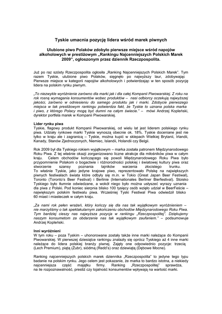 Tyskie umacnia pozycję lidera wśród marek piwnych Ulubione piwo Polaków zdobyło pierwsze miejsce wśród napojów alkoholowych w prestiŜowym „Rankingu Najcenniejszych Polskich Marek 2009”, ogłoszonym przez dziennik Rzeczpospolita. JuŜ po raz szósty Rzeczpospolita ogłosiła „Ranking Najcenniejszych Polskich Marek”. Tym razem Tyskie, ulubione piwo Polaków, sięgnęło po najwyŜszy laur, zdobywając Pierwsze miejsce w kategorii napojów alkoholowych i potwierdzając w ten sposób pozycję lidera na polskim rynku piwnym. „To niezwykle wyróŜnienie zarówno dla marki jak i dla całej Kompanii Piwowarskiej. Z roku na rok rosną wymagania konsumentów wobec produktów – nasi odbiorcy oczekują najwyŜszej jakości, zarówno w odniesieniu do samego produktu jak i marki. Zdobycie pierwszego miejsca w tak prestiŜowym rankingu potwierdza fakt, Ŝe Tyskie to uznana polska marka i piwo, z którego Polacy mogą być dumni na całym świecie.” – mówi Andrzej Kopleński, dyrektor portfela marek w Kompanii Piwowarskiej. Lider rynku piwa Tyskie, flagowy produkt Kompanii Piwowarskiej, od wielu lat jest liderem polskiego rynku piwa. Udziały rynkowe marki Tyskie wynoszą obecnie ok. 18%. Tyskie doceniane jest nie tylko w kraju ale i zagranicą – Tyskie, moŜna kupić w sklepach Wielkiej Brytanii, Irlandii, Kanady, Stanów Zjednoczonych, Niemiec, Islandii, Holandii czy Belgii. Rok 2009 był dla Tyskiego rokiem wyjątkowym – marka została patronem Międzynarodowego Roku Piwa. Z tej właśnie okazji zorganizowano liczne atrakcje dla miłośników piwa w całym kraju. Celem obchodów kończącego się powoli Międzynarodowego Roku Piwa było przypomnienie Polakom o bogactwie i róŜnorodności polskiej i światowej kultury piwa oraz stworzenie szansy poznania tajników warzenia złocistego trunku. To właśnie Tyskie, jako jedyne krajowe piwo, reprezentowało Polskę na największych piwnych festiwalach świata które odbyły się m.in. w Tokio (Great Japan Beer Festiwal), Toronto (Toronto’s Beer Festival) i Berlinie (Internationales Berliner Bierfestival). Stoisko Tyskiego było tłumnie odwiedzane, a wokół niego było moŜna usłyszeć wyrazy uznania dla piwa z Polski. Pod koniec sierpnia blisko 100 tysięcy osób wzięło udział w BeerFeście – największym polskim festiwalu piwa. Wcześniej Tyski Festiwal Piwa odwiedził blisko 60 miast i miasteczek w całym kraju. „Za nami rok pełen wraŜeń, który kończy się dla nas tak wyjątkowym wyróŜnieniem – nie marzyliśmy o tak spektakularnym zakończeniu obchodów Międzynarodowego Roku Piwa. Tym bardziej cieszy nas najwyŜsza pozycja w rankingu „Rzeczpospolitej”. Dziękujemy naszym konsumetom za obdarzenie nas tak wyjątkowym zaufaniem.” – podsumowuje Andrzej Kopleński. Inni wyróŜnieni W tym roku – poza Tyskim – uhonorowane zostały takŜe inne marki naleŜące do Kompanii Piwowarskiej. W pierwszej dziesiątce rankingu znalazły się oprócz Tyskiego aŜ 4 inne marki naleŜące do lidera polskiej branŜy piwnej. Zajęły one odpowiednio pozycje: trzecią (Lech Premium), piątą (śubr), siódmą (Redd’s) oraz dziewiątą (Dębowe Mocne). Ranking najcenniejszych polskich marek dziennika „Rzeczpospolita” to jedyne tego typu badanie na polskim rynku. Jego celem jest pokazanie, Ŝe marka to bardzo istotna, a niekiedy najcenniejsza część majątku firmy. Ranking „Rzeczpospolitej” sprawdza, na ile rozpoznawalność, prestiŜ czy lojalność konsumentów wpływają na wartość marki. *** Informacje dodatkowe: Tyskie. Z Polski. Tyskie to czołowa marka Kompanii Piwowarskiej - jest niekwestionowanym liderem wśród wszystkich polskich marek piwa pod względem zarówno wielkości sprzedaŜy krajowej, eksportu, jak i wygenerowanych wpływów. Tyskie wielokrotnie zostało uhonorowane najbardziej prestiŜowymi nagrodami branŜy piwnej na całym świecie - w 2005 roku m.in. Złotym Medalem oraz Grand Prix podczas Międzynarodowego Konkursu BranŜy Piwowarskiej (The Brewing Industry International Awards), przeprowadzanego od roku 1886. Doceniane zagranicą Tyskie, jest takŜe ulubionym piwem Polaków, Sponsorem Reprezentacji Polski jej trenera Leo Beenhakkera oraz Polskiej Reprezentacji Olimpijskiej. Tyskie jest wszędzie tam gdzie moŜemy być dumni z naszego kraju. To prawdziwa wizytówka Polski. Tyskie to lekkie piwo typu pilzneńskiego o zawartości ekstraktu 11,7% oraz alkoholu na poziomie 5,6%. Piwosze cenią jego łagodny chmielowy zapach, złocisty kolor oraz gęstą białą pianę. Kompania Piwowarska - Lider branŜy piwowarskiej w Polsce Kompania Piwowarska jest największym przedsiębiorstwem piwowarskim w Polsce. Kilkusetletnie doświadczenia w warzeniu piwa, nowoczesna technologia i rygorystyczne przestrzeganie zasad produkcji na światowym poziomie (World Class Manufacturing) gwarantują najwyŜszą jakość jej produktów. Do portfela marek naleŜy m.in. Tyskie (ulubione piwo Polaków), śubr (druga marka w Polsce pod względem wielkości sprzedaŜy), Lech, Dębowe Mocne, Redd's, Wojak, a takŜe międzynarodowe marki premium: Grolsch, Pilsner Urquell, Miller Genuine Draft oraz Peroni Nastro Azzurro. Kompania Piwowarska powstała w 1999 roku w wyniku połączenia Tyskich Browarów KsiąŜęcych i Lech Browary Wielkopolski. W roku 2003 do Kompanii dołączył Browar Dojlidy w Białymstoku. Wielkość sprzedaŜy osiągniętej przez KP w roku finansowym zakończonym 31 marca 2009 wyniosła 15,1 mln hektolitrów piwa. Firma została w 2009 roku zwycięzcą Rankingu Odpowiedzialnych Firm, opracowanego przez Forum Odpowiedzialnego Biznesu i PricewaterhouseCoopers. SABMiller – jeden z największych na świecie producentów piwa Kompania Piwowarska jest częścią jednego z największych na świecie producentów piwa - SABMiller plc. Grupa produkuje lub dystrybuuje piwo na sześciu kontynentach, a jej ogólnoświatowy portfel obejmuje międzynarodowe piwa premium, takie jak Grolsch, Miller 