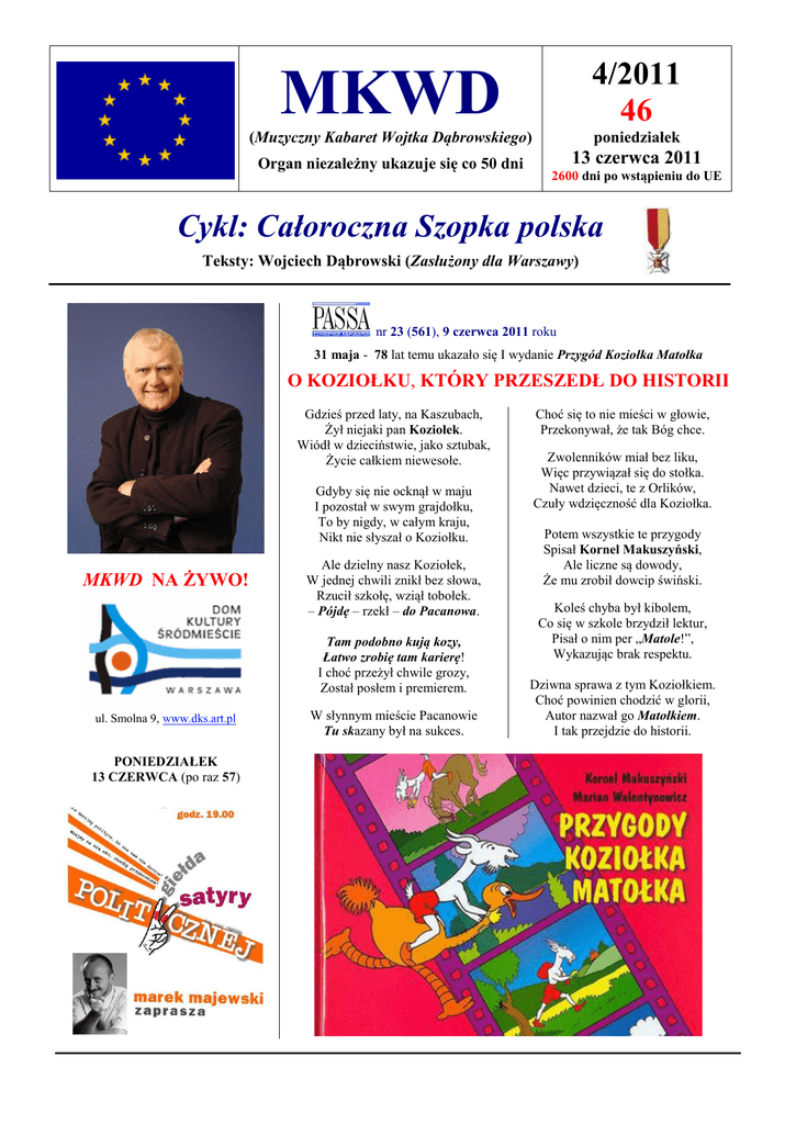 MKWD 4/2011 46 (Muzyczny Kabaret Wojtka Dąbrowskiego) poniedziałek Organ niezależny ukazuje się co 50 dni 13 czerwca 2011 2600 dni po wstąpieniu do UE Cykl: Całoroczna Szopka polska Teksty: Wojciech Dąbrowski (Zasłużony dla Warszawy) nr 23 (561), 9 czerwca 2011 roku 31 maja - 78 lat temu ukazało się I wydanie Przygód Koziołka Matołka O KOZIOŁKU, KTÓRY PRZESZEDŁ DO HISTORII Gdzieś przed laty, na Kaszubach, Żył niejaki pan Koziołek. Wiódł w dzieciństwie, jako sztubak, Życie całkiem niewesołe. Gdyby się nie ocknął w maju I pozostał w swym grajdołku, To by nigdy, w całym kraju, Nikt nie słyszał o Koziołku. MKWD NA ŻYWO! Ale dzielny nasz Koziołek, W jednej chwili znikł bez słowa, Rzucił szkołę, wziął tobołek. – Pójdę – rzekł – do Pacanowa. Tam podobno kują kozy, Łatwo zrobię tam karierę! I choć przeżył chwile grozy, Został posłem i premierem. ul. Smolna 9, www.dks.art.pl PONIEDZIAŁEK 13 CZERWCA (po raz 57) W słynnym mieście Pacanowie Tu skazany był na sukces. Choć się to nie mieści w głowie, Przekonywał, że tak Bóg chce. Zwolenników miał bez liku, Więc przywiązał się do stołka. Nawet dzieci, te z Orlików, Czuły wdzięczność dla Koziołka. Potem wszystkie te przygody Spisał Kornel Makuszyński, Ale liczne są dowody, Że mu zrobił dowcip świński. Koleś chyba był kibolem, Co się w szkole brzydził lektur, Pisał o nim per „Matole!”, Wykazując brak respektu. Dziwna sprawa z tym Koziołkiem. Choć powinien chodzić w glorii, Autor nazwał go Matołkiem. I tak przejdzie do historii. str. 2 MKWD, nr 4 (46) /2011, Warszawa, poniedziałek, 13 czerwca 2011 roku (2600 dni po wstąpieniu do UE) nr 20 (558), 19 maja 2011 roku MAŁY PORADNIK SAVOIR VIVRE’U dla Prezydentów i przywódców światowej finansjery Gdy brak manier i brak kindersztuby, Nie przeszkadza to być Prezydentem, Ale warto to wiedzieć, mój luby, Że są normy powszechnie przyjęte. A gdy deszcz się przypadkiem rozpada, Bądź obyty i wykaż się klasą, I witając przed domem sąsiada, Moknij sam, a daj gościom parasol! Bądź na luzie! Lecz są, moim zdaniem, Zachowania zbyt awangardowe! Gdy z królową masz ważne spotkanie, Nie pij nigdy z kieliszka królowej! Nie popełniaj, jak Czech, innej gafy, Bo historia i świat cię oceni. Pod traktatem stawiając parafy, Piór nie wynoś ze sobą w kieszeni. Prezydenta przyjmując z Kanclerzem, O czym chętnie doniosą w gazetach, Nie rozsiadaj się, radzę ci szczerze, Zanim pierwsza nie siądzie kobieta! Za to podczas miłosnych podbojów W nowojorskim hotelu Sofitel, Pokojówkę przyjmując w pokoju, Nie chodź nago, włóż szlafrok lub kitel. nr 19 (557), 12 maja 2011 WESELE’2011 110 lat po premierze Wesela Stanisława Wyspiańskiego Rano dziś spotkałem Włodka. Ledwo poznał mnie, gdy spotkał. – Włodek! – mówię. – Bój się Boga! Ledwo trzymasz się na nogach! – Wybacz, kumie, lecz mam kaca, Właśnie – rzekł – z Bronowic wracam, A tam – przyznał się, chłopisko – Było niezłe Weselisko! Piłem dużo, to się zdarza. Taka rola gospodarza! Stąd mam ten przepity głos I, pardon, czerwony nos! Wszystko to opisał Staszek. Opróżniłem kilka flaszek! To był Chopin! Też byś pił! Więc go pytam: Kto tam był? A on na to: Coś mi świta! Wpadła jakaś tam kobita, A z nią dwie lub trzy dziewczyny. Gość niezwykły! Z Ukrainy! Siadła przy mnie. Piła drinka. Tak, to była Ukrainka! Albo Włoszka? Prosto z TIR-a. Wspominała coś o lirach! Jakaś Wenus czy Junona! Była nieźle nawalona! Znikła niczym duch, miarkuję. I dlatego źle się czuję! Zniżył głos! A w głosie trwoga! – Może znasz wenerologa? Stach usłyszał od doktora, Kto to był... Wenera chora! Jaka Wenus? Co za pani? Czyżbyś ciągle był na bani? Co ty bredzisz? Wszelki duch! Wytężam, wytężam słuch... Teraz głową wali w mur! Jakby się z choinki ur-wał. Ostał mu się ino sznur... Pije kur... Oj, pije kur... nr 24 (562), 16 czerwca 2011 roku KASA JEST NAJWAŻNIEJSZA! Dziś zapewne niektórzy zawiodą się srodze, Bo nic nie napisałem przez zwykłe lenistwo, Lecz tu jestem, bo z wami jest mi dziś po drodze! Bardzo mi się podoba wasze towarzystwo * Co do mnie: lubię zmiany. Myślę o transferze, A to podpowiedziała mi znajoma gejsza: Że wierność nie jest ważna. W lojalność nie wierzę. Najważniejsza jest kasa. Kasa jest najważniejsza! * słowa będące cytatem Hillary Clinton, wygłoszone przez Joannę Kluzik Rostkowską, b. szefową sztabu wyborczego Jarosława Kaczyńskiego (PiS) w kampanii prezydenckiej, założycielkę partii i Koła parlamentarnego Polska Jest Najważniejsza, podczas konwencji Platformy Obywatelskiej w dniu 12 czerwca, po opuszczeniu partii PJN i przejściu do PO. © MKWD (Muzyczny Kabaret Wojtka Dąbrowskiego) Warszawa, tel (22) 641 64 40, 0-600 630 952 www.spotkaniazpiosenka.org Następny numer ukaże się 2 sierpnia 2011 roku (2650 dni po wstąpieniu do UE) Dodatek specjalny MKWD, nr 4 (46) /2011, Warszawa, poniedziałek, 13 czerwca 2011 roku (2600 dni po wstąpieniu do UE) Z okazji Dnia Dziecka nr 22 (560), 2 czerwca 2011 roku DZIŚ, DROGIE DZIECI, BĘDĄ FRASZKI, O OLI CO LUBIŁA PTASZKI wierszyk dla nieco starszych dzieci Wieść się rozeszła po rodzinie, Że mała Ola z tego słynie, Że nie chce mleka ani kaszki, Nie chce wycieczek do Góraszki, Ani jej w głowie fatałaszki, Żadne apaszki, tylko… ptaszki! Wiedziała szkoła, że ma fioła Na punkcie zięby i dzięcioła I że całymi godzinami Może zajmować się ptaszkami. Więc Olę w szkole cenił biolog I lubił się spotykać z Olą. Raz odwiedziła Ola ciocię. A ciocia miała dom w Sopocie. Wuj, zapalony ornitolog, Raz się na molo wybrał z Olą, A że się wujek znał na rzeczy, Pokazał mewę, która skrzeczy. Po latach, gdy podrosła Ola, I z Oli zrobił się małolat, Napotkanego młodzieniaszka Zawsze pytała, czy ma ptaszka? Ale niejeden ją oszukał, Mówiąc, 