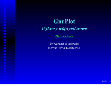 GnuPlot Wykresy trójwymiarowe Zbigniew Koza Uniwersytet Wrocławski Instytut Fizyki Teoretycznej GnuPlot – p. 1/ Polecenie splot • Wykresy 3D generujemy poleceniem splot: splot sin(x)*y sin(x)*y 10 8 6 4 2 0 -2 -4 -6 -8 -10 10 5 -10 0 -5 0 -5 5 10-10 GnuPlot – p. 2/ Polecenie splot • Wi˛ekszość opcji polecenia plot ma też zastosowanie w poleceniu splot, np. splot [1:10][1:10][0:] splot ’dane.txt’ x*y w lp GnuPlot – p. 3/ Wykresy konturowe • Wyświetlanie „linii o jednakowej wysokości”: set contour x*x + 2*y*y 300 250 200 150 100 50 300 250 200 150 100 50 10 0 5 -10 0 -5 0 -5 5 GnuPlot – p. 4/ Wykresy konturowe • • • Wyświetlanie „linii o jednakowej wysokości”: set contour Dodatkowe opcje: • linie na płaszczyźnie xy: set contour base • linie na wyświetlanej powierzchni: set contour surface • linie na obu płaszczyznach: set contour both Uzyskiwanie informacji: show contour GnuPlot – p. 5/ Parametry wykresów konturowych • • • Parametry wykresów konturowych definiuje si˛e poleceniem set cntrparam Interpolacja (linear, cspline, bspline): set ctrparam bspline Poziomy konturów: set ctrparam levels 10 set ctr levels incremental 0,1,4 set ctr lev discrete .1, .5, .9 GnuPlot – p. 6/ Parametry siatki • • • • Ustalanie g˛estości siatki: set isosamples 20,20 Ustalanie "dokładności" linii siatki: set samples 200 Ukrywanie zasłoni˛etych powierzchni: set hidden3d Ukrywanie powierzchni: unset surface GnuPlot – p. 7/ Parametry widoku • • Ustalanie kata, ˛ pod jakim widać wykres: set view rot_x rot_z scale scale_z set view 60, 30, 1, 0.5 Rysowanie mapy: set view map GnuPlot – p. 8/
