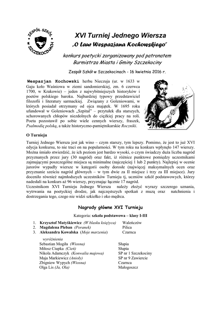 XVI Turniej Jednego Wiersza „O Laur Wespazjana Kochowskiego”
