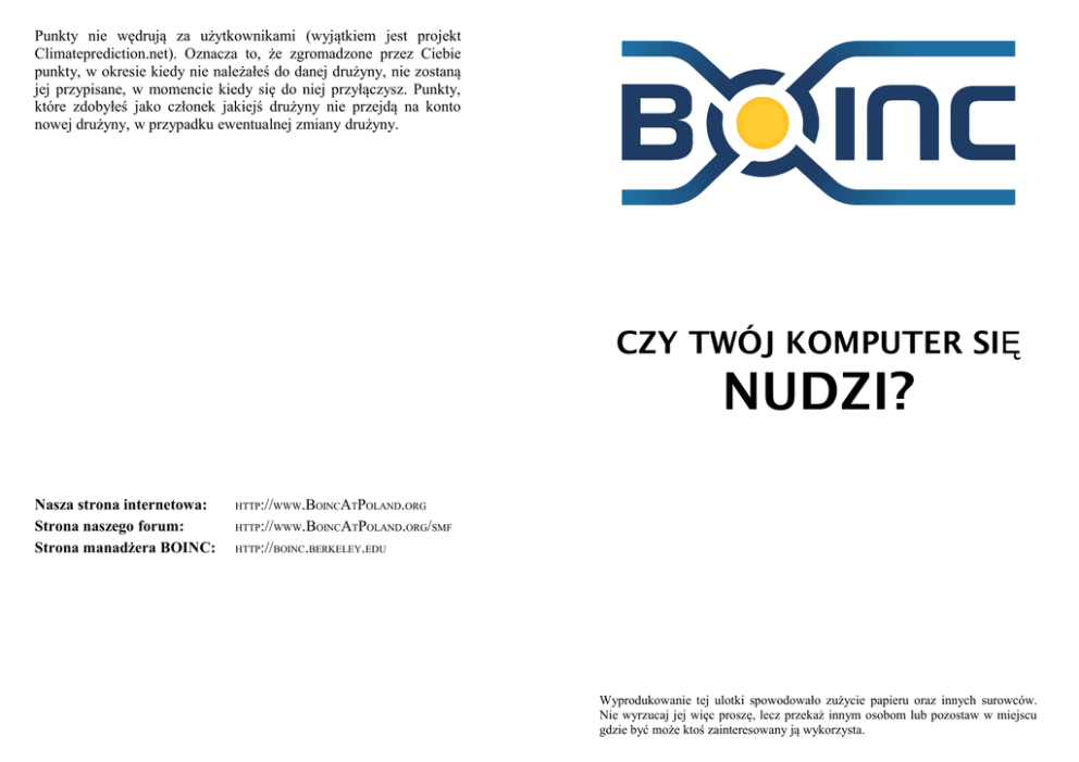 Punkty nie wędrują za użytkownikami (wyjątkiem jest projekt Climateprediction.net). Oznacza to, że zgromadzone przez Ciebie punkty, w okresie kiedy nie należałeś do danej drużyny, nie zostaną jej przypisane, w momencie kiedy się do niej przyłączysz. Punkty, które zdobyłeś jako członek jakiejś drużyny nie przejdą na konto nowej drużyny, w przypadku ewentualnej zmiany drużyny. CZY TWÓJ KOMPUTER SIĘ NUDZI? Nasza strona internetowa: Strona naszego forum: Strona manadżera BOINC: HTTP://WWW.BOINCATPOLAND.ORG HTTP://WWW.BOINCATPOLAND.ORG/SMF HTTP://BOINC.BERKELEY.EDU Wyprodukowanie tej ulotki spowodowało zużycie papieru oraz innych surowców. Nie wyrzucaj jej więc proszę, lecz przekaż innym osobom lub pozostaw w miejscu gdzie być może ktoś zainteresowany ją wykorzysta. PRZETWARZANIE ROZPROSZONE (ANG. DISTRIBUTED COMPUTING - DC) Polega na podzieleniu danego zagadnienia obliczeniowego na wiele części a następnie wysłaniu ich do wielu niezależnych od siebie komputerów. Te po pobraniu pewnej porcji danych z serwera, wykonują zaprogramowane obliczenia, po czym przesyłają rezultaty swojej pracy z powrotem do serwera, gdzie są dostępne dla naukowców. Przetwarzanie rozproszone stanowi tańszą alternatywę wobec budowania jednostek o wysokiej mocy obliczeniowej, takich jak klastry czy superkomputery. Niestety jego zastosowanie ogranicza się do tych problemów, które dają się podzielić. CZY NIE LEPIEJ BYŁOBY WYKORZYSTAĆ JEDEN, BARDZO MOCNY KOMPUTER? Na to pytanie nie ma jednej dobrej odpowiedzi. Przetwarzanie rozproszone pozwala uzyskać moc obliczeniową o wiele większą, niż najnowocześniejsze superkomputery i to przy dużo niższych kosztach. Z drugiej strony, nie każdy problem nadaje się do przetwarzania rozproszonego. Jednak wszędzie tam, gdzie udaje się zaprząc do pracy wiele komputerów, uzyskuje się nadspodziewanie dobre efekty. ALE CO TO MA WSPÓLNEGO ZE MNĄ? Rozwój internetu pozwolił naukowcom zajmującym się przetwarzaniem rozproszonym na ciekawą „zagrywkę”. W roku 1999 na Uniwersytecie Berkeley wystartował projekt SETI@home, wykorzystujący do przetwarzania rozproszonego komputery użytkowników internetu. Naukowcy zauważyli bowiem, że komputery w domach czy biurach, bardzo często nie są wykorzystywane w pełni swoich możliwości. Choć to wydaje się mało prawdopodobne, to jednak przeciętny komputer rzadko kiedy obciążony jest w 100%, a często jego praca sprowadza się do wyświetlania wygaszacza ekranu. Projektanci SETI@home stworzyli zatem wygaszacz ekranu, który każdy użytkownik DLACZEGO WARTO LICZYĆ Z BOINC@POLAND? Jako członek BOINC@Poland będziesz miał dostęp do najlepszej polskiej strony poświęconej BOINC, gdzie znajdziesz informacje o niemal wszystkich projektach, poradniki i artykuły, które pomogą Ci poruszać się w świecie BOINC. Na naszej stronie staramy się również na bieżąco informować o wszystkich istotnych wydarzeniach z projektów i świata BOINC. Na forum BOINC@Poland szybko dowiesz się o powstaniu nowych projektów, przerwach w działaniu projektów oraz znajdziesz osoby, które chętnie odpowiedzą na Twoje pytania związane z BOINC i pomogą rozwiązać ewentualne problemy. Z nami przekonasz się, że liczenie w BOINC to nie tylko wspieranie nauki, lecz również zabawa. Rywalizujemy z najlepszymi drużynami świata nie tylko w ramach stałych statystyk, lecz bierzemy udział w często organizowanych wyścigach. Okazją do poznania większej ilości projektów może być udział w zabawie Projekt miesiąca. Licząc razem z BOINC@Poland będziesz wspierał największą polską drużynę, która ma duże szanse znaleźć się w ścisłej światowej czołówce drużyn BOINC, co pozwoli podkreślić rolę Polski w obliczeniach rozproszonych. Obecnie BOINC@Poland plasuje się w drugiej dziesiątce drużyn, podczas gdy w klasyfikacji krajów Polska zajmuje wysokie 11. miejsce. Obrazuje to duże rozproszenie polskich liczydłowych (dla porównania najlepsza czeska drużyna zajmuje 6. miejsce na świecie). Przyłączając się do BOINC@Poland przyczynisz się do poprawienia tego stanu rzeczy. UWAGI NA TEMAT PUNKTÓW. Podkreślamy, że pozycja Polski czy polskiej drużyny w statystykach ma znaczenie wyłącznie prestiżowe. Sama rywalizacja na punkty stanowi zaś jedynie uatrakcyjnienie liczenia, którego głównym celem jest wspieranie nauki. Przyłączenie się do drużyny nie ma żadnego wpływu na Twoje indywidualne statystyki. Jeśli przyłączysz się do drużyny, od tej chwili będzie ona otrzymywać równowartość zdobywanych przez Ciebie punktów. Ty nic nie stracisz, a drużyna zyska punkty. JAK TO DZIAŁA? Gdy uruchamiasz BOINC na swoim komputerze, program działa zgodnie z poniższym schematem. rozproszonego na jednym komputerze. Jest to możliwe dzięki ujednoliconej strukturze wszystkich projektów. Co więcej, każdy użytkownik może w łatwy sposób ustalić, ile czasu jego komputer poświęci na pracę z poszczególnymi projektami. BOINC potrafi także zmagazynować dane wejściowe i wyjściowe, aby pracować bez przerw, gdy połączenie z serwerem projektu jest niemożliwe. Ponadto za czas przeznaczony na prace z projektami przyznawane są użytkownikom punkty kredytowe, które pozwalają na współzawodnictwo pomiędzy poszczególnymi użytkownikami, ale też pomiędzy krajami lub drużynami. BOINC@Poland jest właśnie jedną z takich drużyn. NA JAKICH SYSTEMACH OPERACYJNYCH MOŻNA URUCHOMIĆ BOINC? 1. Twój komputer otrzymuje zestaw instrukcji z serwera harmonogramów. Instrukcje te są zależne od Twojego PC, np.: serwer nie przydzieli mu pracy wymagającej większej ilości pamięci RAM, niż posiadasz. Projekty mogą obejmować wiele aplikacji, a serwer może przesłać dane dla którejkolwiek z nich. 2. Twój komputer ściąga aplikacje i pliki wejściowe z serwera danych (data server) danego projektu. Aplikacje są ściągane bezpośrednio po doł