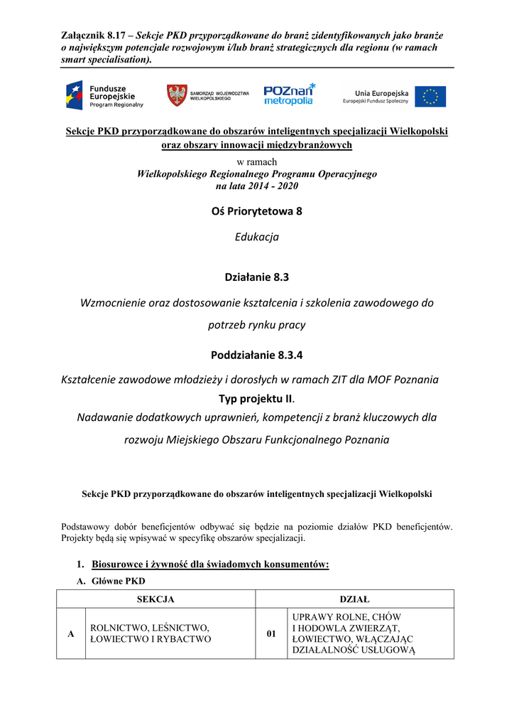 Załącznik 8.17 – Sekcje PKD przyporządkowane do branż zidentyfikowanych jako branże o największym potencjale rozwojowym i/lub branż strategicznych dla regionu (w ramach smart specialisation). Sekcje PKD przyporządkowane do obszarów inteligentnych specjalizacji Wielkopolski oraz obszary innowacji międzybranżowych w ramach Wielkopolskiego Regionalnego Programu Operacyjnego na lata 2014 - 2020 Oś Priorytetowa 8 Edukacja Działanie 8.3 Wzmocnienie oraz dostosowanie kształcenia i szkolenia zawodowego do potrzeb rynku pracy Poddziałanie 8.3.4 Kształcenie zawodowe młodzieży i dorosłych w ramach ZIT dla MOF Poznania Typ projektu II. Nadawanie dodatkowych uprawnień, kompetencji z branż kluczowych dla rozwoju Miejskiego Obszaru Funkcjonalnego Poznania Sekcje PKD przyporządkowane do obszarów inteligentnych specjalizacji Wielkopolski Podstawowy dobór beneficjentów odbywać się będzie na poziomie działów PKD beneficjentów. Projekty będą się wpisywać w specyfikę obszarów specjalizacji. 1. Biosurowce i żywność dla świadomych konsumentów: A. Główne PKD SEKCJA A ROLNICTWO, LEŚNICTWO, ŁOWIECTWO I RYBACTWO DZIAŁ 01 UPRAWY ROLNE, CHÓW I HODOWLA ZWIERZĄT, ŁOWIECTWO, WŁĄCZAJĄC DZIAŁALNOŚĆ USŁUGOWĄ C 10 PRODUKCJA ARTYKUŁÓW SPOŻYWCZYCH 11 PRODUKCJA NAPOJÓW PRZETWÓRSTWO PRZEMYSŁOWE B. Inne PKD dla obszaru, uwzględniane tylko w przypadku, jeśli proponowane rozwiązania służą rozwojowi głównego obszaru specjalizacji: SEKCJA A C E ROLNICTWO, LEŚNICTWO, ŁOWIECTWO I RYBACTWO DZIAŁ 02 LEŚNICTWO I POZYSKIWANIE DREWNA 16 PRODUKCJA WYROBÓW Z DREWNA ORAZ KORKA, Z WYŁĄCZENIEM MEBLI; PRODUKCJA WYROBÓW ZE SŁOMY I MATERIAŁÓW UŻYWANYCH DO WYPLATANIA 17 PRODUKCJA PAPIERU I WYROBÓW Z PAPIERU 22 PRODUKCJA WYROBÓW Z GUMY I TWORZYW SZTUCZNYCH 38 DZIAŁALNOŚĆ ZWIĄZANA ZE ZBIERANIEM, PRZETWARZANIEM I UNIESZKODLIWIANIEM ODPADÓW; ODZYSK SUROWCÓW PRZETWÓRSTWO PRZEMYSŁOWE DOSTAWA WODY; GOSPODAROWANIE ŚCIEKAMI I ODPADAMI ORAZ DZIAŁALNOŚĆ ZWIĄZANA Z REKULTYWACJĄ J INFORMACJA I KOMUNIKACJA 62 DZIAŁALNOŚĆ ZWIĄZANA Z OPROGRAMOWANIEM I DORADZTWEM W ZAKRESIE INFORMATYKI ORAZ DZIAŁALNOŚĆ POWIĄZANA M DZIAŁALNOŚĆ PROFESJONALNA, NAUKOWA I TECHNICZNA 72 BADANIA NAUKOWE I PRACE ROZWOJOWE 2. Wnętrza przyszłości: A. Główne PKD SEKCJA A C ROLNICTWO, LEŚNICTWO, ŁOWIECTWO I RYBACTWO DZIAŁ 02 LEŚNICTWO I POZYSKIWANIE DREWNA 13 PRODUKCJA WYROBÓW TEKSTYLNYCH 16 PRODUKCJA WYROBÓW Z DREWNA ORAZ KORKA, Z WYŁĄCZENIEM MEBLI; PRZETWÓRSTWO PRZEMYSŁOWE PRODUKCJA WYROBÓW ZE SŁOMY I MATERIAŁÓW UŻYWANYCH DO WYPLATANIA 17 PRODUKCJA PAPIERU I WYROBÓW Z PAPIERU 18 POLIGRAFIA I REPRODUKCJA ZAPISANYCH NOŚNIKÓW INFORMACJI 22 PRODUKCJA WYROBÓW Z GUMY I TWORZYW SZTUCZNYCH 25 PRODUKCJA METALOWYCH WYROBÓW GOTOWYCH, Z WYŁĄCZENIEM MASZYN I URZĄDZEŃ 31 PRODUKCJA MEBLI B. Inne PKD dla obszaru, uwzględniane tylko w przypadku, jeśli proponowane rozwiązania służą rozwojowi głównego obszaru specjalizacji: SEKCJA C E J M PRZETWÓRSTWO PRZEMYSŁOWE DOSTAWA WODY; GOSPODAROWANIE ŚCIEKAMI I ODPADAMI ORAZ DZIAŁALNOŚĆ ZWIĄZANA Z REKULTYWACJĄ INFORMACJA I KOMUNIKACJA DZIAŁALNOŚĆ PROFESJONALNA, NAUKOWA I TECHNICZNA DZIAŁ 15 PRODUKCJA SKÓR I WYROBÓW ZE SKÓR WYPRAWIONYCH 23 PRODUKCJA WYROBÓW Z POZOSTAŁYCH MINERALNYCH SUROWCÓW NIEMETALICZNYCH 24 PRODUKCJA METALI 38 DZIAŁALNOŚĆ ZWIĄZANA ZE ZBIERANIEM, PRZETWARZANIEM I UNIESZKODLIWIANIEM ODPADÓW; ODZYSK SUROWCÓW 62 DZIAŁALNOŚĆ ZWIĄZANA Z OPROGRAMOWANIEM I DORADZTWEM W ZAKRESIE INFORMATYKI ORAZ DZIAŁALNOŚĆ POWIĄZANA 71 DZIAŁALNOŚĆ W ZAKRESIE ARCHITEKTURY I INŻYNIERII; BADANIA I ANALIZY TECHNICZNE 72 BADANIA NAUKOWE I PRACE ROZWOJOWE 3. Przemysł jutra: A. Główne PKD SEKCJA C DZIAŁ 24 PRODUKCJA METALI 25 PRODUKCJA METALOWYCH WYROBÓW GOTOWYCH, Z WYŁĄCZENIEM MASZYN I URZĄDZEŃ 27 PRODUKCJA URZĄDZEŃ ELEKTRYCZNYCH 28 PRODUKCJA MASZYN I URZĄDZEŃ, GDZIE INDZIEJ NIESKLASYFIKOWANA 29 PRODUKCJA POJAZDÓW SAMOCHODOWYCH, PRZYCZEP I NACZEP, Z WYŁĄCZENIEM MOTOCYKLI 30 PRODUKCJA POZOSTAŁEGO SPRZĘTU TRANSPORTOWEGO 33 NAPRAWA, KONSERWACJA I INSTALOWANIE MASZYN I URZĄDZEŃ PRZETWÓRSTWO PRZEMYSŁOWE B. Inne PKD dla obszaru, uwzględniane tylko w przypadku, jeśli proponowane rozwiązania służą rozwojowi głównego obszaru specjalizacji: SEKCJA C E DZIAŁ 20 PRODUKCJA CHEMIKALIÓW I WYROBÓW CHEMICZNYCH 22 PRODUKCJA WYROBÓW Z GUMY I TWORZYW SZTUCZNYCH 23 PRODUKCJA WYROBÓW Z POZOSTAŁYCH MINERALNYCH SUROWCÓW NIEMETALICZNYCH 26 PRODUKCJA KOMPUTERÓW, WYROBÓW ELEKTRONICZNYCH I OPTYCZNYCH 38 DZIAŁALNOŚĆ ZWIĄZANA ZE ZBIERANIEM, PRZETWARZANIEM PRZETWÓRSTWO PRZEMYSŁOWE DOSTAWA WODY; GOSPODAROWANIE ŚCIEKAMI J M I ODPADAMI ORAZ DZIAŁALNOŚĆ ZWIĄZANA Z REKULTYWACJĄ I UNIESZKODLIWIANIEM ODPADÓW; ODZYSK SUROWCÓW INFORMACJA I KOMUNIKACJA 62 DZIAŁALNOŚĆ ZWIĄZANA Z OPROGRAMOWANIEM I DORADZTWEM W ZAKRESIE INFORMATYKI ORAZ DZIAŁALNOŚĆ POWIĄZANA 71 DZIAŁALNOŚĆ W ZAKRESIE ARCHITEKTURY I INŻYNIERII; BADANIA I ANALIZY TECHNICZNE 72 BADANIA NAUKOWE I PRACE ROZWOJOWE DZIAŁALNOŚĆ PROFESJONALNA, NAUKOWA I TECHNICZNA 4. Wyspecjalizowane procesy logistyczne: A. Główne PKD SEKCJA H TRANSPORT I GOSPODARKA MAGAZYNOWA DZIAŁ 49 TRANSPORT LĄDOWY ORAZ TRANSPORT RUROCIĄGOWY 50 TRANSPORT WODNY 51 TRANSPORT LOTNICZY 52 MAGAZYNOWANIE I DZIAŁALNOŚĆ USŁUGOWA WSPOMAGAJĄCA TRANSPORT B. Inne PKD dla obszaru, uwzględniane tylko w przypadku, jeśli proponowane rozwiązania służą rozwojowi głównego obszaru specjalizacji: SEKCJA C DZIAŁ 26 PRODUKCJA KOMPUTERÓW, WYROBÓW ELEKTRONICZNYCH I OPTYCZNYCH 27 PRODUKCJA URZĄDZEŃ ELEKTRYCZNYCH 28 PRODUKCJA MASZYN I URZĄDZEŃ, GDZIE INDZIEJ NIESKLASYFIKOWANA 29 PRODUKCJA POJAZDÓW SAMOCHODOWYCH, PRZYCZEP I NACZEP, Z WYŁĄCZENIEM PRZETWÓRSTWO PRZEMYSŁOWE MOTOCYKLI J M INFORMACJA I KOMUNIKACJA DZIAŁALNOŚĆ PROFESJONALNA, NAUKOWA I TECHNICZNA 30 PRODUKCJA POZOSTAŁEGO SPRZĘTU TRANSPORTOWEGO 33 NAPRAWA, KONSERWACJA I INSTALOWAN