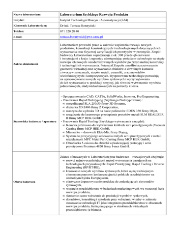 Nazwa laboratorium: Laboratorium Szybkiego Rozwoju Produktu Instytut: Instytut Technologii Maszyn i Automatyzacji (I-24) Kierownik Laboratorium: Dr inŜ. Tomasz Boratyński Telefon: 071 320 28 40 e-mail: [email protected] Zakres działalności Stanowiska badawcze / aparatura Oferta badawcza Laboratorium prowadzi prace w zakresie wspierania rozwoju nowych produktów, konsultacji konstrukcyjnych i technologicznych dotyczących ich wytwarzania oraz fizycznej weryfikacji ich prototypów w przemyśle. Zespół badawczy Laboratorium współpracuje z ok. 300 przedsiębiorstwami i instytucjami z kraju i zagranicy udostępniając posiadane technologie na etapie rozwoju ich nowych i modernizowanych wyrobów po przez analizę konstrukcji i technologii ich wytwarzania. Potencjał Zespołu umoŜliwia przetwarzanie geometrii wirtualnej oraz wytwarzanie obiektów o dowolnym kształcie z tworzyw sztucznych, stopów metali, ceramiki, oraz materiałów wielofunkcyjnych i kompozytowych. Dysponowane technologie pozwalają na opracowywanie nowych wyrobów rynkowych i oprzyrządowania do ich wytwarzania w produkcji seryjnej, jak równieŜ wytwarzanie wyrobów jednostkowych, zindywidualizowanych na potrzeby klienta. - Oprogramowanie CAD: CATIA, SolidWorks, Inventor, Pro/Engeenering. - Pracowania Rapid Prototyping (Szybkiego Prototypowania) : • stereolitograf SLA 250/50 firmy 3D Systems, • drukarka 3D Z406 firmy Z Corporation, • maszyna do wydruku 3D na bazie polimerów EDEN 350 firmy Objet, • urządzenie do laserowego przetapiania proszków metali SLM REALIZER II firmy MCP HEK GmbH. - Pracowania Rapid Tooling (Szybkiego wytwarzania narzędzi): • Komora próŜniowa do wytwarzania krótkich serii prototypowych (Vacuum Casting firmy MCP HEK GmbH, • Mieszarko – dozownik Eldo-Mix firmy Dopag, • System do precyzyjnego odlewania małych serii prototypowych z metali nieŜelaznych MPC Metal Part Casting firmy MCP HEK GmbH, • Obrabiarka 5-osiowa do obróbki wykańczającej prototypy i serie prototypowe Premium 4820 firmy I-mes GmbH. Zakres oferowanych w Laboratorium prac badawczo – rozwojowych obejmuje: • rozwoj najnowocześniejszych metod wytwarzania bazujących na technologiach przyrostowych: Rapid Prototyping, Rapid Tooling i Reverse Engineering (RP/RT/RE), • kreowanie nowych wyrobów rynkowych, które są najwaŜniejszym elementem poprawy konkurencyjności polskich przedsiębiorstw na Jednolitym Rynku Europejskim, • elastyczne dopasowywanie produktu do zmieniających się trendów rynkowych, • wsparcie przedsiębiorstw w badaniach marketingowych we wczesnej fazie rozwoju produktu, • skrócenie czasu wdroŜenia do produkcji wyrobów rynkowych, • doradztwo, konsulting i szkolenia przy wdraŜaniu wiedzy w zakresie stosowania technologii IT jako integratora przedsiębiorstwa w obszarach rozwoju produktu, funkcjonującego w strukturach wirtualnych przedsiębiorstw (e-biznes). Informacje dodatkowe Zespół był uczestnikiem czterech projektów współfinansowanych przez Unię Europejską, z których 3 (Custom-Fit, Eurotooling, Hipermoulding) miały charakter badawczo-rozwojowy i były realizowane w ramach 6 Programu Ramowego, a jeden – w ramach programu Leonardo da Vinci – dotyczący pilotaŜowego wdroŜenia nowego systemu kształcenia zawodowego (VetMan). W laboratoriach Zespołu Rozwoju Nowych Produktów realizowane są zlecenia w zakresie prac badawczo - rozwojowo – wdroŜeniowych. Wśród zlecających i współpracujących nad rozwojem nowych produktów firm były m.in.: ABB, APATOR, DeLaval, Elda-Eltra, Fagor – MasterCook, General Electic, Intel, Philips, Polfa, Spamel, Wabco, Whirpool i wiele innych.