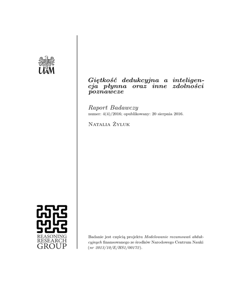 Giętkość dedukcyjna a inteligencja płynna oraz inne zdolności poznawcze Raport Badawczy numer: 4(4)/2016; opublikowany: 20 sierpnia 2016. Natalia Żyluk Badanie jest częścią projektu Modelowanie rozumowań abdukcyjnych finansowanego ze środków Narodowego Centrum Nauki (nr 2013/10/E/HS1/00172 ). Spis treści 1 Wprowadzenie 1.1 Giętkość dedukcyjna . . . . . . . . . . . . . . . . 1.2 Giętkość dedukcyjna a inteligencja płynna . . . . 1.3 Giętkość dedukcyjna a inne zdolności poznawcze 1.3.1 Potrzeba poznawczego domknięcia . . . . 1.3.2 Styl epistemiczny . . . . . . . . . . . . . . . . . . . . . . . . . . . . . . . . . . . . . . . . . . . . . . . . . . . . . . . . . . . . . . . . . . . . . . . . . . . . . . . . . . . . . . . . . 3 3 4 5 5 5 2 Metoda 2.1 Grupa badana . . . . . . . . . . . . . . . . . . . . . 2.2 Narzędzia . . . . . . . . . . . . . . . . . . . . . . . 2.2.1 Test Matryc Progresywnych Ravena . . . . 2.2.2 Test Giętkości Dedukcyjnej . . . . . . . . . 2.2.3 Skala Potrzeby Poznawczego Domknięcia . 2.2.4 Standardized Epistemological Understanding 2.3 Procedura badania . . . . . . . . . . . . . . . . . . . . . . . . . . . . . . . . . . . . . . . . . . . . . . . . . . . . . Assessment . . . . . . . . . . . . . . . . . . . . . . . . . . . . . . . . . . . . . . . . . . . . . . . . . . . . . . . . 7 7 7 7 8 9 10 10 3 Wyniki 3.1 Statystyki opisowe . . . . . 3.2 Analiza trudności . . . . . . 3.3 Analiza rzetelności . . . . . 3.4 Wyniki analiz korelacyjnych . . . . . . . . . . . . . . . . . . . . . . . . . . . . . . . . 11 11 12 14 15 . . . . . . . . . . . . . . . . . . . . . . . . . . . . . . . . . . . . . . . . . . . . . . . . . . . . . . . . . . . . . . . . . . . . . . . . . . . . 4 Dyskusja wyników 18 4.1 Analiza rzetelności . . . . . . . . . . . . . . . . . . . . . . . . . . . . . . . . 18 4.2 Analiza korelacyjna . . . . . . . . . . . . . . . . . . . . . . . . . . . . . . . . 18 Raport 4(4) 2 1 Wprowadzenie Treścią niniejszego raportu jest opis badań nad związkami pomiędzy biegłością w zakresie trudnych rozumowań dedukcyjnych a inteligencja płynną oraz innymi charakterystykami poznawczymi jednostki (poziom potrzeby poznawczego domknięcia, styl epistemiczny). Wedle modelu inteligencji Catella-Horna-Carolla (modelu CHC) [Flanagan, 2008; Schneider i McGrew, 2012], umiejętność rozumowania dedukcyjnego – obok rozumowania indukcyjnego oraz ilościowego – uznawana jest za jedną z trzech zdolności składających się na komponent płynny inteligencji ogólnej. Bazując na owym modelu, jak również uwzględniając wyniki wcześniejszych badań nad związkami pomiędzy zdolnościami dedukcyjnymi a inteligencją płynną, jako główny cel analiz opisanych w niniejszym raporcie przyjęto sprawdzenie, czy istnieją statystycznie istotne związki pomiędzy zdolnościami poznawczymi, których wskaźnikiem są wyniki Testu Matryc Progresywnych Ravena [Raven, Raven i Court, 2011] a poziomem wykonania trudnych zadań dedukcyjnych, składających się na Test Giętkości Dedukcyjnej [Żyluk, 2016]. Jako że rozwiązywanie testu wybranego do pomiaru umiejętności dedukcyjnych może dodatkowo angażować określone zdolności o charakterze metapoznawczym, do badania postanowiono włączyć pomiar wspomnianych dodatkowych zmiennych: poziomu potrzeby poznawczego domknięcia oraz posiadanego stylu epistemicznego. 1.1 Giętkość dedukcyjna Giętkość dedukcyjna może być scharakteryzowana jako zdolność poznawcza manifestująca się, między innymi, w umiejętności wskazywania różnych zestawów przesłanek, z których wynikałby zadany wniosek [Żyluk, 2016]. Nazwa badanej zmiennej ukuta została w oparciu o funkcjonujące w psychologii pojęcie giętkości poznawczej. Giętkość poznawczą najogólniej opisać można jako zdolność do przełączania pomiędzy myśleniem o odmiennych pojęciach oraz do myślenia o dwóch pojęciach jednocześnie [Scott, 1962]. Uznano, że sprawność w zakresie znajdowania zestawów przesłanek, z których logicznie wynikałby określony wniosek jest rodzajem specyficznie rozumianej „giętkości” – wymaga ona bowiem poznawczego przełączania między różnymi, potencjalnymi kandydatami na zestaw przesłanek oraz jednoczesnego myślenia o tych zestawach (lub inaczej: jednoczesnego przetwarzania informacji na ich temat). Zważywszy na charakter związku pomiędzy zdaniami, z których wyprowadzany miałby być wniosek ustalony w zadaniu, przyjęto, że owa giętkość nazwana zostać może dedukcyjną. Choć wspomniana umiejętność wskazywania poprawnych zestawów przesłanek jest najbardziej bezpośrednim (najbardziej widocznym, a przez to najłatwiej podlegającym pomiarowi) przejawem zdolności, jaką jest giętkość dedukcyjna, nie zakłada się, że jest to jedyna owej zdolności manifestacja (stąd też „między innymi” na początku akapitu). Z szerszej perspektywy, pomiar giętkość dedukcyjnej może być widziany jako pomiar specyficznego typu zdolności rozumowania dedukcyjnego. Biorąc pod uwagę rozróżnienie na łatwe i trudne rozumowania dedukcyjne [Urbański, Paluszkiewicz i Urbańska, 2014], test mierzący giętkość dedukcyjną – Test Giętkości Dedukcyjnej (opisany w części „Metoda”) należałoby uznać za test trudnych rozumowań dedukcyjnych. Dystynkcja „trudna” Raport 4(4) 3 versus „łatwa” dedukcja nie jest w żadnym wypadku ostra – bazuje ona bowiem na dość intuicyjnym założeniu, że pewne rodzaje zadań dedukcyjnych, z uwagi np. na większą liczbę procesów, jakie muszą zostać zaangażowane w celu poprawnego ich rozwiązania, sprawiają badanym więcej trudności aniżeli klasyczne, oparte na wykorzystaniu prostych sylogizmów, zadania dedukcyjne. Do testów mierzących proste rozumowania dedukcyjne zaliczyć można Test Rozumowań Dedukcyjnych (zbudowany przy wykorzystaniu właśnie klasycznych sylogizmów), natomiast do testów pozwalających na pomiar