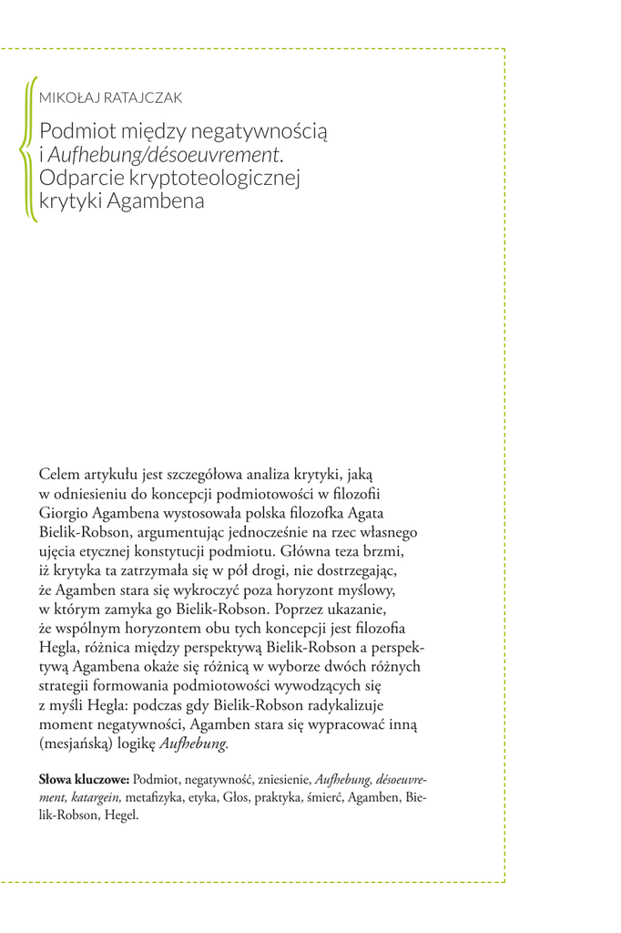 } Mikołaj Ratajczak Podmiot między negatywnością i Aufhebung/désoeuvrement. Odparcie kryptoteologicznej krytyki Agambena Celem artykułu jest szczegółowa analiza krytyki, jaką w odniesieniu do koncepcji podmiotowości w filozofii Giorgio Agambena wystosowała polska filozofka Agata Bielik-Robson, argumentując jednocześnie na rzec własnego ujęcia etycznej konstytucji podmiotu. Główna teza brzmi, iż krytyka ta zatrzymała się w pół drogi, nie dostrzegając, że Agamben stara się wykroczyć poza horyzont myślowy, w którym zamyka go Bielik-Robson. Poprzez ukazanie, że wspólnym horyzontem obu tych koncepcji jest filozofia Hegla, różnica między perspektywą Bielik-Robson a perspektywą Agambena okaże się różnicą w wyborze dwóch różnych strategii formowania podmiotowości wywodzących się z myśli Hegla: podczas gdy Bielik-Robson radykalizuje moment negatywności, Agamben stara się wypracować inną (mesjańską) logikę Aufhebung. Słowa kluczowe: Podmiot, negatywność, zniesienie, Aufhebung, désoeuvrement, katargein, metafizyka, etyka, Głos, praktyka, śmierć, Agamben, Bielik-Robson, Hegel. anzpraktyka cyteroet 2(8)/2013 348 Przedmiotem poniższego tekstu jest krytyka filozofii Agambena, którą z wypracowanej przez siebie perspektywy kryptoteologicznej przeprowadziła w ksiaążce Na pustyni: kryptoteologie późnej nowoczesności Agata Bielik-Robson. Krytyka ta polega przede wszystkim na zaliczeniu Agambena do tanatologicznej czy też tanatocentrycznej linii filozofii „późnej nowoczesności”, wraz z takimi autorami jak Blanchot, de Man, Derrida czy Lacan. Filozofowie ci, a Agamben wraz z nimi, ponieśli według Bielik-Robson porażkę w konfrontacji ze śmiercią, kapitulując przed ową „potworną mocą negatywności”. Efektem tej kapitulacji jest rozwijana przez nich wizja podmiotowości, którą przenika owa śmiertelna negatywność i która tylko w tym swego rodzaju tanatycznym weryzmie (każącym podmiotowi nieustannie doświadczać prawdy swojej śmiertelności patrząc na własną śmierć i zanikanie, w piśmie lub języku) staje się autentycznym podmiotem. Postaram się pokazać, że interpretacja Agambena, którą znaleźć możemy w Na pustyni, wpisująca go w ten sposób myślenia o życiu i podmiotowości (jako bez reszty wydanych na antropogenetyczną moc śmierci) zatrzymuje się w pewnym sensie w pół drogi, nie dostrzegając celu jego filozofii – wyjścia poza myślenie podmiotu jako bytu z istoty śmiertelnego (a także z istoty mówiącego). Skoro jednak Agamben krytykuje obecną w, ogólnie rzecz biorąc, poheglowskiej czy też postheglowskiej linii filozoficznej rolę i funkcję śmierci w myśleniu o podmiocie i podmiotowym życiu, to przynajmniej na poziomie punktu wyjścia jego myśl powinna okazać się bliska projektowi kryptoteologicznemu. W rzeczywistości perspektywy Agambena i Bielik-Robson różnią się dość znacząco, jednak obie posiadają jeden wspólny mianownik, a jest nim filozofia Hegla1. Dlaczego Hegel? Po pierwsze, to właśnie Hegel w sposób systematyczny (czytaj: dialektyczny) rozwinął centralny moment śmierci, teoretycznie eksplikowanej za pomocą pojęcia negatywności, jako antropogenetycznej traumy i źródła podmiotowości ustanawiającej różnicę między sobą i naturą. Po drugie, 1 Dziękuję recenzentowi tego tekstu za niezwykle trafną uwagę, że tym wspólnym mianownikiem jest nie tyle filozofia Hegla, ile jej interpretacja przeprowadzona przez Alexandre’a Kojève’a, zob. A. Kojève, Wstęp do wykładów o Heglu, tłum. Ś.F. Nowiski, Warszawa 1999. W rzeczy samej, różnice pojęciowe, którymi operuje się w tym tekście (np. różnica między doświadczeniem negatywności a aktem zniesienia jako procedurami upodmiotowienia) mogą być stosowane w tak mało dialektyczny sposób tylko na drodze zaakceptowania w punkcie wyjścia perspektywy Kojève’a. Być może jednak próba radykalizacji, czy wręcz przekroczenia kojève’iańskiej linii myślenia o filozofii Hegla, z którą mamy do czynienia w wypadku Agambena (a także, w innym sensie, u Bielik-Robson), jest koniecznym krokiem na drodze powrotu do źródłowych intuicji Heglowskiej dialektyki. Mikołaj Ratajczak 349 anzpraktyka cyteroet 2(8)/2013 konstytutywne dla heglizmu jest założenie, że negatywność podmiotowości da się przedstawić jako element i moment systemu dzięki logice pojęcia – założenie, któremu zarówno perspektywa Agambena, jak i kryptoteologia radykalnie się przeciwstawiają. I po trzecie wreszcie, powód wspólny dla Agambena, Bielik-Robson i dla większości nieanalitycznych koncepcji filozoficznych drugiej połowy dwudziestego wieku: Hegel wypracował perspektywę, dzięki której był w stanie podsumować i odnieść do siebie najważniejsze filozoficzne koncepcje podmiotowości (od stoików po sceptyków, od Kartezjusza po Spinozę, od Hume’a po Kanta, od Fichtego po romantyzm jenajski), wpisać je w swój system oraz wypracować pojęcie podmiotu, które łączy w sobie różne momenty w jeden dialektyczny ruch wyznaczania swojego zewnętrza, określania swojej odrębności i autonomii oraz znoszenia tej różnicy na drodze negacji określonej i tym samym powrotu do siebie. Właśnie dzięki temu, że Hegel pomyślał podmiot przede wszystkim jako negatywność i jako ruch, łącząc jednocześnie moment autonomii i reapropriacji, różnicy i tożsamości, jednostkowości i zniesienia jednostkowości w totalności, możliwy jest dzisiaj tak zróżnicowany powrót, krytyczny i afirmatywny, do Hegla i nieustanne przepracowywanie jego systemu2. Należy też się zastanowić, czy jesteśmy dziś w stanie w ogóle pomyśleć ideę podmiotu bez odniesienia do Heglowskiej filozofii. Obecność Hegla w licznych współczesnych dyskursach filozoficznych polega często na opracowaniu niektórych z momentów konstytucji heglowskiego podmiotu (a raczej „ducha”, czyli połączenia s