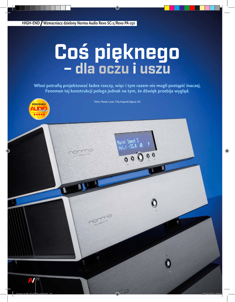 TESTY SPRZĘTU xxxxxxx dzielony Norma Audio Revo SC-2/Revo PA-150 HIGH-END Wzmacniacz Coś pięknego – dla oczu i uszu Włosi potrafią projektować ładne rzeczy, więc i tym razem nie mogli postąpić inaczej. Fenomen tej konstrukcji polega jednak na tym, że dźwięk przebija wygląd. Tekst: Marek Lacki, Filip Kulpa Zdjęcia: AV 72 Norma Audio SC-2&PA-150.indd 72 28.04.2016 08:25 N orma Audio to marka słabo znana w Polsce, pojawiła się u nas niedawno. Na przełomie roku mieliśmy już okazję zapoznać się ze wzmacniaczem zintegrowanym tej marki, który okazał się urządzeniem zupełnie nieprzeciętnym. Siedziba firmy prowadzonej przez Alessandro Lugli mieści się w Cremonie – stolicy słynnych włoskich lutników, znanej wszystkim audiofilom z innej włoskiej marki audio Sonus Faber. W obecnej formie Norma Audio Electronics istnieje od 1997 roku, jednak jej historia jest o 10 lat dłuższa. W ofercie znajduje się elektronika: jeden odtwarzacz, przetwornik c/a, wzmacniacz zintegrowany oraz przedwzmacniacz, który można połączyć ze stereofoniczną końcówką mocy lub monoblokami. W teście znalazł się wariant z końcówką stereofoniczną. Na marginesie oferty znajdują się także modułowe stoliki pod sprzęt. -110 dB. W trybie pasywnym skala kończy się na 0 dB, a zaczyna przy -127,5 dB. Podczas przełączania pomiędzy trybami następuje automatyczne wyrównanie poziomu i przeskakuje on o 17,5 dB w jedną lub drugą stronę, dzięki czemu głośność jest ustalona nadal na tym samym poziomie co przed zmianą. Z poziomu menu, dostępnego także z pilota, można zarządzać wieloma innymi ustawieniami, w tym także konfigurować wbudowany opcjonalny DAC, zmieniając np. wykorzystywany zegar na ten podawany z sygnałem lub oscylator wewnętrzny. Generalnie sposób poruszania się po menu jest bardzo mało intuicyjny. Mało czytelny jest też pilot, który w dodatku wyraźnie odstaje pod względem jakości wykonania od wzmacniacza. Elegancki pilot aluminiowy dostępny jest opcjonalnie – niestety, sporo kosztuje (1690 zł). PRZEDWZMACNIACZ REVO SC-2 FUNKCJONALNOŚĆ I WYGLĄD Aluminiowe obudowy są bardzo ładne, wystylizowane minimalistycznie, znakomicie wykonane. Ich boczne ścianki zwężają się ku tyłowi. Widać tu wielką dbałość o detale. Jak na wzmacniacz dzielony za mniej niż 50 tys. zł, propozycja Normy jest subtelna – wzmacniacz jest znacznie mniejszy niż wiele innych konstrukcji w zbliżonej cenie. Końcówka mocy Revo PA 150 ma na czołówce tylko wyłącznik (przełącza pomiędzy trybem czuwania i pracy) i diodę sygnalizacyjną w kolorze niebieskim (swoją intensywnością świecenia informuje, czy wzmacniacz pracuje, czy jest uśpiony). Właściwy wyłącznik znalazł się na tylnej ściance, gdzie są dwa rodzaje wejść analogowych: XLR i RCA. Wyboru dokonuje się umieszczonym obok hebelkiem. Gniazdo prądowe umieszczono dokładnie pośrodku, co sugeruje idealną symetrię całego wzmacniacza. Gniazda głośnikowe są pojedyncze. Przedwzmacniacz ma dwie pary wejść XLR oraz trzy wejścia liniowe RCA. Prócz tego jest też para gniazd phono do podłączenia gramofonu. Wyjście przedwzmacniacza jest zdublowane (RCA/XLR). Na przedniej ściance nie ma pokręteł, jest za to pięć niewielkich guzików. Środkowy ma podwójną funkcję: wciśnięty raz uruchamia menu wyświetlane na ekranie umieszczonym na środku, świecącym na niebiesko (jest przez to mało czytelny). Wciśnięcie i przytrzymanie przycisku powoduje przejście do trybu czuwania. Dwa prawe guziki służą do regulacji głośności. Jej wartość prezentowana jest w skali decybelowej – jednej z dwóch. Wynika to z tego, że dostępne są dwa tryby pracy przedwzmacniacza. W aktywnym skala kończy się na +17,5 dB, a zaczyna przy Testowana niedawno integra uhonorowana przez nas tytułem „Najlepszego wzmacniacza zintegrowanego high-end 2016 roku” przygotowała nas na wspaniały widok wnętrz obydwu urządzeń. Zacznijmy od przedwzmacniacza. Mamy do czynienia z bardzo uporządkowaną i schludną konstrukcją (składającą się z kilku płytek-bloków funkcjonalnych), która umożliwia łatwe dodawanie opcjonalnych modułów. Trzon stanowi sekcja analogowa znajdująca się wraz z zasilaczem po lewej stronie. Zajmuje ona dwie umieszczone piętrowo płytki drukowane – na górze jest kanał prawy. Ta część układu jest owiana nutką tajemnicy – Alessandro Lugli nie podaje na jego temat praktycznie żadnych informacji, a powiedzieć cokolwiek na podstawie oględzin jest trudno, bo układ maskują trzy puszki ekranujące. Wiadomo trzy rzeczy. Po pierwsze, ma bardzo szerokie pasmo przenoszenia (2 MHz), po drugie – jak już wspomniałem – może pracować w dwóch trybach: jako układ aktywny o wzmocnieniu napięciowym 17,5 dB lub jako pasywka, czyli bez wzmocnienia (0 dB). Producent nie sugeruje, który z trybów jest lepszy, bo w zasadzie… nie można tego z góry określić. Pasywka, jak wiadomo, ma liczne ograniczenia i problemy, ale też jedną zaletę – krótszy tor sygnałowy i brak degradujących dźwięk elementów aktywnych. Wymaga jednak stosowania możliwie krótkich kabli połączeniowych i źródeł liniowych o dużym poziomie sygnału wejściowego (znakomita większość przedwzmacniaczy phono odpada). Z wierzchu widać jedynie wzmacniacze operacyjne INA134PA jedną z płytek (mono) opcjonalnego modułu phono MM/MC, wykorzystujące po dwa scalaki OPA604AP. Zmiany ustawień wejścia phono dokonuje się mikroprzełącznikami umieszczonymi na tej płytce. Nie jest to zbyt wygodne rozwiązanie, ale technicznie najlepsze z możliwych. Reszta układu, tj. właściwy tor liniowy, jest w całości dyskretny. W SC-2 zastosowano sterowaną cyfrowo, lecz analogową co do zasady działania, regulację głośności (P.D.D.A. – Programmable Digital Analogue Attenuation). Zapewnia ona bardzo duży zakres regulacji (127 dB) przy olbrzymiej precyzji zrównoważenia