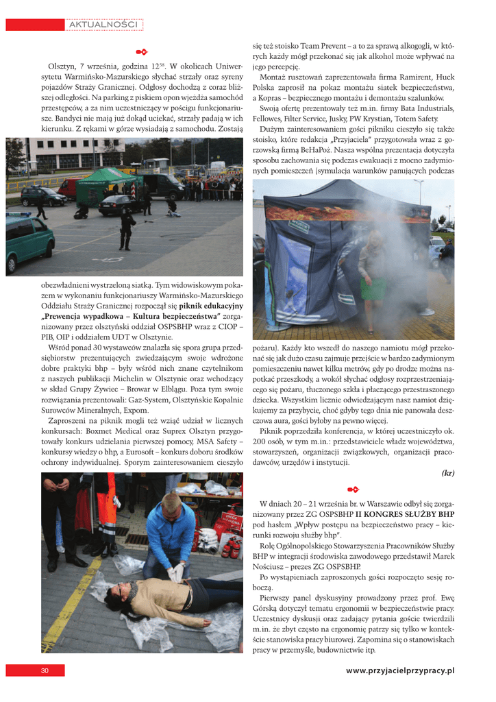 DNWXDOQRĂFL 2 Olsztyn, 7 września, godzina 1258. W okolicach Uniwersytetu Warmińsko-Mazurskiego słychać strzały oraz syreny pojazdów Straży Granicznej. Odgłosy dochodzą zcoraz bliższej odległości. Na parking zpiskiem opon wjeżdża samochód przestępców, aza nim uczestniczący wpościgu funkcjonariusze. Bandyci nie mają już dokąd uciekać, strzały padają wich kierunku. Zrękami wgórze wysiadają zsamochodu. Zostają obezwładnieni wystrzeloną siatką. Tym widowiskowym pokazem wwykonaniu funkcjonariuszy Warmińsko-Mazurskiego Oddziału Straży Granicznej rozpoczął się piknik edukacyjny „Prewencja wypadkowa – Kultura bezpieczeństwa” zorganizowany przez olsztyński oddział OSPSBHP wraz zCIOP – PIB, OIP ioddziałem UDT wOlsztynie. Wśród ponad 30 wystawców znalazła się spora grupa przedsiębiorstw prezentujących zwiedzającym swoje wdrożone dobre praktyki bhp – były wśród nich znane czytelnikom z naszych publikacji Michelin w Olsztynie oraz wchodzący w skład Grupy Żywiec – Browar w Elblągu. Poza tym swoje rozwiązania prezentowali: Gaz-System, Olsztyńskie Kopalnie Surowców Mineralnych, Expom. Zaproszeni na piknik mogli też wziąć udział w licznych konkursach: Boxmet Medical oraz Suprex Olsztyn przygotowały konkurs udzielania pierwszej pomocy, MSA Safety – konkursy wiedzy obhp, aEurosoft – konkurs doboru środków ochrony indywidualnej. Sporym zainteresowaniem cieszyło się też stoisko Team Prevent – ato za sprawą alkogogli, wktórych każdy mógł przekonać się jak alkohol może wpływać na jego percepcję. Montaż rusztowań zaprezentowała firma Ramirent, Huck Polska zaprosił na pokaz montażu siatek bezpieczeństwa, aKopras – bezpiecznego montażu idemontażu szalunków. Swoją ofertę prezentowały też m.in. firmy Bata Industrials, Fellowes, Filter Service, Jusky, PW Krystian, Totem Safety. Dużym zainteresowaniem gości pikniku cieszyło się także stoisko, które redakcja „Przyjaciela” przygotowała wraz z gorzowską firmą BeHaPoż. Nasza wspólna prezentacja dotyczyła sposobu zachowania się podczas ewakuacji zmocno zadymionych pomieszczeń (symulacja warunków panujących podczas pożaru). Każdy kto wszedł do naszego namiotu mógł przekonać się jak dużo czasu zajmuje przejście wbardzo zadymionym pomieszczeniu nawet kilku metrów, gdy po drodze można napotkać przeszkody, awokół słychać odgłosy rozprzestrzeniającego się pożaru, tłuczonego szkła ipłaczącego przestraszonego dziecka. Wszystkim licznie odwiedzającym nasz namiot dziękujemy za przybycie, choć gdyby tego dnia nie panowała deszczowa aura, gości byłoby na pewno więcej. Piknik poprzedziła konferencja, wktórej uczestniczyło ok. 200 osób, wtym m.in.: przedstawiciele władz województwa, stowarzyszeń, organizacji związkowych, organizacji pracodawców, urzędów iinstytucji. (kr) 2 Wdniach 20 – 21 września br. wWarszawie odbył się zorganizowany przez ZG OSPSBHP II KONGRES SŁUŻBY BHP pod hasłem „Wpływ postępu na bezpieczeństwo pracy – kierunki rozwoju służby bhp”. Rolę Ogólnopolskiego Stowarzyszenia Pracowników Służby BHP wintegracji środowiska zawodowego przedstawił Marek Nościusz – prezes ZG OSPSBHP. Po wystąpieniach zaproszonych gości rozpoczęto sesję roboczą. Pierwszy panel dyskusyjny prowadzony przez prof. Ewę Górską dotyczył tematu ergonomii wbezpieczeństwie pracy. Uczestnicy dyskusji oraz zadający pytania goście twierdzili m.in. że zbyt często na ergonomię patrzy się tylko wkontekście stanowiska pracy biurowej. Zapomina się ostanowiskach pracy wprzemyśle, budownictwie itp. 30 www.przyjacielprzypracy.pl