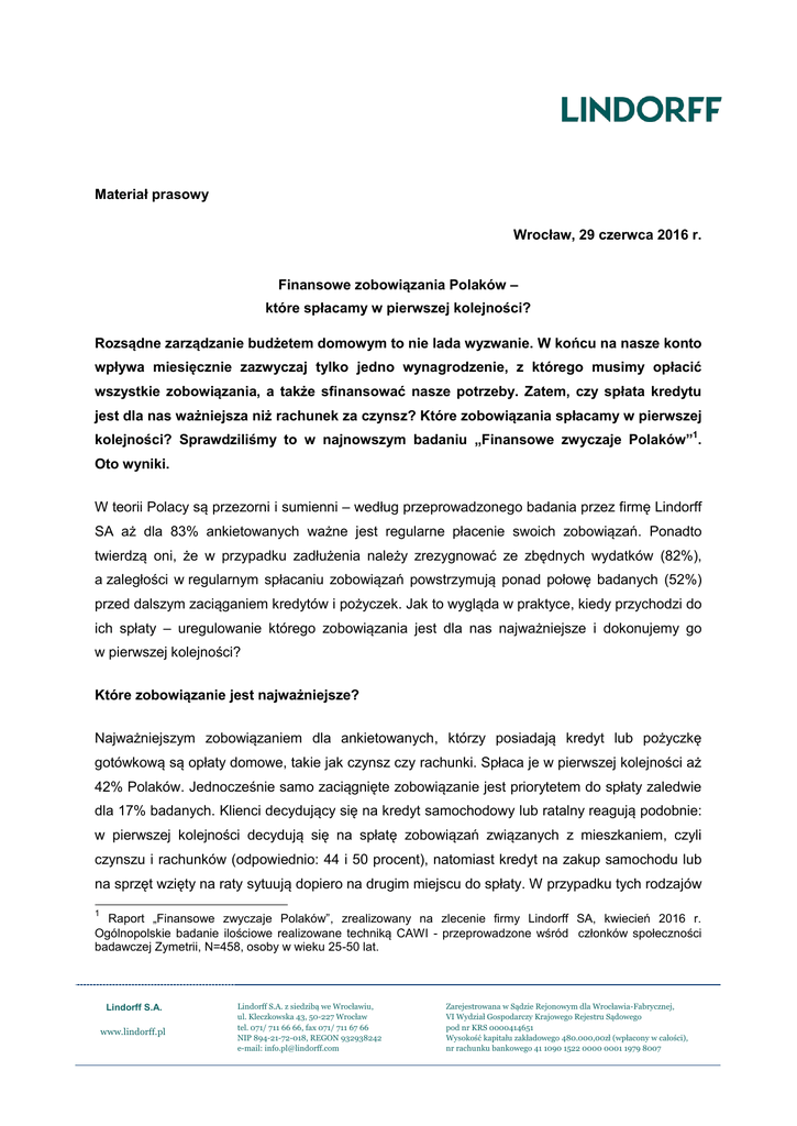 Materiał prasowy Wrocław, 29 czerwca 2016 r. Finansowe zobowiązania Polaków – które spłacamy w pierwszej kolejności? Rozsądne zarządzanie budżetem domowym to nie lada wyzwanie. W końcu na nasze konto wpływa miesięcznie zazwyczaj tylko jedno wynagrodzenie, z którego musimy opłacić wszystkie zobowiązania, a także sfinansować nasze potrzeby. Zatem, czy spłata kredytu jest dla nas ważniejsza niż rachunek za czynsz? Które zobowiązania spłacamy w pierwszej kolejności? Sprawdziliśmy to w najnowszym badaniu „Finansowe zwyczaje Polaków”1. Oto wyniki. W teorii Polacy są przezorni i sumienni – według przeprowadzonego badania przez firmę Lindorff SA aż dla 83% ankietowanych ważne jest regularne płacenie swoich zobowiązań. Ponadto twierdzą oni, że w przypadku zadłużenia należy zrezygnować ze zbędnych wydatków (82%), a zaległości w regularnym spłacaniu zobowiązań powstrzymują ponad połowę badanych (52%) przed dalszym zaciąganiem kredytów i pożyczek. Jak to wygląda w praktyce, kiedy przychodzi do ich spłaty – uregulowanie którego zobowiązania jest dla nas najważniejsze i dokonujemy go w pierwszej kolejności? Które zobowiązanie jest najważniejsze? Najważniejszym zobowiązaniem dla ankietowanych, którzy posiadają kredyt lub pożyczkę gotówkową są opłaty domowe, takie jak czynsz czy rachunki. Spłaca je w pierwszej kolejności aż 42% Polaków. Jednocześnie samo zaciągnięte zobowiązanie jest priorytetem do spłaty zaledwie dla 17% badanych. Klienci decydujący się na kredyt samochodowy lub ratalny reagują podobnie: w pierwszej kolejności decydują się na spłatę zobowiązań związanych z mieszkaniem, czyli czynszu i rachunków (odpowiednio: 44 i 50 procent), natomiast kredyt na zakup samochodu lub na sprzęt wzięty na raty sytuują dopiero na drugim miejscu do spłaty. W przypadku tych rodzajów 1 Raport „Finansowe zwyczaje Polaków”, zrealizowany na zlecenie firmy Lindorff SA, kwiecień 2016 r. Ogólnopolskie badanie ilościowe realizowane techniką CAWI - przeprowadzone wśród członków społeczności badawczej Zymetrii, N=458, osoby w wieku 25-50 lat. Lindorff S.A. www.lindorff.pl Lindorff S.A. z siedzibą we Wrocławiu, ul. Kleczkowska 43, 50-227 Wrocław tel. 071/ 711 66 66, fax 071/ 711 67 66 NIP 894-21-72-018, REGON 932938242 e-mail: [email protected] Zarejestrowana w Sądzie Rejonowym dla Wrocławia-Fabrycznej, VI Wydział Gospodarczy Krajowego Rejestru Sądowego pod nr KRS 0000414651 Wysokość kapitału zakładowego 480.000,00zł (wpłacony w całości), nr rachunku bankowego 41 1090 1522 0000 0001 1979 8007 kredytu tylko 19% badanych mających samochód na kredyt i 14% kupujących sprzęt na raty wskazuje na ich pierwszeństwo w spłacie zobowiązań. Kredyt na samochód Opłaty domowe (czynsz, rachunki) 44% Kredyt samochodowy 19% Zakupy na raty 8% Karta kredytowa Opłaty związane z hobby / edukacją 4% 0% Raty leasingu trudno powiedzieć 9% 1% Polacy w pierwszej kolejności spłacają te zobowiązania, których nieuregulowanie może utrudnić codzienne funkcjonowanie, jak np. odłączenie prądu, zablokowanie usług telekomunikacyjnych. Spłata posiadanych kredytów i pożyczek jest priorytetem dla zaledwie kilkunastu procent ankietowanych. Za nieuregulowane raty kredytu gotówkowego czy samochodowego nie grożą natychmiastowe konsekwencje i to sprawia, że Polacy chętniej odsuwają ich płatność na dalszy plan w domowym budżecie. Jednocześnie każde inne dobro postrzegane jest w społecznym odbiorze jako mniej wartościowe niż mieszkanie i stąd priorytet spłat rachunków związanych z jego eksploatacją. Sytuacja zmienia się diametralnie, jeśli pod lupę weźmiemy osoby z kredytem hipotecznym… Lindorff S.A. www.lindorff.pl Lindorff S.A. z siedzibą we Wrocławiu, ul. Kleczkowska 43, 50-227 Wrocław tel. 071/ 711 66 66, fax 071/ 711 67 66 NIP 894-21-72-018, REGON 932938242 e-mail: [email protected] Zarejestrowana w Sądzie Rejonowym dla Wrocławia-Fabrycznej, VI Wydział Gospodarczy Krajowego Rejestru Sądowego pod nr KRS 0000414651 Wysokość kapitału zakładowego 480.000,00zł (wpłacony w całości), nr rachunku bankowego 41 1090 1522 0000 0001 1979 8007 Mieszkanie najcenniejsze? Zdecydowana większość badanych, która jest posiadaczem kredytu hipotecznego, w pierwszej kolejności spłaca właśnie to zobowiązanie – taką odpowiedź wskazało aż 74% z nich. Tylko 14% przyznało, że przed spłatą rat kredytu mieszkaniowego najpierw regulują opłaty domowe, czyli czynsz i rachunki. Co trzeci badany przyznający się do priorytetu w spłacie rat hipotecznych w badaniach Lindorff SA potwierdza ogólny trend obserwowany od lat w Polsce. Dla Polaków najważniejszym dobrem jest posiadanie własnego mieszkania czy domu. Polacy wolą zaciągnąć zobowiązanie i wybrać finansowanie własnego domu jako formę inwestycji w przyszłość niż ponosić koszty związane z wynajmowaniem mieszkania. Na taki obrót sytuacji moją zapewne wpływ także takie czynniki jak: rosnące zarobki, dofinansowanie w ramach MdM czy utrzymujący się w Polsce silny głód mieszkaniowy. W naszym kraju nadal na jedno mieszkanie przypada większa liczba mieszkańców niż w krajach Europy Zachodniej, a posiadanie własnego „M” lub przynajmniej zdolności kredytowej do zaciągnięcia kredytu hipotecznego jest symbolem statusu majątkowego. Kredyt hipoteczny Opłaty domowe (czynsz, rachunki) 14% Kredyt hipoteczny 74% Zakupy na raty 1% Karta kredytowa 1% Opłaty związane z hobby / edukacją Raty leasingu inne Lindorff S.A. www.lindorff.pl 6% 0% 2% trudno powiedzieć 0% nie mam żadnych zobowiązań 0% Lindorff S.A. z siedzibą we Wrocławiu, ul. Kleczkowska 43, 50-227 Wrocław tel. 071/ 711 66 66, fax 071/ 711 67 66 NIP 894-21-72-018, REGON 932938242 e-mail: [email protected] Zarejestrowana w Sądzie Rejonowym dla Wrocławia-Fabrycznej, VI Wydział Gospodarczy Krajowego Rejestru Sądowego pod nr KR