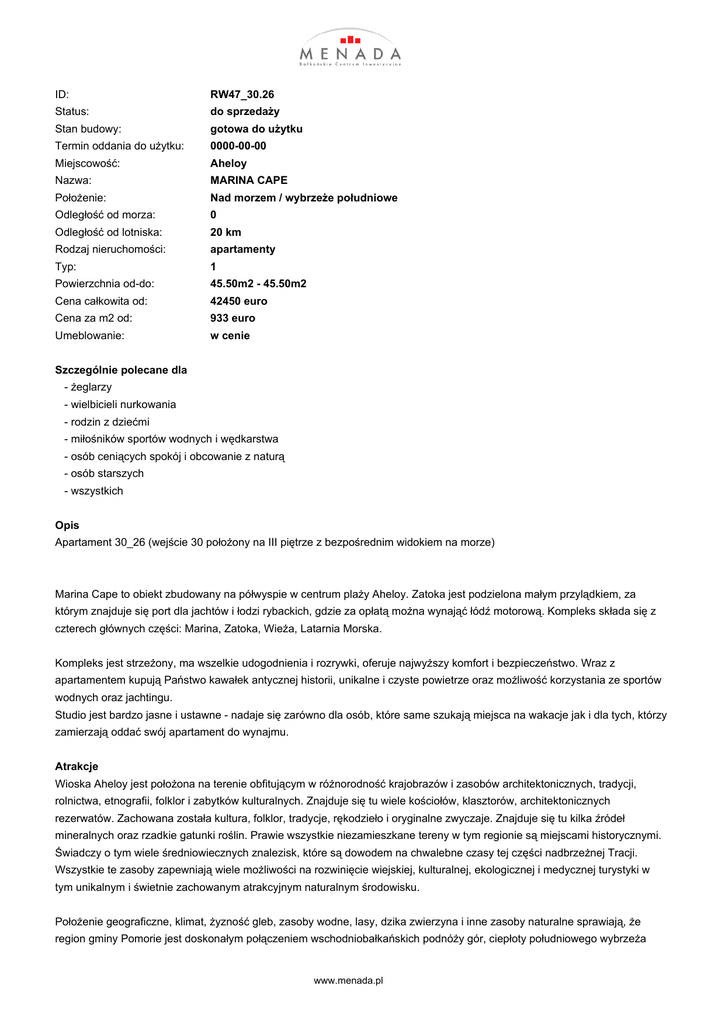 ID: RW47_30.26 Status: do sprzedaży Stan budowy: gotowa do użytku Termin oddania do użytku: 0000-00-00 Miejscowość: Aheloy Nazwa: MARINA CAPE Położenie: Nad morzem / wybrzeże południowe Odległość od morza: 0 Odległość od lotniska: 20 km Rodzaj nieruchomości: apartamenty Typ: 1 Powierzchnia od-do: 45.50m2 - 45.50m2 Cena całkowita od: 42450 euro Cena za m2 od: 933 euro Umeblowanie: w cenie Szczególnie polecane dla - żeglarzy - wielbicieli nurkowania - rodzin z dziećmi - miłośników sportów wodnych i wędkarstwa - osób ceniących spokój i obcowanie z naturą - osób starszych - wszystkich Opis Apartament 30_26 (wejście 30 położony na III piętrze z bezpośrednim widokiem na morze) Marina Cape to obiekt zbudowany na półwyspie w centrum plaży Aheloy. Zatoka jest podzielona małym przylądkiem, za którym znajduje się port dla jachtów i łodzi rybackich, gdzie za opłatą można wynająć łódź motorową. Kompleks składa się z czterech głównych części: Marina, Zatoka, Wieża, Latarnia Morska. Kompleks jest strzeżony, ma wszelkie udogodnienia i rozrywki, oferuje najwyższy komfort i bezpieczeństwo. Wraz z apartamentem kupują Państwo kawałek antycznej historii, unikalne i czyste powietrze oraz możliwość korzystania ze sportów wodnych oraz jachtingu. Studio jest bardzo jasne i ustawne - nadaje się zarówno dla osób, które same szukają miejsca na wakacje jak i dla tych, którzy zamierzają oddać swój apartament do wynajmu. Atrakcje Wioska Aheloy jest położona na terenie obfitującym w różnorodność krajobrazów i zasobów architektonicznych, tradycji, rolnictwa, etnografii, folklor i zabytków kulturalnych. Znajduje się tu wiele kościołów, klasztorów, architektonicznych rezerwatów. Zachowana została kultura, folklor, tradycje, rękodzieło i oryginalne zwyczaje. Znajduje się tu kilka źródeł mineralnych oraz rzadkie gatunki roślin. Prawie wszystkie niezamieszkane tereny w tym regionie są miejscami historycznymi. Świadczy o tym wiele średniowiecznych znalezisk, które są dowodem na chwalebne czasy tej części nadbrzeżnej Tracji. Wszystkie te zasoby zapewniają wiele możliwości na rozwinięcie wiejskiej, kulturalnej, ekologicznej i medycznej turystyki w tym unikalnym i świetnie zachowanym atrakcyjnym naturalnym środowisku. Położenie geograficzne, klimat, żyzność gleb, zasoby wodne, lasy, dzika zwierzyna i inne zasoby naturalne sprawiają, że region gminy Pomorie jest doskonałym połączeniem wschodniobałkańskich podnóży gór, ciepłoty południowego wybrzeża www.menada.pl Morza Czarnego i przestronnej górzystej doliny Tundja. Na terytorium gminy znajdują się sztuczne jeziora Achelopi i Pomorie, jak i zarówno wiele innych małych zbiorników wodnych. Rzeka Hadijska i rzeka Aheloy oraz wiele innych małych rzek przepływa przez ten region. Dzięki wspomnianym terenom, region obfituje w różnorodność zwierząt i roślin, dobrze zachowane habitaty oraz populacje dzikiej zwierzyny. Różnorodność gatunkowa ryb i dziczyzny zapewnia wspaniałą podstawę dla rozwoju turystyki łowieckiej połączonej z unikalnym doświadczeniem i zachowaną naturą tego obszaru. Pobliskie jezioro Pomorie jest unikatowym środowiskiem życia różnych gatunków ptaków. Cechy Dlaczego Warto ? Unikalna lokalizacja z ciszą i zdrowym powietrzem Prywatna marina Dobra lokalizacja Studio z widokiem na morze Umeblowanie w cenie Cechy: 2 restauracje, bar przy basenie 2 baseny z barem; Centrum odnowy biologicznej, Spa 2 korty do squasha; kilka małych sklepów TV kablowa w każdym apartamencie; Alejki z bowlingiem; Centrum fitness; Place zabaw dla dzieci; Centrum z Wieżą jest na północno-wschodnim rogu kompleksu i zawiera właśnie w soim obszarze drogę dla pieszych, Spa, fitness. Lokalizacja: w pobliżu wioska Aheloy, Region Bourgas; na małym przylądku, nad brzegiem morza, mała przystań już istnieje na końcu przylądka Usługi Opłata za zarządzanie: 12 E/m2 pow. całkowitej rocznie Z nami nie musisz się martwić o utrzymanie apartamentu w ciągu roku. Dla naszych Klientów zapewniamy utrzymanie nieruchomości, ochronę 24 h przez cały rok, oświetlenie, bezpieczeństwo elektryczne i wodne, naprawy, sprzątanie i czyszczenie części wspólnych, zieleni, czyszczenie apartamentu czy też płatności rachunków. Dodatkowo istnieje możliwość osiągania dochodów z wynajmu zakupionego apartamentu - ponieważ oferujemy pomoc przy wynajmie. Zasady płatności www.menada.pl Płatności: 2000 E - depozyt rezerwacyjny I wpłata: 50 % po podpisaniu umowy przedwstępnej II wpłata: 50 % w ciągu 30 dni od daty I wpłaty (przy akcie notarialnym). Istnieją inne możliwości rozłożenia płatności przy zugodnieniu z Właścicielem. Koszty: Należy pamiętać, iż oprócz ceny za nieruchomość dochodzi koszt związany z opłatą notarialną u Notariusza (jest to maksymalnie 3,5 - 4,5 % wartości zakupu). www.menada.pl