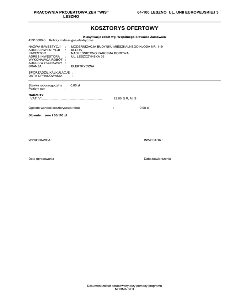 PRACOWNIA PROJEKTOWA ZEH "WIS" LESZNO 64-100 LESZNO UL. UNII EUROPEJSKIEJ 3 KOSZTORYS OFERTOWY 45310000-3 Klasyfikacja robót wg. Wspólnego Słownika Zamówień Roboty instalacyjne elektryczne NAZWA INWESTYCJI ADRES INWESTYCJI INWESTOR ADRES INWESTORA WYKONAWCA ROBÓT ADRES WYKONAWCY BRANŻA : : : : : : : MODERNIZACJA BUDYNKU MIESZKALNEGO KŁODA NR. 119 KŁODA NADLEŚNICTWO KARCZMA BOROWA UL. LESZCZYŃSKA 39 ELEKTRYCZNA SPORZĄDZIŁ KALKULACJE : DATA OPRACOWANIA : Stawka roboczogodziny : Poziom cen : 0.00 zł NARZUTY VAT [V] .................................................................. 23.00 % R, M, S Ogółem wartość kosztorysowa robót : 0.00 zł Słownie: zero i 00/100 zł WYKONAWCA : INWESTOR : Data opracowania Data zatwierdzenia Dokument został opracowany przy pomocy programu NORMA STD BUDYNEK MIESZKALNY KŁODA 119 Lp. Pozycje kosztorysowe 1 2 TABELA WARTOŚCI ELEMENTÓW SCALONYCH Nazwa Uproszczone Wartość zł Jedn. miary Ilość jedn. Wskaźnik na jednostkę zł 4 5 6 7 8 3 Kosztorys netto VAT Razem brutto Ogółem wartość kosztorysowa robót 0.00 0.00 0.00 0.00 Udzi ał procentowy 9 0.00% 0.00% 0.00% Słownie: zero i 00/100 zł TABELA NARZUTÓW Lp. Nazwa narzuty wspólne dla wszystkich działów 1 Koszty pośrednie 2 Koszty zakupu 3 Zysk narzuty kosztorysu 1 VAT Skró t Grupa Wartość Od robocizny Od materiałów Kp Kz Z wszystkie wszystkie wszystkie 0% wszystkie 0% 0% wszystkie wszystkie V wszystkie 23% wszystkie wszystkie -2- Norma STD Wersja 4.25 Licencja: 8873 dla PRACOWNIA PROJEKTOWA WIS LESZNO KOSZTORYS Od sprzętu wszystkie wszystkie wszystkie Lp. Podstawa wyceny 1 2 1 KNNR-W 9 0401-07 2 KNNR-W 9 0402-05 3 KNNR-W 9 0201-07 4 KNNR-W 9 0201-05 5 KNNR-W 9 0501-05 6 KNR 5-18 090108 7 analiza indywidualna 8 KNNR-W 9 1102-02 9 KNNR 5 040402 10 analiza indywidualna 11 KNNR 5 120701 12 KNNR 5 120802 13 KNNR 5 120905 14 KNNR 5 120905 15 KNNR 5 120907 16 KNR-W 5-08 0501-03 17 KNR-W 5-08 0502-09 18 KNR-W 5-08 0808-07 19 KNR-W 5-08 0804-01 20 KNNR 5 050201 21 KNNR 5 040601 22 KNNR 5 040601 23 KNNR 5 030111 24 KNNR 5 030201 25 KNNR 5 030206 26 KNNR 5 030602 27 KNNR 5 030802 28 KNNR 5 030805 29 Opis Jedn. miary 0.00 Wartość zł (5 x 6) 7 0.00 9 0.00 0.00 1 0.00 0.00 Demontaż tablic rozdzielczych o powierzchni do 0.5 m2 szt. 1 0.00 0.00 Demontaż opraw oświetleniowych żarowych szt. 9 0.00 0.00 Tablice do liczników z wyposażeniem demontaż (R x 0, 8) Wyłączenie zasilania tabl. 1 0.00 0.00 szt. 1 0.00 0.00 0.00 0.00 0.00 0.00 3 Demontaż nieuszczelnionego łącznika podtynkowego, szt. natynkowego Demontaż gniazd instalacyjnych wtykowych nieuszczel- szt. nionych podtynkowych, natynkowych Demontaż obudów o powierzchni do 0.5 m2 szt. Wnęki pod rozdzielnice elektryczne w podłożu ceglanym dm3 4 Ilość 5 12 0.8*0.6*0.25 = 0.120 1 Cena zł 6 Tablice rozdzielcze o masie do 20 kg szt. Zalicznikowanie szt. 2 0.00 0.00 Wykucie bruzd dla przewodów wtynkowych w cegle m 1 0.00 0.00 Zaprawianie bruzd o szerokości do 50 mm m 1 0.00 0.00 Przebijanie otworów śr. 25 mm o długości do 1 ceg. w ścianach lub stropach z cegły Przebijanie otworów śr. 40 mm o długości do 1 ceg. w ścianach lub stropach z cegły Przebijanie otworów śr. 80 mm o długości do 2 ceg. w ścianach lub stropach z cegły Przygotowanie podłoża pod oprawy oświetleniowe zawieszane na kołkach plastikowych lub kotwiących na podłożu betonowym (ilość mocowań 1) Przygotowanie podłoża pod oprawy oświetleniowe przykręcane na betonie mocowane na kołkach kotwiących (ilość mocowań 2) Montaż złączy 3-biegunowych na przewodach instalacyjnych Podłączenie przewodów kabelkowych pod zaciski lub bolce; przekrój żył do 2.5 mm2- demontaż i montaż zasilania halopaku (R x 2) Oprawy oświetleniowe przykręcane (zwykłe) - żarowa np. Ametyst 1x23W Demontaż i montaż dzwonka elektrycznego (R x 1,8) otw. 12 0.00 0.00 otw. 7 0.00 0.00 otw. 2 0.00 0.00 kpl. 4 0.00 0.00 kpl. 7 0.00 0.00 szt. 11 0.00 0.00 szt.żył 1 0.00 0.00 kpl. 1 0.00 0.00 szt. 1 0.00 0.00 Demontaż i montaż unifonu (R x 1,8) szt. 1 0.00 0.00 Przygotowanie podłoża pod osprzęt instalacyjny mocowany na zaprawie cementowej lub gipsowej - wykonanie ślepych otworów w podłożu ceglanym Puszki instalacyjne podtynkowe pojedyncze o śr.do 60 mm Puszki instalacyjne podtynkowe o śr.do 80 mm o 4 wylotach Łączniki i przyciski uniwersalne podtynkowe w puszce instalacyjnej Gniazda instalacyjne wtyczkowe ze stykiem ochronnym podtynkowe 2-biegunowe przelotowe pojedyncze o obciążalności do 10 A i przekroju przewodów do 2.5 mm2 Gniazda instalacyjne wtyczkowe ze stykiem ochronnym bryzgoszczelne 2-biegunowe o obciążalności do 16 A i przekroju przewodów do 2.5 mm2 Montaż ramek podwójnych szt. 73 0.00 0.00 szt. 53 0.00 0.00 szt. 20 0.00 0.00 szt. 11 0.00 0.00 szt. 34 0.00 0.00 szt. 3 0.00 0.00 szt. 13 0.00 0.00 szt. 1 0.00 0.00 szt. 4 0.00 0.00 analiza indywidualna 30 KNNR 5 0308- Gniazda instalacyjne RTV-SAT 01 31 KNNR 5 0308- Gniazda instalacyjne głośnikowe 01 -3- Norma STD Wersja 4.25 Licencja: 8873 dla PRACOWNIA PROJEKTOWA WIS LESZNO Lp. Podstawa wyceny 1 2 32 KNNR 5 060204 33 KNNR 5 060502 34 KNNR 5 060508 35 KNNR 5 130401 36 KNNR 5 020405 37 KNNR 5 020405 38 KNNR 5 020405 39 KNNR 5 020405 Opis Jedn. miary 3 Przewody uziemiające i wyrównawcze w budynkach ułożone luzem Montaż uziomów poziomych w wykopie o głębokości do 0.6 m; kat.gruntu III Mechaniczne pogrążanie uziomów pionowych prętowych w gruncie kat.III Badania i pomiary instalacji uziemiającej (pierwszy pomiar) Przewody kabelkowe płaskie o łącznym przekroju żył do 7.5 mm2 układane w tynku innym niż betonowy YDYp 3x1,5mm2 Przewody kabelkowe płaskie o łącznym przekroju żył do 7.5 mm2 układane w tynku innym niż betonowy YDYp 4x1,5mm2 Przewody kabelkowe płaskie o łącznym przekroju żył do 7.5 mm2 układane w tynku innym niż betonowy YDYp 3x2,5mm2 Przewody kabelkowe płaskie o łącznym przekroju żył do 7.5 mm2 układane w tynku innym ni
