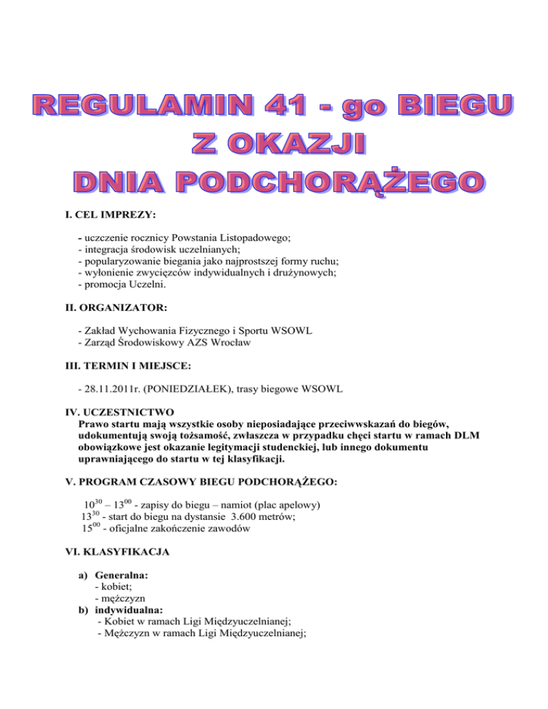 I. CEL IMPREZY: - uczczenie rocznicy Powstania Listopadowego; - integracja środowisk uczelnianych; - popularyzowanie biegania jako najprostszej formy ruchu; - wyłonienie zwycięzców indywidualnych i drużynowych; - promocja Uczelni. II. ORGANIZATOR: - Zakład Wychowania Fizycznego i Sportu WSOWL - Zarząd Środowiskowy AZS Wrocław III. TERMIN I MIEJSCE: - 28.11.2011r. (PONIEDZIAŁEK), trasy biegowe WSOWL IV. UCZESTNICTWO Prawo startu mają wszystkie osoby nieposiadające przeciwwskazań do biegów, udokumentują swoją tożsamość, zwłaszcza w przypadku chęci startu w ramach DLM obowiązkowe jest okazanie legitymacji studenckiej, lub innego dokumentu uprawniającego do startu w tej klasyfikacji. V. PROGRAM CZASOWY BIEGU PODCHORĄŻEGO: 1030 – 1300 - zapisy do biegu – namiot (plac apelowy) 1330 - start do biegu na dystansie 3.600 metrów; 1500 - oficjalne zakończenie zawodów VI. KLASYFIKACJA a) Generalna: - kobiet; - mężczyzn b) indywidualna: - Kobiet w ramach Ligi Międzyuczelnianej; - Mężczyzn w ramach Ligi Międzyuczelnianej; - kobiet - słuchaczy WSOWL; - mężczyzn – słuchaczy WSOWL; - kadry zawodowej do 40-go roku życia; - kadry zawodowej powyżej 40-go roku życia; c) zespołowa: - kobiet w ramach Ligi Międzyuczelnianej; - mężczyzn w ramach Ligi Międzyuczelnianej; - kadry zawodowej w ramach współzawodnictwa sportowego w Garnizonie Wrocław; - słuchaczy WSO WL w ramach zawodów otwartych Uczelni o „ Puchar Komendanta”. VII. PUNKTACJA a) indywidualna - I miejsce - ilość startujących n + 1 pkt. - II miejsce n -1pkt. - III miejsce n –2pkt. b) Zespołowa zespołowa kobiet w ramach DLM - ustala się na podstawie zajętych miejsc w klasyfikacji indywidualnej, w następujący sposób: o zajętym miejscu będzie decydowała suma pkt. uzyskanych przez pięć pierwszych zawodniczek danej uczelni według klucza : I mce - 200 pkt., II m-ce - 197 pkt., III m-ce - 195 pkt., IV m-ce 194 pkt., ...ostatnie m-ce 1 pkt.) ► zespołowa mężczyzn w ramach DLM - ustala się na podstawie zajętych miejsc w klasyfikacji indywidualnej, w następujący sposób: o zajętym miejscu będzie decydowała suma pkt. uzyskanych przez pięciu pierwszych zawodników danej uczelni według klucza : I m-ce - 200 pkt., II m-ce - 197 pkt., III m-ce - 195 pkt., IV m-ce 194 pkt., ...ostatnie m-ce - 1 pkt.). UWAGA ! Pozostali zawodnicy z danej uczelni (powyżej 5 kobiet, powyżej 5 mężczyzn) otrzymują punkty, ale ich wyniki nie są brane do klasyfikacji drużynowej. W przypadku uzyskania tej samej ilości pkt przez drużyny decyduje wyższe miejsce pierwszego zawodnika. ► zespołowa w ramach współzawodnictwa sportowego w Garnizonie Wrocław- ustala się w następujący sposób: o zajętym miejscu będzie decydowała suma pkt. uzyskanych przez pięciu pierwszych zawodników w klasyfikacji indywidualnej. Prawo startu w tej klasyfikacji mają: kadra zawodowa, pracownicy wojska, byli żołnierze zawodowi. W przypadku uzyskania równej ilości punktów przez drużyny decydować będzie wyższe miejsce pierwszego zawodnika zespołu. ► słuchaczy WSO WL w ramach zawodów otwartych Uczelni o „ Puchar Komendanta” ustala się w następujący sposób: o zajętym miejscu będzie decydowała suma pkt. uzyskanych przez pięciu pierwszych zawodników w klasyfikacji indywidualnej. Prawo startu w tej klasyfikacji mają studenci WSOWL. W przypadku uzyskania równej ilości punktów przez drużyny decydować będzie wyższe miejsce pierwszego zawodnika zespołu. ► VIII. NAGRODY - w klasyfikacji Generalnej kobiet – puchar, medal i dyplom dla zwycięzców, oraz dyplomy i medale za zajęcie 2 i 3 miejsca; - w klasyfikacji Generalnej mężczyzn – puchar, medal i dyplom dla zwycięzców, oraz dyplomy i medale za zajęcie 2 i 3 miejsca; - w klasyfikacji indywidualnej Kobiet w ramach Ligi Międzyuczelnianejpuchar, medal i dyplom dla zwycięzców, oraz dyplomy i medale za zajęcie 2 i 3 miejsca; - w klasyfikacji indywidualnej Mężczyzn w ramach Ligi Międzyuczelnianejpuchar, medal i dyplom dla zwycięzców, oraz dyplomy i medale za zajęcie 2 i 3 miejsca; - w klasyfikacji indywidualnej kobiet - słuchaczy WSOWLpuchar, medal i dyplom dla zwycięzców, oraz dyplomy i medale za zajęcie 2 i 3 miejsca; - w klasyfikacji indywidualnej mężczyzn – słuchaczy WSOWLpuchar, medal i dyplom dla zwycięzców, oraz dyplomy i medale za zajęcie 2 i 3 miejsca; - w klasyfikacji indywidualnej kadry zawodowej do 40-go roku życiapuchar, medal i dyplom dla zwycięzców, oraz dyplomy i medale za zajęcie 2 i 3 miejsca; - w klasyfikacji indywidualnej kadry zawodowej powyżej 40-go roku życiapuchar, medal i dyplom dla zwycięzców, oraz dyplomy i medale za zajęcie 2 i 3 miejsca; - w klasyfikacji zespołowej kobiet w ramach Ligi Międzyuczelnianej-puchar i dyplom dla zwycięzców; - w klasyfikacji zespołowej mężczyzn w ramach Ligi Międzyuczelnianej-puchar i dyplom dla zwycięzców; - w klasyfikacji zespołowej kadry zawodowej w ramach współzawodnictwa sportowego w Garnizonie Wrocław o „ Puchar Komendanta” - puchar i dyplom dla zwycięzców; - w klasyfikacji zespołowej słuchaczy WSO WL w ramach zawodów otwartych Uczelni o ”Puchar Komendanta” - puchar i dyplom dla zwycięzców, oraz dyplomy za zajęcie 2 i 3 miejsca; IX. ZGŁOSZENIA Imienne: - elektroniczne na: www.wso.wroc.pl/aktualności - w dniu zawodów od godz.10.30-13.00 na miejscu startu – plac apelowy WSO WL; - informacje tel. /071/ 76 58 309 X. SPRAWY ORGANIZACYJNE: 1. Pomiaru czasu zawodników dokonuje się elektronicznie na mecie - plac apelowy WSO WL; 2. Jeżeli po biegu okaże się, że zawodnik (zawodniczka)kwalifikuje się do dwóch lub więcej nagród, wówczas organizator wydaje jedną, najwyższą wartościowo nagrodę, stosując kolejność od wyższej klasyfikacji, a za pozostałe klasyfikacje otrzymuje on(ona) dyplomy. 3. Opiekę lekarską na czas trwania biegu zapewnia organizator. 4. Startujemy na własną odpowiedzialnoś