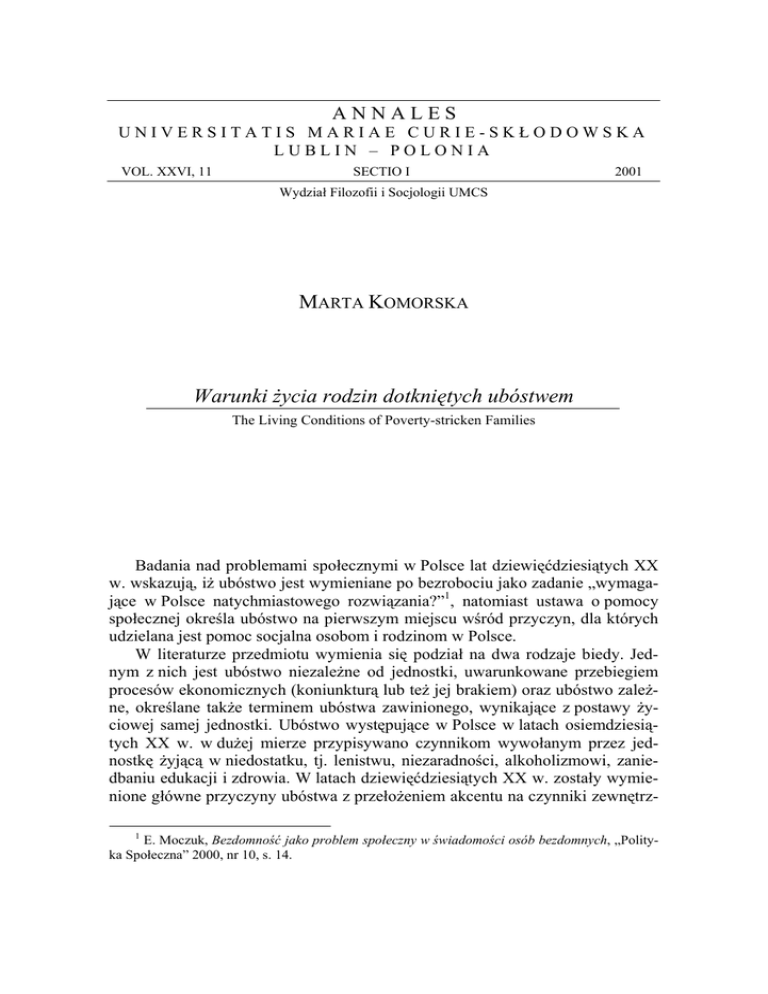 ANNALES UNIVERSITATIS MARIAE CURIE-SKŁODOWSKA LUBLIN – POLONIA VOL. XXVI, 11 SECTIO I 2001 Wydział Filozofii i Socjologii UMCS MARTA KOMORSKA Warunki życia rodzin dotkniętych ubóstwem The Living Conditions of Poverty-stricken Families Badania nad problemami społecznymi w Polsce lat dziewięćdziesiątych XX w. wskazują, iż ubóstwo jest wymieniane po bezrobociu jako zadanie „wymagające w Polsce natychmiastowego rozwiązania?”1, natomiast ustawa o pomocy społecznej określa ubóstwo na pierwszym miejscu wśród przyczyn, dla których udzielana jest pomoc socjalna osobom i rodzinom w Polsce. W literaturze przedmiotu wymienia się podział na dwa rodzaje biedy. Jednym z nich jest ubóstwo niezależne od jednostki, uwarunkowane przebiegiem procesów ekonomicznych (koniunkturą lub też jej brakiem) oraz ubóstwo zależne, określane także terminem ubóstwa zawinionego, wynikające z postawy życiowej samej jednostki. Ubóstwo występujące w Polsce w latach osiemdziesiątych XX w. w dużej mierze przypisywano czynnikom wywołanym przez jednostkę żyjącą w niedostatku, tj. lenistwu, niezaradności, alkoholizmowi, zaniedbaniu edukacji i zdrowia. W latach dziewięćdziesiątych XX w. zostały wymienione główne przyczyny ubóstwa z przełożeniem akcentu na czynniki zewnętrz1 E. Moczuk, Bezdomność jako problem społeczny w świadomości osób bezdomnych, „Polityka Społeczna” 2000, nr 10, s. 14. Marta Komorska 144 ne, takie jak: bezrobocie, niskie płace, spadek produkcji.2 Należy jednak podkreślić, iż wymienione czynniki zewnętrzne dotykają przede wszystkim zarówno jednostki słabsze pod względem zdrowotnym, edukacyjnym, jak i jednostki wywodzące się z rodzin i środowisk z dysfunkcjami. Badania nad zjawiskiem ubóstwa w Polsce prowadzone są od wielu lat, lecz dopiero ostatnie dziesięciolecie zaznaczyło się jego całościowym ujęciem uwzględniającym zarówno cechy demograficzno-społeczne, jak i przestrzenne. Najczęściej wykorzystywanymi w badaniach miernikami ubóstwa są kryteria dochodowe, wśród których możemy wymienić: kategorie minimum socjalnego i egzystencjalnego oraz kategorie minimalnej emerytury.3 Minimum egzystencji wyznacza linię wykorzystywaną w definiowaniu ubóstwa bezwzględnego, w kosztach którego zawierają się tylko dobra niezbędne do przeżycia, tj. żywność, odzież chroniącą przed zimnem, dach nad głową i podstawową pomoc leczniczą. Linia ubóstwa bezwzględnego wyznacza granicę, poniżej której zagrożona jest egzystencja człowieka. A. Tymowski minimum socjalne określa jako „sumę pieniężnych środków umożliwiających zaspokajanie w minimalnej mierze potrzeb gospodarstw domowych, na poziomie uznanym za niezbędny na danym etapie rozwoju kraju”.4 Metoda wyznaczenia minimum socjalnego polega na: „określeniu stałego zestawu dóbr i usług służących zaspokajaniu ustalonych grup potrzeb (żywność, odzież, utrzymanie i wyposażenie mieszkania, higiena i ochrona zdrowia, kultura, oświata i wypoczynek, transport i łączność) oraz przyjęciu stałych norm spożycia tych dóbr i usług, stosownie do założeń minimum. Minimum socjalne w swoim założeniu to taki poziom, który musi zapewnić jednostce pełne uczestnictwo w życiu społecznym. Źródłem danych dotyczących cen są raporty GUS pochodzące z badań budżetów rodzinnych oraz notowania cen detalicznych. Sens kategorii minimum socjalnego jest inny niż kategorii egzystencji. Nie zostaje wyznaczona de facto linia ubóstwa, ale linia ostrzegająca, że poniżej minimum socjalnego istnieje zagrożenie ubóstwem. W praktyce zarówno kategoria minimum egzystencji, jak i minimum socjalnego są kategoriami informacyjnymi, służącymi głównie do porównań oraz sygnalizowania relacji między rzeczywistymi potrzebami a faktycznymi dochodami pieniężnymi ludności.5 Ani 2 S. Golinowska [red.], Ubóstwo w Polsce. Synteza wyników badań, [w:] ead. [red.], Polska Bieda II. Kryteria. Ocena. Przeciwdziałanie, Warszawa 1997, s. 320. 3 Wymienione kategorie nie wyczerpują istniejących możliwości i tak jak pozostałe podlegają systematycznej indeksacji cenowej, patrz: S. Golinowska [red.], op. cit., s. 19–29. 4 A. Tymowski, Warunki bytu rodzin, [w:] A. Rajkiewicz, J. Supińska, M. Księżopolski, Polityka społeczna. Materiały do studiowania, Katowice 1998, s. 304. 5 W czerwcu 2000 r. poziom minimum egzystencji na 1 osobę (w gosp. jednoosobowym) wynosił 313 zł, a minimum socjalne na 1 osobę (w gosp. jednoosobowym ) 700 zł. Patrz P. Kurowski, Informacje [w:] „Polityka Społeczna” 2000, nr 3, s. 32–33. Warunki życia rodzin dotkniętych ubóstwem 145 minimum egzystencji, ani minimum socjalne nie stanowią kryterium uprawniającego do uzyskiwania pomocy socjalnej państwa. Kolejnym kryterium w ocenie ubóstwa jest wartość minimalnej emerytury. W pierwszym okresie transformacji była ona podstawą do uzyskania pieniężnych świadczeń pomocy społecznej. Minimalna emerytura w początkowym okresie transformacji wynosiła 35% przeciętnej płacy, a od 1994 roku – 39%. W tym okresie przeciętne wynagrodzenie wynosiło odpowiednio w roku 1994 – 425,49 zł, a w roku 1996 – 710,46 zł, tak więc minimalna emerytura w kolejnych latach wynosiła: w roku 1994 – 155,90 zł i w 1996 roku – 245,95 zł.6 Nowelizacja ustawy o pomocy społecznej z 1996 roku wprowadziła korektę, w ramach której kryterium dochodowe uprawniające do świadczeń z pomocy społecznej określono kwotowo z systematyczną indeksacją cenową tej kwoty7, tak więc do 1996 roku uznawano za urzędową linię ubóstwa minimalną emeryturę, a od 1996 roku badacze najczęściej korzystają równolegle z wymienionych kilku kryteriów oceny ubóstwa. Pojawienie się ubóstwa w okresie przemian ustrojowych8 spowodowane było głównie kryzysem ekonomicznym, któremu towarzyszył wybuch bezrobocia, a w konsekwencji spadek płac realnych wśród pracowników 