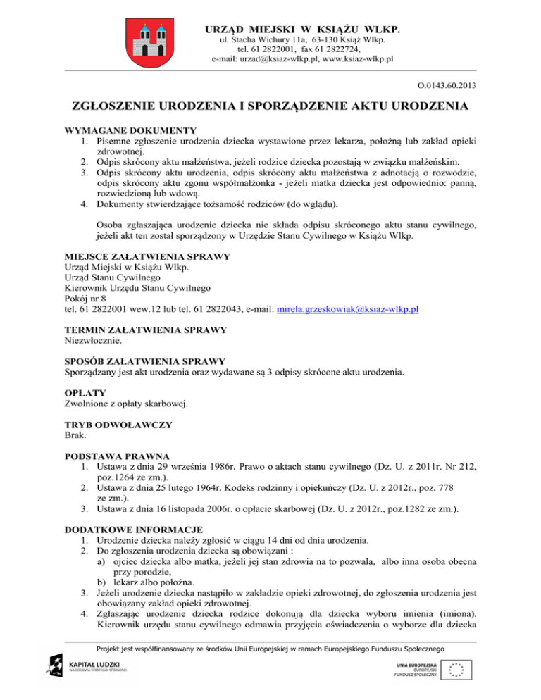URZĄD MIEJSKI W KSIĄŻU WLKP. ul. Stacha Wichury 11a, 63-130 Książ Wlkp. tel. 61 2822001, fax 61 2822724, e-mail: [email protected], www.ksiaz-wlkp.pl O.0143.60.2013 ZGŁOSZENIE URODZENIA I SPORZĄDZENIE AKTU URODZENIA WYMAGANE DOKUMENTY 1. Pisemne zgłoszenie urodzenia dziecka wystawione przez lekarza, położną lub zakład opieki zdrowotnej. 2. Odpis skrócony aktu małżeństwa, jeżeli rodzice dziecka pozostają w związku małżeńskim. 3. Odpis skrócony aktu urodzenia, odpis skrócony aktu małżeństwa z adnotacją o rozwodzie, odpis skrócony aktu zgonu współmałżonka - jeżeli matka dziecka jest odpowiednio: panną, rozwiedzioną lub wdową. 4. Dokumenty stwierdzające tożsamość rodziców (do wglądu). Osoba zgłaszająca urodzenie dziecka nie składa odpisu skróconego aktu stanu cywilnego, jeżeli akt ten został sporządzony w Urzędzie Stanu Cywilnego w Książu Wlkp. MIEJSCE ZAŁATWIENIA SPRAWY Urząd Miejski w Książu Wlkp. Urząd Stanu Cywilnego Kierownik Urzędu Stanu Cywilnego Pokój nr 8 tel. 61 2822001 wew.12 lub tel. 61 2822043, e-mail: [email protected] TERMIN ZAŁATWIENIA SPRAWY Niezwłocznie. SPOSÓB ZAŁATWIENIA SPRAWY Sporządzany jest akt urodzenia oraz wydawane są 3 odpisy skrócone aktu urodzenia. OPŁATY Zwolnione z opłaty skarbowej. TRYB ODWOŁAWCZY Brak. PODSTAWA PRAWNA 1. Ustawa z dnia 29 września 1986r. Prawo o aktach stanu cywilnego (Dz. U. z 2011r. Nr 212, poz.1264 ze zm.). 2. Ustawa z dnia 25 lutego 1964r. Kodeks rodzinny i opiekuńczy (Dz. U. z 2012r., poz. 778 ze zm.). 3. Ustawa z dnia 16 listopada 2006r. o opłacie skarbowej (Dz. U. z 2012r., poz.1282 ze zm.). DODATKOWE INFORMACJE 1. Urodzenie dziecka należy zgłosić w ciągu 14 dni od dnia urodzenia. 2. Do zgłoszenia urodzenia dziecka są obowiązani : a) ojciec dziecka albo matka, jeżeli jej stan zdrowia na to pozwala, albo inna osoba obecna przy porodzie, b) lekarz albo położna. 3. Jeżeli urodzenie dziecka nastąpiło w zakładzie opieki zdrowotnej, do zgłoszenia urodzenia jest obowiązany zakład opieki zdrowotnej. 4. Zgłaszając urodzenie dziecka rodzice dokonują dla dziecka wyboru imienia (imiona). Kierownik urzędu stanu cywilnego odmawia przyjęcia oświadczenia o wyborze dla dziecka Projekt jest współfinansowany ze środków Unii Europejskiej w ramach Europejskiego Funduszu Społecznego URZĄD MIEJSKI W KSIĄŻU WLKP. ul. Stacha Wichury 11a, 63-130 Książ Wlkp. tel. 61 2822001, fax 61 2822724, e-mail: [email protected], www.ksiaz-wlkp.pl więcej niż dwóch imion, imienia ośmieszającego, nieprzyzwoitego, w formie zdrobniałej oraz imienia niepozwalającego odróżnić płci dziecka. Jeżeli przy sporządzeniu aktu urodzenia rodzice nie dokonali wyboru imienia (imion) dziecka, kierownik urzędu stanu cywilnego wpisuje do aktu urodzenia jedno z imion zwykle w kraju używanych, czyniąc o tym stosowna wzmiankę dodatkową. 5. Rodzice dziecka mogą w ciągu 6 miesięcy od daty sporządzenia aktu urodzenia złożyć kierownikowi urzędu stanu cywilnego pisemne oświadczenie o zmianie imienia (imion) dziecka wpisanego do aktu w chwili jego sporządzenia. DATA OSTATNIEGO PRZEGLĄDU/ AKTUALIZACJI 11.04.2013r. Projekt jest współfinansowany ze środków Unii Europejskiej w ramach Europejskiego Funduszu Społecznego