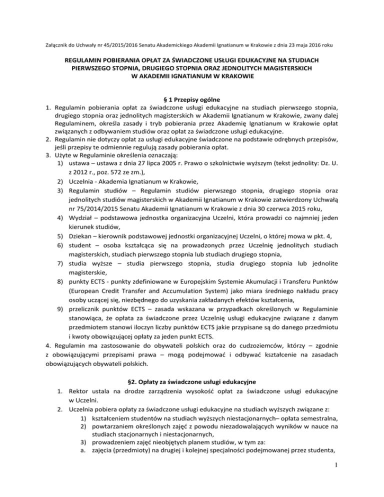 Załącznik do Uchwały nr 45/2015/2016 Senatu Akademickiego Akademii Ignatianum w Krakowie z dnia 23 maja 2016 roku REGULAMIN POBIERANIA OPŁAT ZA ŚWIADCZONE USŁUGI EDUKACYJNE NA STUDIACH PIERWSZEGO STOPNIA, DRUGIEGO STOPNIA ORAZ JEDNOLITYCH MAGISTERSKICH W AKADEMII IGNATIANUM W KRAKOWIE § 1 Przepisy ogólne 1. Regulamin pobierania opłat za świadczone usługi edukacyjne na studiach pierwszego stopnia, drugiego stopnia oraz jednolitych magisterskich w Akademii Ignatianum w Krakowie, zwany dalej Regulaminem, określa zasady i tryb pobierania przez Akademię Ignatianum w Krakowie opłat związanych z odbywaniem studiów oraz opłat za świadczone usługi edukacyjne. 2. Regulamin nie dotyczy opłat za usługi edukacyjne świadczone na podstawie odrębnych przepisów, jeśli przepisy te odmiennie regulują zasady pobierania opłat. 3. Użyte w Regulaminie określenia oznaczają: 1) ustawa – ustawa z dnia 27 lipca 2005 r. Prawo o szkolnictwie wyższym (tekst jednolity: Dz. U. z 2012 r., poz. 572 ze zm.), 2) Uczelnia - Akademia Ignatianum w Krakowie, 3) Regulamin studiów – Regulamin studiów pierwszego stopnia, drugiego stopnia oraz jednolitych studiów magisterskich w Akademii Ignatianum w Krakowie zatwierdzony Uchwałą nr 75/2014/2015 Senatu Akademii Ignatianum w Krakowie z dnia 30 czerwca 2015 roku, 4) Wydział – podstawowa jednostka organizacyjna Uczelni, która prowadzi co najmniej jeden kierunek studiów, 5) Dziekan – kierownik podstawowej jednostki organizacyjnej Uczelni, o której mowa w pkt. 4, 6) student – osoba kształcąca się na prowadzonych przez Uczelnię jednolitych studiach magisterskich, studiach pierwszego stopnia lub studiach drugiego stopnia, 7) studia wyższe – studia pierwszego stopnia, studia drugiego stopnia lub jednolite magisterskie, 8) punkty ECTS - punkty zdefiniowane w Europejskim Systemie Akumulacji i Transferu Punktów (European Credit Transfer and Accumulation System) jako miara średniego nakładu pracy osoby uczącej się, niezbędnego do uzyskania zakładanych efektów kształcenia, 9) przelicznik punktów ECTS – zasada wskazana w przypadkach określonych w Regulaminie stanowiąca, że opłata za świadczone przez Uczelnię usługi edukacyjne związane z danym przedmiotem stanowi iloczyn liczby punktów ECTS jakie przypisane są do danego przedmiotu i kwoty obowiązującej opłaty za jeden punkt ECTS. 4. Regulamin ma zastosowanie do obywateli polskich oraz do cudzoziemców, którzy – zgodnie z obowiązującymi przepisami prawa – mogą podejmować i odbywać kształcenie na zasadach obowiązujących obywateli polskich. §2. Opłaty za świadczone usługi edukacyjne 1. Rektor ustala na drodze zarządzenia wysokość opłat za świadczone usługi edukacyjne w Uczelni. 2. Uczelnia pobiera opłaty za świadczone usługi edukacyjne na studiach wyższych związane z: 1) kształceniem studentów na studiach wyższych niestacjonarnych– opłata semestralna, 2) powtarzaniem określonych zajęć z powodu niezadowalających wyników w nauce na studiach stacjonarnych i niestacjonarnych, 3) prowadzeniem zajęć nieobjętych planem studiów, w tym za: a. zajęcia (przedmioty) na drugiej i kolejnej specjalności podejmowanej przez studenta, 1 3. a. b. c. d. e. 4. 5. b. dodatkowe lektoraty języka obcego, 4) prowadzeniem zajęć zaliczanych przez studenta studiów wyższych niestacjonarnych w przypadku konieczności uzupełnienia różnic programowych powstałej w wyniku przeniesienia na Uczelnię, zmiany kierunku lub formy studiów albo powtarzania roku/semestru bądź wznowienia studiów, 5) uczestnictwem studentów studiów niestacjonarnych w zajęciach objętych planem studiów w trybie tzw. awansu, czyli we wcześniejszym terminie, niż ustalony w planie studiów, Uczelnie pobiera następujące opłaty za wydanie dokumentów związanych z odbywaniem studiów: elektroniczna legitymacja studencka, duplikat elektronicznej legitymacji studenckiej, dyplom ukończenia studiów pierwszego stopnia, drugiego stopnia, oraz jednolitych magisterskich wraz z dwoma odpisami, dodatkowy odpis dyplomu w tłumaczeniu na język obcy, duplikat dyplomu ukończenia studiów. Opłaty za świadczone usługi edukacyjne wymienione w ust. 2 obowiązują studenta w wysokości ustalonej na rok akademicki, w którym student podejmuje studia przy czym student, który przerwał studia, po uzyskaniu zgody na wznowienie studiów powraca na aktualny tok studiów z obowiązującymi na tym roku opłatami i zasadami. Uczelnia pobiera opłaty na pokrycie kosztów wezwań do zapłaty, wysyłanych do studenta w związku z niedotrzymaniem terminu wniesienia opłaty. §3. Terminy uiszczania opłat za świadczone usługi edukacyjne oraz za wydanie dokumentów związanych z odbywaniem studiów 1. Opłaty za świadczone usługi edukacyjne pobierane są oddzielnie za każdy semestr. 2. Opłaty za świadczone usługi edukacyjne, takie jak opłata semestralna na studiach niestacjonarnych wnoszona jest jednorazowo w następujących terminach: a. do 31 października (semestr zimowy) b. do 31 marca (semestr letni), lub w ratach: a. semestr zimowy: I rata – do dnia 31 października II rata – do dnia 30 listopada III rata - do dnia 10 stycznia b. semestr letni: I rata – do dnia 31 marca, II rata - do 30 kwietnia, III rata - do 15 maja. 3. W przypadku studentów pierwszego semestru studiów pierwszego stopnia, studiów drugiego stopnia, jednolitych studiów magisterskich, opłata za semestr zimowy, o której mowa w §2 ust. 2 pkt 1 uiszczane jest do 1 października. 4. Rektor Uczelni ustala wysokość rat opłaty semestralnej na poszczególnych kierunkach studiów, na drodze odrębnego zarządzenia. 5. Opłata za wydane dokumenty, o których mowa w §2 ust. 3 jest opłatą jednorazową i powinny być dokonane przed wydaniem studentowi dokumentu i nie podlega zwrotowi. 6. Opłaty za pozostałe usługi edukacyjne wymienione w §2 ust. 2 pkt 3 lit. a i b wnoszone są jednorazowo w terminie 14 d