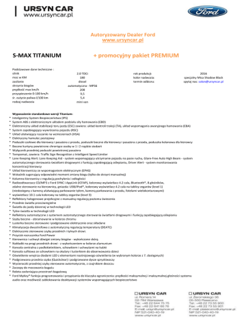 Autoryzowany Dealer Ford www.ursyncar.pl S-MAX TITANIUM Podstawowe dane techniczne : silnik moc w KM zasilanie skrzynia biegów prędkość max km/h przyspieszenie 0-100 km/h śr. zużycie paliwa l/100 km rodzaj nadwozia * * * * * * * * * * * * * * * * * * * * * * * * * * * * * * * * * * * * + promocyjny pakiet PREMIUM 2.0 TDCi 180 diesel automatyczna - MPS6 208 9,5 5,4 mini van rok produkcji: kolor nadwozia: termin odbioru: 2016 specjalny Mica Shadow Black spytaj nas: [email protected] Wyposażenie standardowe wersji Titanium: Inteligentny System Bezpieczeństwa (IPS) System ABS z elektronicznym układem podziału siły hamowania (EBD) Elektroniczny układ stabilizacji toru jazdy (ESC) zawiera: układ kontroli trakcji (TA), układ wspomagania awaryjnego hamowania (EBA) System zapobiegający wywróceniu pojazdu (RSC) Układ ułatwiający ruszanie na wzniesieniach (HSA) Elektryczny hamulec postojowy Poduszki czołowe dla kierowcy i pasażera z przodu, poduszki boczne dla kierowcy i pasażera z przodu, poduszka kolanowa dla kierowcy Boczne kurtyny powietrzne chroniące osoby w 1 i 2 rzędzie siedzeń Wyłącznik przedniej poduszki powietrznej pasażera Tempomat, zawiera: Traffic Sign Recognition z Intelligent Speed Limiter Lane Keeping Alert: Lane Keeping Aid - system wspomagający utrzymanie pojazdu na pasie ruchu, Glare-Free Auto High Beam - system automatycznego sterowania światłami drogowymi z funkcją zapobiegającą oślepianiu, Driver Alert - system monitorowania koncentracji kierowcy Układ kierowniczy ze wspomaganiem elektrycznym (EPAS) Wskaźnik sugerujący odpowiedni moment zmiany biegu (tylko do skrzyni manualnej) Kolumna kierownicy z regulacją pochylenia i odległości Radioodtwarzacz CD/MP3 z Ford SYNC i AppLink (ICFAP), kolorowy wyświetlacz 4.2 cala, Bluetooth®, 8 głośników, zdalne sterowanie na kierownicy, gniazda: USB/iPod®, kolorowy wyświetlacz 4.2 cala na tablicy zegarów (level 1) (niedostępny z kamerą ułatwiającą parkowanie tyłem, kamerą parkowania z przodu, fotelami wielokonturowymi) wyświetlacz 10.1 cala kolorowy na tablicy zegarów (level 3) Reflektory halogenowe projekcyjne z manualną regulacją poziomu świecenia Przednie światła przeciwmgielne Światła do jazdy dziennej w technologii LED Tylne światła w technologii LED Reflektory automatyczne z systemem automatycznego sterowania światłami drogowymi i funkcją zapobiegającą oślepianiu Szyby boczne - obramowanie w kolorze chromu Lusterka boczne sterowane i podgrzewane elektrycznie oraz składane Klimatyzacja dwustrefowa z automatyczną regulacją temperatury (DEATC) Elektrycznie sterowane szyby przednich i tylnych drzwi. Przycisk rozrusznika Ford Power Kierownica i uchwyt dźwigni zmiany biegów - wykończone skórą Nakładki na progi przednich drzwi - z wykończeniem w kolorze alumunium Konsola centralna z podłokietnikiem, schowkiem i uchwytami na kubki Konsola sufitowa ze schowkiem na okulary i lusterkiem do obserwowania dzieci Oświetlenie wnętrza diodami LED z elementami nastrojowego oświetlenia (w wybranym kolorze z 7. dostępnych) Podgrzewana przednia szyba (Quickclear) i podgrzewane dysze spryskiwaczy Wycieraczki przedniej szyby sterowane automatycznie, z czujnikiem deszczu Zaczepy do mocowania bagażu Roleta zasłaniająca przestrzeń bagażową Ford MyKey® funkcja programowania i przypisania do kluczyka ograniczenia: prędkości maksymalnej i maksymalnej głośności systemu audio oraz możliwość zablokowania deaktywacji systemów wspomagających bezpieczeństwo * * * * * * * Wyposażenie standardowe cd: Centralny zamek sterowany pilotem System elektrycznej blokady tylnych drzwi, uniemożliwiający otwarcie od środka przez dzieci Zestaw naprawczy ogumienia 17 cali obręcze kół ze stopów lekkich ogumienie 235/55 (D2YDN) Przednie fotele z ręczną regulacją położenia (góra-dół, przód-tył) oraz ręczną regulacją podparcia odcinka lędźwiowego Przednie fotele podgrzewane, z regulacją temperatury Schowek pod fotelem kierowcy i pasażera z przodu Aktualna cena nowego pojazdu: 2.0 TDCi 180KM Titanium MPS6 147 000,00 wyposażenie opcjonalne oferowanego egzemplarza: * Lakier specjalny Mica Shadow Black 2 300,00 * Autoalarm Thatcham - obwodowy i pojemnościowy (zawiera dwuetapowe ryglowanie zamków) 1 450,00 * Koło zapasowe dojazdowe mini z obręczą stalową 17 cali 550,00 elementy promocyjnego pakietu Premium: * System nawigacji satelitarnej Sony CD/SD z Ford SYNC 3 (kolorowy wyświetlacz dotykowy 8", TMC, zestaw głośnomówiący z Bluetooth® i rozbudowaną funkcją sterowania głosem w języku polskim oraz funkcją wzywania pomocy, 9 głośników Sony, zdalne sterowanie na kierownicy, gniazda: 2xUSB, mapy Europy z widokiem 3D, menu tekstowe i komunikaty głosowe nawigacji w języku polskim) (ICFAY) 8 470,00 * reflektory w technologii Ford Dynamic LED Adaptive Technology (automatyczne dostosowanie kształtu i zasięgu strumienia świetlnego do warunków otoczenia i kierunku jazdy), LED Technology (światła mijania, drogowe, do jazdy dziennej, pozycyjne i kierunkowskazy w technologii LED) Intelligent Light Technology (automatyczny wybór rodzaju oświetlenia zależnie od prędkości jazdy), 5 400,00 * Active Park Assist (system wspomagający wykonanie manewrów parkowania równoległego i prostopadłego oraz wyjazdu z równoległego miejsca parkingowego, czujniki parkowania z przodu i z tyłu, 3 000,00 * kamera ułatwiająca parkowanie tyłem, 4 200,00 * dodatkowo przyciemniane szyby w tylnej części nadwozia, * drzwi bagażnika zamykane / otwierane elektrycznie i bezdotykowo, * podgrzewana kierownica 800,00 1 900,00 650,00 Cena nowego samochodu wraz z wyposażeniem dodatkowym: Cena oferowanego auta: Zyskujesz rabat w stosunku do nowego auta aż: Obejrzyj zdjęcia poniżej ! Skontaktuj sie z nami pod adresem [email protected] 175 720,00 141 900,00 33 820,00 Dokładamy wszelkich starań aby opisy produktów były wolne od błędów, jednakże zastrzegamy sobie
