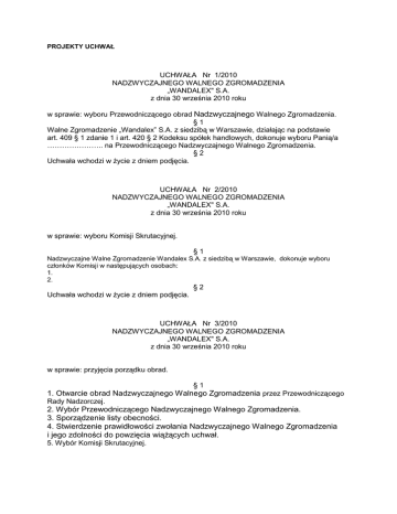 PROJEKTY UCHWAŁ UCHWAŁA Nr 1/2010 NADZWYCZAJNEGO WALNEGO ZGROMADZENIA „WANDALEX" S.A. z dnia 30 września 2010 roku w sprawie: wyboru Przewodniczącego obrad Nadzwyczajnego Walnego Zgromadzenia. §1 Walne Zgromadzenie „Wandalex” S.A. z siedzibą w Warszawie, działając na podstawie art. 409 § 1 zdanie 1 i art. 420 § 2 Kodeksu spółek handlowych, dokonuje wyboru Panią/a ………………….. na Przewodniczącego Nadzwyczajnego Walnego Zgromadzenia. §2 Uchwała wchodzi w Ŝycie z dniem podjęcia. UCHWAŁA Nr 2/2010 NADZWYCZAJNEGO WALNEGO ZGROMADZENIA „WANDALEX" S.A. z dnia 30 września 2010 roku w sprawie: wyboru Komisji Skrutacyjnej. §1 Nadzwyczajne Walne Zgromadzenie Wandalex S.A. z siedzibą w Warszawie, dokonuje wyboru członków Komisji w następujących osobach: 1. 2. §2 Uchwała wchodzi w Ŝycie z dniem podjęcia. UCHWAŁA Nr 3/2010 NADZWYCZAJNEGO WALNEGO ZGROMADZENIA „WANDALEX" S.A. z dnia 30 września 2010 roku w sprawie: przyjęcia porządku obrad. §1 1. Otwarcie obrad Nadzwyczajnego Walnego Zgromadzenia przez Przewodniczącego Rady Nadzorczej. 2. Wybór Przewodniczącego Nadzwyczajnego Walnego Zgromadzenia. 3. Sporządzenie listy obecności. 4. Stwierdzenie prawidłowości zwołania Nadzwyczajnego Walnego Zgromadzenia i jego zdolności do powzięcia wiąŜących uchwał. 5. Wybór Komisji Skrutacyjnej. 6. Przyjęcie porządku obrad. 7. Podjęcie uchwały w sprawie połączenia Spółki ze spółką pod firmą Aporter Sp. z o. o. z siedzibą w Zgierzu. 8. Podjęcie uchwały w sprawie zmian w Statucie Wandalex S.A. 9. Zamknięcie obrad Nadzwyczajnego Walnego Zgromadzenia. §2 Uchwała wchodzi w Ŝycie z dniem podjęcia. UCHWAŁA Nr 4/2010 NADZWYCZAJNEGO WALNEGO ZGROMADZENIA „WANDALEX" S.A. z dnia 30 września 2010 roku w sprawie połączenia Spółki ze spółką pod firmą Aporter Sp. z o.o. z siedzibą w Zgierzu Nadzwyczajne Walne Zgromadzenie Spółki pod firmą Wandalex S.A. z siedzibą w Warszawie, działając na podstawie art. 506 Kodeksu spółek handlowych w zw. z art. 516 § 6 Kodeksu spółek handlowych uchwala, co następuje: §1 WANDALEX Spółka Akcyjna z siedzibą w Warszawie (02-651) przy ul. GaraŜowej 7, wpisana do rejestru przedsiębiorców Krajowego Rejestru Sądowego pod numerem 0000118662 łączy się ze spółką działającą pod firmą Aporter Spółka z ograniczoną odpowiedzialnością, z siedzibą w Zgierzu (95-100) przy ul. Szczawińskiej 54/58, wpisaną do rejestru przedsiębiorców Krajowego Rejestru Sądowego prowadzonego przez Sąd Rejonowy dla Łodzi - Śródmieścia w Łodzi, XX Wydział Gospodarczy Krajowego Rejestru Sądowego pod numerem KRS 0000129916, NIP 732-19-01-325, REGON 472408847, posiadającą opłacony w 100% kapitał zakładowy wynoszący 5.000.000,00 zł (słownie: pięć milionów złotych) poprzez przeniesienie całego majątku spółki Aporter Spółka z ograniczoną odpowiedzialnością na spółkę WANDALEX Spółka Akcyjna (łączenie się przez przejęcie). §2 Nadzwyczajne Walne Zgromadzenie Spółki pod firmą Wandalex S.A. z siedzibą w Warszawie, działając na podstawie art. 506 Kodeksu spółek handlowych w zw. z art. 516 § 6 Kodeksu spółek handlowych postanawia wyrazić zgodę na: 1. plan połączenia przedstawiony przez Zarządy Wandalex Spółka Akcyjna oraz Aporter Spółka z ograniczoną odpowiedzialnością z dnia 28 lipca 2010 roku, ogłoszony w Monitorze Sądowym i Gospodarczym nr 154 z dnia 10 sierpnia 2010 roku. Nadzwyczajne Walne Zgromadzenie Spółki pod firmą Wandalex Spółka Akcyjna z siedzibą w Warszawie przyjmuje, iŜ połączenie się spółek Wandalex Spółka Akcyjna oraz Aporter Spółka z ograniczoną odpowiedzialnością odbędzie się na następujących warunkach: 1) połączenie nastąpi przez przeniesienie na Wandalex S.A. (jako spółki przejmującej) całego majątku Aporter Sp. z o.o. (jako spółki przejmowanej) na podstawie art. 492 § 1 pkt 1 Kodeksu spółek handlowych oraz 516 § 6 Kodeksu spółek handlowych; 2) z uwagi na fakt, iŜ Wandalex S.A. jest jedynym wspólnikiem Aporter Sp. z o.o., połączenie nastąpi bez podwyŜszenia kapitału zakładowego Wandalex S.A. na podstawie art. 515 § 1 Kodeksu spółek handlowych; 3) w związku z połączeniem nie zostają przyznane przez Wandalex S.A. Ŝadne prawa wspólnikom lub osobom szczególnie uprawnionym w Aporter Sp. z o.o., gdyŜ w spółce przejmowanej nie występują wspólnicy oraz osoby szczególnie uprawnione; 4) w związku z połączeniem nie zostają przyznane Ŝadne szczególne korzyści członkom organów łączących się spółek. 2. zmianę Statutu Wandalex S.A. w następujący sposób: §6 ust.1 Statutu otrzymuje następujące brzmienie: Przedmiotem działania spółki jest prowadzenie działalności gospodarczej na rachunek własny lub osób trzecich, krajowych lub zagranicznych, obejmującej usługi, produkcję oraz handel krajowy i zagraniczny, hurtowy i detaliczny w zakresie: 25.11.Z 25.61.Z 25.62.Z 28.22.Z 33.12.Z 33.20.Z 41.10.Z 41.20.Z 43.11.Z 43.12.Z 43.99.Z 46.69.Z 46.90.Z 49.41.Z 68.20.Z 71.11.Z 71.12.Z 77.32.Z 77.39.Z 85.53.Z 85.59.B Produkcja konstrukcji metalowych i ich części Obróbka metali i nakładanie powłok na metale Obróbka mechaniczna elementów metalowych Produkcja urządzeń dźwigowych i chwytaków Naprawa i konserwacja maszyn Instalowanie maszyn przemysłowych, sprzętu i wyposaŜenia Realizacja projektów budowlanych związanych ze wznoszeniem budynków Roboty budowlane związane ze wznoszeniem budynków mieszkalnych i niemieszkalnych Rozbiórka i burzenie obiektów budowlanych Przygotowanie terenu pod budowę Pozostałe specjalistyczne roboty budowlane, gdzie indziej niesklasyfikowane SprzedaŜ hurtowa pozostałych maszyn i urządzeń SprzedaŜ hurtowa niewyspecjalizowana Transport drogowy towarów Wynajem i zarządzanie nieruchomościami własnymi lub dzierŜawionymi Działalność w zakresie architektury Działalność w zakresie inŜynierii i związane z nią 