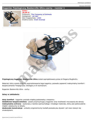 Informacje o produkcie Utworzono 02-03-2017 Kaganiec fizjologiczny Baskerville Ultra czarny - rozmiar 1 Cena : 36,99 zł m as co ta s Producent : The Company of Animals Dostępność : od ręki Stan magazynowy : niski Średnia ocena : brak recenzji Fizjologiczny kaganiec Baskerville Ultra został zaprojektowany przez dr Rogera Mugford'a. Materiał, który został użyty do wyprodukowania tego kagańca, pozwala zapewnić maksymalny komfort i bezpieczeństwo Twojego psa. Dostępny w 6 rozmiarach. Kaganiec Baskerville Ultra - cechy: łatwy w zakładaniu duży komfort - kaganiec posiada miękką podszewkę z neoprenu dodatkowe bezpieczeństwo - pasek przytrzymujący kaganiec oraz możliwość mocowania do obroży maksymalna ochrona - wykonany z bardzo wytrzymałego i trwałego materiału, który jest jednocześnie miękki i plastyczny w dotyku doskonała konstrukcja - unikalny ergonomiczny kształt pozwala psu dyszeć i pić oraz cieszyć się smakołykami. Wygenerowano w programie www.oscGold.com s co ta m as Kaganiec Baskerville Ultra jest dostępny w 6 rozmiarach - poniżej w tabeli podano informację o doborze rozmiaru. Kaganiec fizjologiczny Baskerville Ultra uwzględnia anatomię głowy psa i dzięki temu zapewnia maksymalne bezpieczeństwo i komfort. System zapięć gwarantuje utrzymanie kagańca zawsze na swoim miejscu. Kaganiec dzięki neopreonowej wyściółce jest bardzo wygodny i chroni przed otarciami kufy. Pies podczas noszenia kagańca może dyszeć, pić, a nawet można psa karmić. m as ZOBACZ FILM! co ta s Informacje o produkcie Kagańce Baskerville Ultra są dostępne w 6-ciu rozmiarach i są przeznaczone dla typowych dorosłych psów i suk. Dla młodych psów i suk należy dobrać kaganiec jeden rozmiar mniejszy. Ważne, aby kaganiec można było właściwie założyć. Pies po założeniu kagańca musi mieć możliwość swobodnego dyszenia. Nos psa nie powinien dotykać kagańca (zalecany 1 cm luzu). Tabela rozmiarów: rozmiar długość kufy (od czubka nosa do zewnętrznego kącika oka, mierzone z boku pyska) obwód kufy 1 8 cm 23 cm 2 10 cm 30 cm 3 11 cm 34 cm 4 12,5 cm 36,5 cm 5 14 cm 42 cm 6 14,5 cm 45 cm Zalecane rozmiary kagańcy Baskerville Ultra dla poszczególnych ras: Wygenerowano w programie www.oscGold.com m as rozmiar 3 Australian Cattle Dog Australian Shepherd Beagle Bearded Collie Border Collie Cocker (English) Corgi Hungarian Vizsla Irish Water Spaniel Keeshond Poodle Standard Rough Collie Saluki Schnauzer Scottish Terrier Welsh Terrier co ta rozmiar 2 American Cocker Basenji Bedlington Terrier Border Terrier Buhund Cairn Terrier Cavalier Spaniel Fox Terrier Jack Russell Lakeland Terrier Schnauzer Miniature Sheltie Shiba Inu West Highland White Whippet s rozmiar 1 Bichon Frisé Dachshund Miniature Dachshund Standard Maltese Terrier Norfolk/Norwich Terrier Poodle Toy Yorkshire Terrier rozmiar 4 Dalmatian Elkhound Kerry Blue Terrier Pointers Samoyed Soft Coated Wheaten Springer Spaniel Staff Bull Terrier co ta m as rozmiar 5 Afghan Hound Airedale Alaskan Malamute Basset Hound Belgian Shepherd Bernese MD Borzoi Briard Brittany Spaniel Bull Terrier Chow Chow Chesapeake Bay Retriever Dobermann English Setter Flat Coated Retriever Foxhound German Shepherd Golden Retriever Gordon Setter Greyhound Irish Setter Labrador Retriever Lurcher Maremma Sheepdog Munsterlander Old English Sheepdog Pharaoh Hound Ridgeback Siberian Husky Weimaraner s Informacje o produkcie rozmiar 6 American Staffordshire Bouvier Boxer Bull Mastiff Great Dane Irish Wolfhound Japanese Akita Mastiff Newfoundland Pit Bull Pyrenean MD Rottweiler Schnauzer Giant Kagańce nie są rekomendowane dla poniższych ras Boston Terrier Bulldog King Charles Spaniel Wygenerowano w programie www.oscGold.com m as co ta s Lhasa Apso Papillon Pekingese Pug St Bernard Shih Tzu