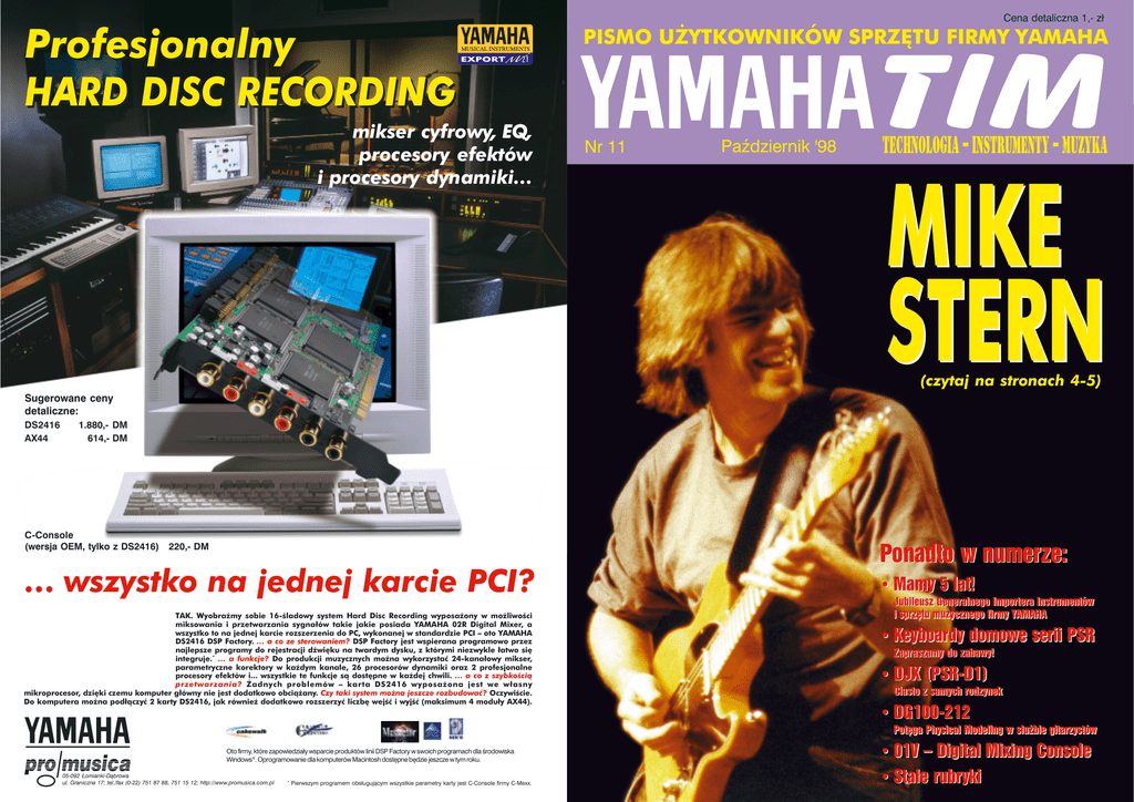 Cena detaliczna 1,- zł Profesjonalny HARD DISC RECORDING mikser cyfrowy, EQ, procesory efektów i procesory dynamiki… Nr 11 Październik '98 MIKE STERN (czytaj na stronach 4-5) Sugerowane ceny detaliczne: DS2416 AX44 1.880,- DM 614,- DM C-Console (wersja OEM, tylko z DS2416) 220,- DM Ponadto w numerze: … wszystko na jednej karcie PCI? TAK. Wyobraźmy sobie 16-śladowy system Hard Disc Recording wyposażony w możliwości miksowania i przetwarzania sygnałów takie jakie posiada YAMAHA 02R Digital Mixer, a wszystko to na jednej karcie rozszerzenia do PC, wykonanej w standardzie PCI – oto YAMAHA DS2416 DSP Factory. … a co ze sterowaniem? DSP Factory jest wspierana programowo przez najlepsze programy do rejestracji dźwięku na twardym dysku, z którymi niezwykle łatwo się integruje.* … a funkcje? Do produkcji muzycznych można wykorzystać 24-kanałowy mikser, parametryczne korektory w każdym kanale, 26 procesorów dynamiki oraz 2 profesjonalne procesory efektów i... wszystkie te funkcje są dostępne w każdej chwili. … a co z szybkością przetwarzania? Żadnych problemów – karta DS2416 wyposażona jest we własny mikroprocesor, dzięki czemu komputer główny nie jest dodatkowo obciążany. Czy taki system można jeszcze rozbudować? Oczywiście. Do komputera można podłączyć 2 karty DS2416, jak również dodatkowo rozszerzyć liczbę wejść i wyjść (maksimum 4 moduły AX44). • Mamy 5 lat! Jubileusz Generalnego Importera instrumentów i sprzętu muzycznego firmy YAMAHA • Keyboardy domowe serii PSR Zapraszamy do zabawy! • DJX (PSR-D1) Ciasto z samych rodzynek • DG100-212 Potęga Physical Modeling w służbie gitarzystów Oto firmy, które zapowiedziały wsparcie produktów linii DSP Factory w swoich programach dla środowiska Windows®. Oprogramowanie dla komputerów Macintosh dostępne będzie jeszcze w tym roku. 05-092 Łomianki-Dąbrowa ul. Graniczna 17; tel./fax (0-22) 751 87 88, 751 15 12; http://www.promusica.com.pl * Pierwszym programem obsługującym wszystkie parametry karty jest C-Console firmy C-Mexx. • 01V – Digital Mixing Console • Stałe rubryki Nr 11 Skromny jubileusz 5 lat działalności Generalnego Importera instrumentów i sprzętu muzycznego firmy YAMAHA To już 5 lat, od kiedy na scenie importerów polskiego rynku muzycznego pojawiła się firma ProMusica. Od początku swej działalności firma skupia swą działalność przede wszystkim na promocji i sprzedaży produktów jednej tylko firmy – YAMAHA. I nikogo kto zna, choć w ogólnym zarysie, profil produkcji tego giganta w przemyśle muzycznym, nie powinien dziwić ten fakt. Jak zwykle, początki nie były łatwe, tak jak niełatwy (i chwilami nieprzewidywalny) był nasz rynek. Trzeba przyznać, że import szerokiej gamy, często wysoce specjalistycznych produktów, to przedsięwzięcie nie lada. Wymagający, choć jednocześnie bardzo pomocny, partner zza zachodniej granicy (YAMAHA Europa) stale „podnosi poprzeczkę” i stawia przed firmą wciąż nowe zadania. Pozostaje to jednak w całkowitej zgodzie z kierunkami rozwoju, jakie postawili sobie na samym początku kierujący firmą Panowie: Jacek Łoziński i Marek Ostrowski. W ciągu tych kilku lat obserwowany jest faktycznie znaczny postęp, zaś znak firmowy YAMAHA kojarzy się dzisiaj każdemu jednoznacznie z produktami najwyższej jakości. Warto zaznaczyć, że firma ProMusica zawsze stawała frontem do Klienta. Znajduje to wyraz przede wszystkim w prowadzonej od kilku lat batalii o rozwój sieci profesjonalnie działających placówek handlowych na terenie całego kraju. Szczególną wagę firma przywiązuje do poziomu wiedzy sprzedawców, bowiem handel instrumentami i sprzętem muzycznym nie należy do zajęć łatwych. Temu celowi służy również wydawany od 3 lat (tak się szczęśliwie składa, że redakcja również obchodzi swój skromny jubileusz) biuletyn informacyjny YAMAHA-TIM, w którym na bieżąco staramy się informować Państwa o nowościach, tendencjach i wydarzeniach w świecie instrumentów i urządzeń YAMAHA. A dzieje się tu bardzo wiele. YAMAHA wprowadza nowe produkty, ale także (a raczej przede wszystkim) zupełnie nowe technologie. To właśnie poznanie i umiejętne wprowadzenie na rynek tychże technologii i produktów wymaga największego wysiłku ze strony importera. Dodajmy, że firma ProMusica, jako pierwsza w naszym kraju zdecydowała się również na profesjonalne tłumaczenia i opracowania polskojęzycznych instrukcji obsługi, dzięki którym Klienci mają znacznie mniej problemów z obsługą swoich instrumentów. Nie bez znaczenia pozostaje również stała obecność produktów YAMAHA w fachowej prasie muzycznej (Muzyk, Estrada i Studio, Gitara i Bas, Świat Gitary, Jazz Forum, Jazzi Magazine) i to zarówno w formie testów chętnie przeprowadzanych przez redakcje, jak i w postaci kolorowych stron informacyjnych, poświęconych wybranym instrumentom lub grupom towarowym. Pomysły na wyjście do Klienta nie kończą się jednak tylko na serwisie informacyjnym. Od lat ProMusica organizuje zakrojone na różną skalę prezentacje instrumentów i sprzętu muzycznego YAMAHA na terenie całego kraju. Jedną z ciekawszych „tras prezentacyjnych” były prowadzone w siedzibach wielu Akademii Muzycznych pokazy instrumentów dętych w przekroju nieosiągalnym dotychczas w żadnym z profesjonalnych sklepów. Firma 5-krotnie uczestniczyła również we wrocławskich Targach Muzycznych INTERMEDIA, a w ubiegłym roku zdecydowała się dodatkowo na zorganizowanie w Warszawie imprezy pod nazwą Dni Yamahy – wystawy, połączonej z prezentacjami i koncertami gwiazd polskiej sceny muzycznej. Dodajmy do tego wszystkiego aktywną działalność firmy na polu upowszechniania kultury muzycznej w ogóle: wsparcie dla zyskującego sobie coraz większą popularność programu Szkół Muzycznych YAMAHA w Polsce, prowadzenie na specjalnych warunkach (w oparciu o obowiązujące przepisy) importu 