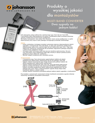 w w w . j o h a n s s o n . b e Produkty o wysokiej jakości dla montażystów MULTI BAND CONVERTER Dwa sygnały na jednym kablu! Jeśli planujemy zakup odbiornika satelitarnego typu Twin lub też Twin PVR, a posiadamy tylko doprowadzony od anteny standardowo jeden przewód antenowy stajemy wielokrotnie przed dużym problemem. My mamy rozwiązanie, nasz nowy Twin Receiver może zostać podłączony i w pełni wykorzystany przy użyciu tylko jednego istniejącego przewodu antenowego. Zalety: • Łatwa rozbudowa istniejącej instalacji antenowej poprzez doprowadzenie dwóch sygnałów z konwerterów Twin lub Quad, co daje nam możliwość podłączenia dodatkowego odbiornika satelitarnego lub też odbiornika typu Twin. Tego typu odbiorniki satelitarne umożliwiają dla przykładu nagrywanie jednego programu i jednoczesne oglądanie innego. • Istniejący kabel antenowy może być jeszcze bardziej wykorzystany. Nie jest nam potrzebny nowy dodatkowy kabel gdy chcemy w danym pomieszczeniu podłączyć drugi odbiornik satelitarny. • Montaż całego urzadzenia jest niezwykle prosty. Zastosowanie: • Z konwertera typu Twin dostarczamy sygnał jednym kablem do dwóch pojedyńczych odbiorników satelitarnych lub też do jednego Twin PVR. • Sygnał z dwóch konwerterów typu Single dostarczamy jednym kablem do dwóch pojedyńczych odbiorników satelitarnych. • Sygnał z dwóch konwerterów typu Twin (np. Astra/Hot Bird) połączonych poprzez przełącznik Diseqc (np. Johansson Ref.9920) przesłany jednym kablem umożliwa podłączenie dwóch odbiorników pojedyńczych lub też jednego typu Twin, które z wykorzystaniem sygnału diseqc będą miały możliwość odbioru z dwóch satelit. • Istnieje również możliwość przesyłania jednym kablem dwóch sygnałów z multiswitcha Przy każdym z powyższych zastosowań istnieje możliwość przesyłania sygnału telewizji naziemnej istniejącym przewodem antenowym. po przed ✗ RECEIVER TWIN LNB lub Quad Lnb STACKER 9640S Istniejący kabel DESTACKER 9640D TWIN RECEIVER/PVR FRANKRIJKLAAN 27 • B 8970 Poperinge • Belgia Tél.: +32(0)57 33 33 63 • Fax: +32(0)57 33 45 24 • [email protected] 03-2008 LNB Produkty o wysokiej jakości dla montażystów MULTI BAND CONVERTER Dwa sygnały na jednym kablu! w w w . j o h a n s s o n . b e dla jednego użytkownika Zastosawanie Konwerter Twin dla jednego użytkownika w systemie zbiorczym Multi Band Converter Johansson 9640S Konwerter Quattro Istniejący kabel Multi Band Converter Johansson 9640D Multiswitch • Johansson 5x8 Ref. 9951 • Johansson 5x6 Ref. 9947 • Johansson 5x4 Ref. 9943 • Johansson 5x2 (2 x Twin LNB) Ref. 9920 Twin Receiver / PVR n box HDTV recorder Twin PVR C+ Istniejący kabel SAT TV SAT TV TV-Sat Combiner Johansson Ref. 9501 Twin Receiver / PVR n box HDTV recorder Twin PVR C+ FRANKRIJKLAAN 27 • B 8970 Poperinge • Belgia Tél.: +32(0)57 33 33 63 • Fax: +32(0)57 33 45 24 • [email protected]