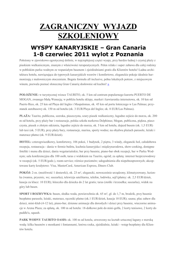ZAGRANICZNY WYJAZD SZKOLENIOWY WYSPY KANARYJSKIE – Gran Canaria 1-8 czerwiec 2011 wylot z Poznania Położony w zjawiskowo egzotycznej dolinie, w najcieplejszej części wyspy, przy bardzo ładnej i czystej plaży z piaskiem wulkanicznym, znanym z właściwości terapeutycznych. Pełen relaks i super zabawa dla całej rodziny w pobliskim parku wodnym ze wspaniałym basenem i zjeżdżalniami gratis dla Klientów hotelu! Ładna architektura hotelu, nawiązująca do typowych kanaryjskich wzorów i komfortowe, eleganckie pokoje idealnie harmonizują z malowniczym otoczeniem. Bogata formuła all inclusive, pełna lokalnych potraw, z miejscowym winem, pozwala poznać słoneczną Gran Canarię dosłownie od kuchni! » POŁOŻENIE: w turystycznej wiosce TAURITO, ok. 5 km od centrum popularnego kurortu PUERTO DE MOGAN, zwanego Małą Wenecją; w pobliżu hotelu sklepy, market i kawiarenka internetowa, ok. 10 km od Puerto Rico, ok. 25 km od Playa del Ingles i Maspalomas, ok. 45 km od portu lotniczego w Las Palmas; przystanek autobusowy ok. 150 m od hotelu (ok. 3 EUR/Playa del Ingles; ok. 8 EUR/Las Palmas). PLAŻA: Taurito, publiczna, szeroka, piaszczysta, szary piasek wulkaniczny, łagodne zejście do morza, ok. 200 m od hotelu, przy plaży bar i restauracje, polska szkoła nurkowa Delphinus; Mogan, publiczna, piękna, piaszczysta, piasek o złotym odcieniu, łagodne zejście do morza, ok. 5 km od hotelu, dojazd busem (ok. 1,5 EUR) lub taxi (ok. 5 EUR), przy plaży bary, restauracje, marina, sporty wodne; na obydwu plażach parasole, leżaki i materace płatne (ok. 9 EUR/dzień). HOTEL: czterogwiazdkowy, komfortowy, 106 pokoi, 1 budynek, 2 piętra, 3 windy, elegancki hol, całodobowa recepcja, restauracja - dania w formie bufetu, kuchnia kanaryjska i międzynarodowa, show-cooking, dostępne foteliki i menu dla dzieci, dania wegetariańskie; bar przy basenie, piano-bar obok recepcji, bar w Parku Wodnym; sala konferencyjna dla 100 osób, taras z widokiem na Taurito, ogród; za opłatą: internet bezprzewodowy w recepcji (ok. 5 EUR/godz.), room-service; różnice poziomów; udogodnienia dla niepełnosprawnych; akceptowane karty kredytowe: Visa, MasterCard, American Express, Diners Club. POKÓJ: 2-os. (możliwość 1 dostawki), ok. 23 m², elegancki, nowocześnie urządzony, klimatyzowany, łazienka (wanna, prysznic, wc; suszarka), telewizja satelitarna, telefon, lodówka, sejf (płatny: ok. 2,5 EUR/dzień, kaucja za klucz: 10 EUR); łóżeczko dla dziecka do 2 lat gratis; taras (stolik i krzesełka; suszarka), widok na góry lub basen. SPORT I ROZRYWKA: basen, słodka woda, powierzchnia ok. 65 m², gł. do 1,7 m, brodzik, przy basenie bezpłatne parasole, leżaki, materace, ręczniki płatne (ok.1 EUR/dzień, kaucja 10 EUR); sauna; plac zabaw dla dzieci, mini-klub (4-12 lat), piano-bar, dzienne animacje dla dorosłych i dzieci przy basenie, wieczorne animacje w Arena Plaza; za opłatą, ok. 100 m od hotelu: 18-dołkowe pole do mini-golfa, 2 korty tenisowe, 2 korty do paddle'a, squash. PARK WODNY TAURITO OASIS: ok. 100 m od hotelu, utworzony na kształt sztucznej laguny z morską wodą: kilka basenów z mostkami i fontannami, leniwa rzeka, zjeżdżalnie, leżaki - wstęp bezpłatny dla Klientów hotelu. ALL INCLUSIVE: śniadanie (8.00-10.30), obiad (13.30-15.00), kolacja (18.30-21.00) w formie bufetu w restauracji głównej; przekąski pomiędzy posiłkami (kanapki, hot dogi, pizza, lody) w barach; napoje bezalkoholowe: soki, woda, napoje chłodzące, kawa, herbata (7.00-23.30) i lokalne napoje alkoholowe: piwo, wino (11.00-23.00) w barach i restauracji; wymagane noszenie opasek all inclusive. Cena za osobę pokoju 2-osobowym Grupa 60-80 osób Hotel PARADISE COSTA TAURITO ****/ AI 2.700 zł - pokój dwuosobowy - 2.700,- zł od osoby - pokój jednoosobowy - 3.300,- zł. od osoby - dostawka w pokoju dwuosobowym - 2.500,- zł. - dziecko do lat 2 – bezpłatnie - dziecko od 2 do 12 lat – 1.290,- zł. Ceny zawierają: - przelot na trasie Poznań – Las Palmas - Poznań, - obowiązkową opłatę lotniskową (300 zł), - obowiązkową dopłatę transportową (220 zł), - transfery lotnisko – hotel – lotnisko klimatyzowanym autokarem, - zakwaterowanie: 7 noclegów w wybranym hotelu, pokoje dwuosobowe typu standard, - wyżywienie: all inclusive (AI), zgodnie z opisem w katalogu ofertą, - opieka polskiego rezydenta + opiekuna Państwa grupy, - ubezpieczenie KL i NW – 15.000€ / osoba, Ceny nie zawierają: - wycieczek lokalnych, - ewentualnej dopłaty do pokoju 1-osobowego (600 zł/ tydz.). WARUNKI UCZESTNICTWA W IMPREZIE: złożenie zgłoszenia, wyłącznie na załączonej karcie zgłoszenia, faxem, mailem lub złożenie go osobiście w Izbie do dnia 31 marca 2011 r. wraz z dowodem wpłaty zaliczki w wysokości 1.000,- zł. od osoby, na konto Okręgowej Izby Radców Prawnych w Poznaniu, ul. Chwaliszewo 69; 61-105 Poznań, nr 34 1090 1359 0000 0000 3501 8502 z dopiskiem w tytule: „WYSPY KANARYJSKIE” - dopłata pozostałej części należności do dnia 15 kwietnia 2011 r. również na konto OIRP w Poznaniu Osoby zainteresowane otrzymaniem faktury prosimy o wypełnienie danych potrzebnych do wystawienia faktury ( znajdujących się na karcie zgłoszenia ). O udziale decyduje kolejność zgłoszeń – ilość miejsc ograniczona !!! Tematyka szkolenia i osoba wykładowcy oraz godzina zbiórki i wylotu podane zostaną e-mailem lub telefonicznie w terminie późniejszym osobom zainteresowanym. - UWAGA!!! Z uwagi na obowiązujące Okręgową Izbę Radców Prawnych warunki umowy z Biurem Podróży Air Tours Poland Poznań Sp. z o. o. nieprzestrzeganie terminów wpłat należności może spowodować skreślenie z listy uczestników imprezy. KARTA ZGŁOSZENIA WYSPY KANARYJSKIE - Gran Canaria Hotel PARADISE COSTA TAURITO****/AI 01 – 08 czerwca 2011 roku Imię i nazwisko Data urodzenia Adres zamieszkania z numerem kodu Proszę podać preferowaną formę zakwaterowania : .................................