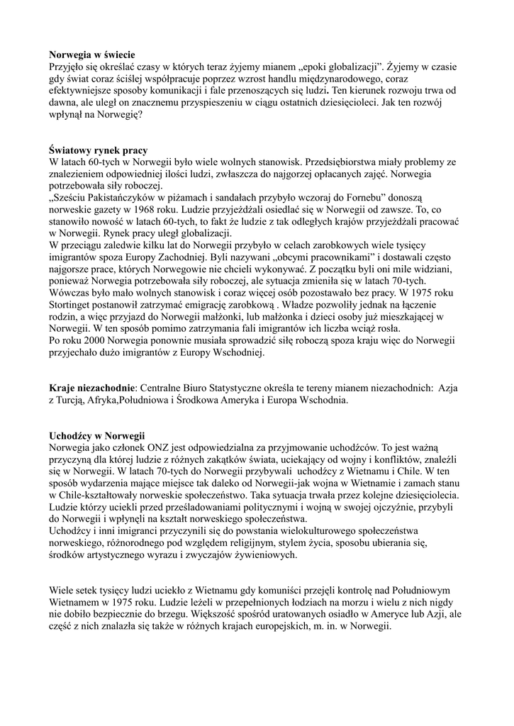Norwegia w świecie Przyjęło się określać czasy w których teraz żyjemy mianem „epoki globalizacji”. Żyjemy w czasie gdy świat coraz ściślej współpracuje poprzez wzrost handlu międzynarodowego, coraz efektywniejsze sposoby komunikacji i fale przenoszących się ludzi. Ten kierunek rozwoju trwa od dawna, ale uległ on znacznemu przyspieszeniu w ciągu ostatnich dziesięcioleci. Jak ten rozwój wpłynął na Norwegię? Światowy rynek pracy W latach 60-tych w Norwegii było wiele wolnych stanowisk. Przedsiębiorstwa miały problemy ze znalezieniem odpowiedniej ilości ludzi, zwłaszcza do najgorzej opłacanych zajęć. Norwegia potrzebowała siły roboczej. „Sześciu Pakistańczyków w piżamach i sandałach przybyło wczoraj do Fornebu” donoszą norweskie gazety w 1968 roku. Ludzie przyjeżdżali osiedlać się w Norwegii od zawsze. To, co stanowiło nowość w latach 60-tych, to fakt że ludzie z tak odległych krajów przyjeżdżali pracować w Norwegii. Rynek pracy uległ globalizacji. W przeciągu zaledwie kilku lat do Norwegii przybyło w celach zarobkowych wiele tysięcy imigrantów spoza Europy Zachodniej. Byli nazywani „obcymi pracownikami” i dostawali często najgorsze prace, których Norwegowie nie chcieli wykonywać. Z początku byli oni mile widziani, ponieważ Norwegia potrzebowała siły roboczej, ale sytuacja zmieniła się w latach 70-tych. Wówczas było mało wolnych stanowisk i coraz więcej osób pozostawało bez pracy. W 1975 roku Stortinget postanowił zatrzymać emigrację zarobkową . Władze pozwoliły jednak na łączenie rodzin, a więc przyjazd do Norwegii małżonki, lub małżonka i dzieci osoby już mieszkającej w Norwegii. W ten sposób pomimo zatrzymania fali imigrantów ich liczba wciąż rosła. Po roku 2000 Norwegia ponownie musiała sprowadzić siłę roboczą spoza kraju więc do Norwegii przyjechało dużo imigrantów z Europy Wschodniej. Kraje niezachodnie: Centralne Biuro Statystyczne określa te tereny mianem niezachodnich: Azja z Turcją, Afryka,Południowa i Środkowa Ameryka i Europa Wschodnia. Uchodźcy w Norwegii Norwegia jako członek ONZ jest odpowiedzialna za przyjmowanie uchodźców. To jest ważną przyczyną dla której ludzie z różnych zakątków świata, uciekający od wojny i konfliktów, znaleźli się w Norwegii. W latach 70-tych do Norwegii przybywali uchodźcy z Wietnamu i Chile. W ten sposób wydarzenia mające miejsce tak daleko od Norwegii-jak wojna w Wietnamie i zamach stanu w Chile-kształtowały norweskie społeczeństwo. Taka sytuacja trwała przez kolejne dziesięciolecia. Ludzie którzy uciekli przed prześladowaniami politycznymi i wojną w swojej ojczyźnie, przybyli do Norwegii i wpłynęli na kształt norweskiego społeczeństwa. Uchodźcy i inni imigranci przyczynili się do powstania wielokulturowego społeczeństwa norweskiego, różnorodnego pod względem religijnym, stylem życia, sposobu ubierania się, środków artystycznego wyrazu i zwyczajów żywieniowych. Wiele setek tysięcy ludzi uciekło z Wietnamu gdy komuniści przejęli kontrolę nad Południowym Wietnamem w 1975 roku. Ludzie leżeli w przepełnionych łodziach na morzu i wielu z nich nigdy nie dobiło bezpiecznie do brzegu. Większość spośród uratowanych osiadło w Ameryce lub Azji, ale część z nich znalazła się także w różnych krajach europejskich, m. in. w Norwegii. Rozmiłowani w podróżach Norwegowie W ciągu ostatnich czterdziestu lat imigranci wprowadzili świat do Norwegii. Jednocześnie jednak wielu Norwegów wyjeżdżało w świat właśnie w tym okresie. Wynikało to z lepszej kondycji finansowej, ale też z ciągle malejących cen podróży, szczególnie samolotem. Nowoczesne samoloty odrzutowe i wycieczki uczyniły tańszymi wyjazdy za granicę. Pierwsza wycieczka samolotem czarterowym z Norwegii odbyła się w 1959 roku. W 1960 roku około 20 tysięcy Norwegów wyleciało na wycieczki zagraniczne lotami czarterowymi, w 1984 roku uczyniło to już 490 tysięcy, a w 2005 roku zarejestrowano ponad 2 miliony pasażerów odbywających loty czarterowe z norweskich lotnisk. Oprócz wzrostu samych podróży, ludzie zaczęli też wyjeżdżać coraz dalej. Coraz bardziej zwyczajne stają się wyjazdy wakacyjne do Tajlandii czy Brazylii. Począwszy od lat 60-tych stale rosła liczba Norwegów podróżujących za granicę. Wszystkie nowe doznania przywozili oni ze sobą do Norwegii. Cały świat w salonie W latach 60-tych i 70-tych istniał tylko jeden norweski kanał telewizyjny, NRK i ludzie w większości oglądali te same programy. Sytuacja zmieniła się, gdy pozwolono montować prywatne anteny satelitarne. Coraz więcej rodzin sprawiało sobie takie anteny, aby oglądać zagraniczne programy telewizyjne. W miastach wiele gospodarstw domowych miało poprowadzony kabel telewizyjny, dający dostęp do takich kanałów jak brytyjski Sky Channel czy amerykańskie MTV. Z czasem pojawiły się też różne kanały norweskie. Teraz nie jest już tak, że „wszyscy” w Norwegii widzieli to samo w telewizji. Zamiast tego wielu czuje się częścią większej, międzynarodowej wspólnoty, poprzez możliwość oglądania tych samych programów informacyjnych, wideoklipów czy wydarzeń sportowych, co ludzie w innych częściach świata. W sieci ze światem Internet został przedstawiony w Norwegii w 1989 roku, a od pierwszej połowy lat 90-tych większość ludzi w Norwegii otrzymała dostęp do internetu. Internet ułatwił komunikację między ludźmi na drugim końcu kraju i kontynentu. Stało się wówczas możliwe na przykład dyskutowanie czy granie w sieci z ludźmi z innej części świata. Dlatego mówimy teraz że jesteśmy częścią „globalnej wioski”. Norwegia na światowym rynku Jeśli wejść do jakiegokolwiek sklepu spożywczego w Norwegii w 2008 roku, znajdzie się towary z każdego zakątka świata. Oczywistością stała się możliwość kupienia ryżu z Tajlandii czy zielonego groszku z