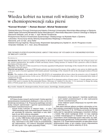 © Borgis Wiedza kobiet na temat roli witaminy D w chemioprewencji raka piersi *Konrad Wroński1, 2, Roman Bocian3, Michał Tenderenda1 Oddział Kliniczny Chirurgii Onkologicznej Katedry Onkologii Uniwersytetu Warmińsko-Mazurskiego w Olsztynie, Zakład Opieki Zdrowotnej Ministerstwa Spraw Wewnętrznych z Warmińsko-Mazurskim Centrum Onkologii w Olsztynie Kierownik Oddziału: prof. dr hab. n. med. Michał Tenderenda 2 Podyplomowe Studium Poradnictwa Żywieniowego i Dietetycznego na Wydziale Nauk o Żywieniu Człowieka i Konsumpcji Szkoły Głównej Gospodarstwa Wiejskiego w Warszawie Kierownik: prof. dr hab. Jerzy Keller 3 Oddział Chirurgii Ogólnej i Naczyniowej, Wojewódzki Specjalistyczny Szpital im. dra M. Pirogowa w Łodzi Ordynator Oddziału: dr n. med. Jerzy Okraszewski 1 THE WOMEN PATIENTS KNOWLEDGE ABOUT THE ROLE OF VITAMIN D IN CHEMOPREVENTION OF BREAST CANCER Summary Introduction. Breast cancer is a major health problem in all developed countries. Factors that increase the risk of breast cancer are: age, genetic predisposition, the number of births and dietary factors. Eating amounts of vitamin D has a protective effect in chemoprevention of breast cancer. Objectives. The objective of this research was to become aquainted with patients’ knowledge of the vitamin D role in the chemoprevention of breast cancer. Material and methods. A group of 200 female patients was interviewed by means of the author’s own survey in which specific tools were used to become aquainted with female patients’ knowledge of the vitamin D role in the chemoprevention of breast cancer. Results. The analysis of the results shows that 190 (95.0%) of respondents did not know about the protective role of vitamin D in breast cancer chemoprevention. In this survey 190 (95.0%) of respondents did not know what is the recommended daily intake of vitamin D in the diet. Conclusions. 1. Patients did not know about the role of vitamin D in chemoprevention of breast cancer. 2. Female patients were not aware of the need to consume the Recommended Dietary Allowance of vitamin D in the diet. 3. It is necessary to change the eating habits of Polish people due to reduce the number of new cases and deaths of civilization diseases. Key words: vitamin D, chemoprevention, breast cancer, knowledge, female patients WPROWADZENIE W Polsce liczba nowych zachorowań i liczba zgonów spowodowana nowotworami złośliwymi z roku na rok ma tendencję wzrostową (1-3). Przyczyną szybkiego wzrostu liczby nowych zachorowań i zgonów spowodowanych chorobami nowotworowymi są: – wzrost liczby ludności w naszym kraju – w roku 1950 populacja osób zamieszkujących obszar Polski wynosiła 25 milionów, natomiast w roku 2001 było to już 38,5 miliona obywateli, – wzrost w populacji liczby osób powyżej 65 roku życia – w roku 1965 liczba osób powyżej 65 roku życia wynosiła 2,1 miliona, co stanowiło 7% całej populacji, natomiast w roku 2001 liczby te przedstawiały się odpowiednio: 4,8 miliona obywateli powyżej 65 roku życia i 12% ogółu populacji Polski, Nowa Medycyna 3/2012 – stosowanie coraz lepszych i bardziej wyrafinowanych badań przesiewowych w celu wykrywania chorób nowotworowych, – coraz większe ryzyko ekspozycji na czynniki rakotwórcze (1). Rak piersi stanowi główny problem zdrowotny w krajach wysoko rozwiniętych Europy Zachodniej, Środkowej i Ameryki Północnej (1-3). W Polsce od końca lat 70. XX wieku jest to najczęściej występujący nowotwór złośliwy u kobiet. Rak piersi występuje około 1,5 razy częściej u kobiet mieszkających w miastach niż na wsi (4, 5). Czynnikami, które zwiększają ryzyko raka sutka, są: wiek, predyspozycje genetyczne, liczba porodów i czynniki dietetyczne (1-5). Przed zachorowaniem na raka piersi chroni zbilansowana dieta, w tym między innymi odpowiednia ilość spożywanej w diecie witaminy D (2-5). 47 Konrad Wroński, Roman Bocian, Michał Tenderenda CEL PRACY Celem pracy było zapoznanie się z wiedzą pacjentek na temat roli witaminy D w chemioprewencji raka piersi. MATERIAŁ I METODY Sondaż badający wiedzę pacjentek na temat roli witaminy D w chemioprewencji raka sutka został przeprowadzony w latach 2009-2010 wśród pacjentek Wojewódzkiego Specjalistycznego Szpitala im. dra Mikołaja Pirogowa w Łodzi. W celu przeprowadzenia badania przygotowano ankiety. Wypełnienie ankiety było przez pacjentkę dobrowolne i anonimowe. Kwestionariusz ankiety zawierał pytania zamknięte. Przed rozdaniem każdej ankiety pytano każdą pacjentkę, czy wyraża zgodę na udział w badaniu. Po otrzymaniu pozytywnej odpowiedzi wręczano ankietę do wypełnienia. Grupę badaną stanowiło 200 pacjentek przebywających w oddziałach i poradniach Wojewódzkiego Specjalistycznego Szpitala im. dra Mikołaja Pirogowa w Łodzi, które wyraziły zgodę i poprawnie wypełniły ankietę. Niezbędne obliczenia przeprowadzone zostały za pomocą pakietów: STATISTICA 7.1 i EXCEL 2008. Praca została przeprowadzona zgodnie z wymogami Deklaracji Helsińskiej. WYNIKI W badaniu uczestniczyło 200 pacjentek, z których dominujący wiek mieścił się w przedziale od 25 do 44 roku życia – tym wiekiem legitymowało się 87 (43,5%) ankietowanych pacjentek. W grupie ankietowanych pacjentek wykształceniem średnim legitymowały się 132 (66,0%) kobiety. Wśród 200 ankietowanych kobiet, 184 (92,0%) pacjentki pochodziły z miasta zamieszkanego przez więcej niż 500 000 mieszkańców (tab. 1). W przeprowadzonej ankiecie 190 (95,0%) respondentek nie wiedziało o chemioprewencyjnej roli witaminy D w raku sutka (ryc. 1). Wśród 200 ankietowanych kobiet, 10 (5,0%) słyszało o chemioprewencyjnej roli witaminy D. W wykonanym badaniu ankietowym 190 (95,0%) respondentek nie wiedziało, jakie jest zalecane dzienne spożycie witaminy D w diecie (ryc. 2). Wśród ankietowanych, 10 (5,0%) kobiet słyszało o zalecanym dobowym spożyciu witaminy D w diecie. 194 (97,0%) respondentki uznały, ż