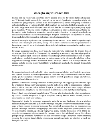 Zaczęło się w Croach Bix Ludzie bali się wędrować samotnie, nawet podróż z wioski do wioski była niebezpieczna. W każdej chwili można było natknąć się na patrol. Spotkanie z patrolem nigdy nie należało do przyjemnych. Zawsze mieli zasłonięte twarze, ubrani w kaptury lub maski i uzbrojeni głównie w miecze i łuki budzili popłoch już z daleka. Jeździli w grupie, po kilka osób, siejąc strach wśród napotkanych ludzi. Rzadko poruszali się w pojedynkę, nigdy poza miastem. W starciu z nimi zwykli, prości ludzie nie mieli żadnych szans. Można było na nich trafić dosłownie wszędzie - na ulicach dużych miast i w małych wioskach, na szlakach kupieckich i rzadko uczęszczanych drogach, można było ich spotkać i w lasach, i w górach. Ich głównym celem było sianie strachu i przerażenia. Pojawili się nagle błyskawicznie opanowując liczne miasta i wsie. Wkrótce podporządkowali sobie możnych tych ziem, którzy - w zamian za oferowane im bezpieczeństwo i bogactwa - rządzili już w ich imieniu. Pozostałych ludzi traktowano jak bezwolną, przerażoną masę. Pewnego deszczowego dnia, kiedy zapadał już zmierzch, nadjechali do Croach Bix od strony gór. Było ich sześciu. Zatrzymali się na nocleg w pierwszej napotkanej gospodzie. Wieść o tajemniczych jeźdźcach szybko rozniosła się wśród mieszkańców. Nikt nie przespał tej nocy spokojnie spodziewając się najgorszego, wielu nie odeszło od okien łudząc się jeszcze nadzieją. Wraz z nastaniem świtu nadzieja umarła - w stronę budynku zarządcy jechało sześciu czarnych jeźdźców w żelaznych maskach. Dla Croach Bix nastała nowa epoka… *** Po zapadnięciu zmierzchu uliczki i place miasteczka wyludniały się. Strażnicy pospiesznie zapalali latarnie, spóźnieni przechodnie chyłkiem umykali do swoich domów. Trzaskały głucho zamykane okiennice, przez szpary których przebijało skąpe oświetlenie. Życie w Croach Bix zamierało. Jeździec w masce na chwilę zatrzymał konia i popatrzył na zasypiające miasteczko. Tylko w jednym domu paliły się jeszcze światła. Zabudowa była tu rozproszona i skromniejsza niż w centrum, także jedyna droga w tych okolicach była zwyczajnym, ubitym pasmem ziemi. Znajdował się na obrzeżach miasteczka, za nim były tylko lasy i góry. Ruszył dalej, jego służba dobiegała końca. Wkrótce uda się do zajazdu, gdzie spędzi resztę czasu i przede wszystkim ściągnie uciążliwą maskę. Będzie wśród swoich, ludzie z miasteczka nie mieli tam wstępu. Wprowadził konia do stojącego naprzeciw zajazdu baraku. Wolnym, nieco ociężałym krokiem ruszył w kierunku jasno oświetlonego budynku. Pozdrowił niedbale zmierzającego w tym samym kierunku kompana. Ten mruknął niezrozumiale na pozdrowienie, jednak co innego zwróciło uwagę w jego postawie. Maska na głowie przekrzywiona była w nienaturalny sposób, spod niej wypływała jakby strużka brunatnej krwi, która następnie rozmazywała się na piersiach, tworząc sporej już wielkości plamę. Bez słowa przepuścił go przodem. Wydarzyło się coś nieoczekiwanego - pomyślał. Przymierzał się właśnie do otwarcia drzwi, kiedy z wewnątrz budynku doleciał go wściekły wrzask zebranych tam osób. * Ann siedziała przy zasłoniętym oknie i smutnym wzrokiem wpatrywała się w dopalającą świeczkę. Przygotowana do spania, w samej tylko koszuli, nie ruszała się jednak z miejsca. Wiedziała, że szybko nie zaśnie, tak było już od dłuższego czasu. O niczym nie myślała, pozwalała tylko by łzy mogły swobodnie płynąć po jej twarzy. Dopiero po długiej chwili, jakby zmęczona tym bezczynnym siedzeniem, kładła się spać. Wtedy dopiero mogła zasnąć. W dzieciństwie wszystko było inaczej. Każdą wolną chwilę spędzała poza domem, głównie na obrzeżach miasteczka, bawiąc się z rówieśnikami w wymyślone naprędce zabawy. Poznawali wtedy wszelkie zakamarki. Na wąskich, błotnistych ścieżkach urządzali zazwyczaj wyścigi; pośród krętych, brukowanych uliczek lubili oglądać sklepowe wystawy, wyobrażając sobie co kupią kiedy będą już dorosłymi ludźmi; na placu targowym często wałęsali się przy handlarzach w oczekiwaniu na darmowe smakołyki i łakocie - i tak beztrosko płynął dzień za dniem. Miała też swój prywatny, dziecięcy świat. W odróżnieniu od pozostałych, często lubiła przebywać sama. Wtedy udawała się zazwyczaj w okolice niewielkich ruin i tam przesiadywała godzinami, puszczając wodze fantazji o dawnej świetności tego miejsca. Dla większości był to ponury zakątek, głównie z powodu sąsiedztwa opuszczonego, starego cmentarzyska. Od niepamiętnych czasów nikt tam już nie grzebał zmarłych. Zachowały się jeszcze skromne, kamienne tablice, w większości z zatartymi przez czas napisami i kilkanaście większych, obrośniętych mchem głazów. Gdzieniegdzie fragmenty napisów były w miarę czytelne, jednak słowa które potrafiła odczytać były dla niej niezrozumiałe, tak jak niezrozumiałe były wyryte na kilku głazach znaki i symbole. Za ruinami i cmentarzyskiem stało kilka opuszczonych, miejscami rozwalających się baraków. To była najdalsza część miasteczka z tej strony, dalej ciągnęła się na wpół trawiasta równina i bagna. W oddali majaczyły nagie szczyty gór. To była również najrzadziej odwiedzana część Croach Bix. Z miasteczka nie prowadziła tu żadna ubita droga, od tej strony nie prowadziła również żadna droga do Croach Bix. Powoli teren ten zarastał wysokimi trawami i drzewami. * Ann leżała na słomianym posłaniu i wpatrywała się w sufit. Smutne oczy wędrowały po zawilgoconych balach, kłębowiskach pajęczyn, przenikających przez szpary ostatnich promieniach zachodzącego słońca. Życie w Croach Bix stawało się coraz trudniejsze. Kiedy przed kilkunastoma laty w miasteczku zaczęli pojawiać się pierwsi czarni jeźdźcy, wiadomo było, że nadchodzą c