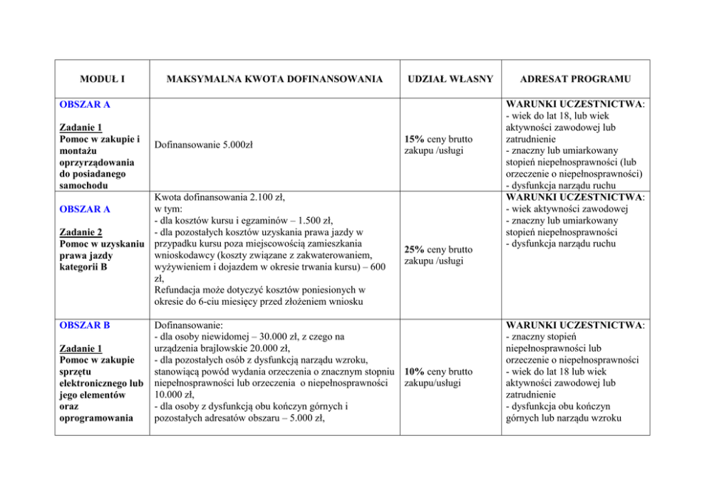 MODUŁ I MAKSYMALNA KWOTA DOFINANSOWANIA UDZIAŁ WŁASNY OBSZAR A Zadanie 1 Pomoc w zakupie i montażu oprzyrządowania do posiadanego samochodu Dofinansowanie 5.000zł Kwota dofinansowania 2.100 zł, w tym: OBSZAR A - dla kosztów kursu i egzaminów – 1.500 zł, - dla pozostałych kosztów uzyskania prawa jazdy w Zadanie 2 Pomoc w uzyskaniu przypadku kursu poza miejscowością zamieszkania wnioskodawcy (koszty związane z zakwaterowaniem, prawa jazdy wyżywieniem i dojazdem w okresie trwania kursu) – 600 kategorii B zł, Refundacja może dotyczyć kosztów poniesionych w okresie do 6-ciu miesięcy przed złożeniem wniosku OBSZAR B Zadanie 1 Pomoc w zakupie sprzętu elektronicznego lub jego elementów oraz oprogramowania 15% ceny brutto zakupu /usługi 25% ceny brutto zakupu /usługi Dofinansowanie: - dla osoby niewidomej – 30.000 zł, z czego na urządzenia brajlowskie 20.000 zł, - dla pozostałych osób z dysfunkcją narządu wzroku, stanowiącą powód wydania orzeczenia o znacznym stopniu 10% ceny brutto niepełnosprawności lub orzeczenia o niepełnosprawności zakupu/usługi 10.000 zł, - dla osoby z dysfunkcją obu kończyn górnych i pozostałych adresatów obszaru – 5.000 zł, ADRESAT PROGRAMU WARUNKI UCZESTNICTWA: - wiek do lat 18, lub wiek aktywności zawodowej lub zatrudnienie - znaczny lub umiarkowany stopień niepełnosprawności (lub orzeczenie o niepełnosprawności) - dysfunkcja narządu ruchu WARUNKI UCZESTNICTWA: - wiek aktywności zawodowej - znaczny lub umiarkowany stopień niepełnosprawności - dysfunkcja narządu ruchu WARUNKI UCZESTNICTWA: - znaczny stopień niepełnosprawności lub orzeczenie o niepełnosprawności - wiek do lat 18 lub wiek aktywności zawodowej lub zatrudnienie - dysfunkcja obu kończyn górnych lub narządu wzroku OBSZAR B Zadanie 2 Dofinansowanie szkoleń w zakresie obsługi nabytego w ramach programu sprzętu elektronicznego i oprogramowania OBSZAR C Zadanie 1 Pomoc w zakupie wózka inwalidzkiego o napędzie elektrycznym OBSZAR C Zadanie 2 Pomoc w utrzymaniu sprawności technicznej posiadanego wózka inwalidzkiego o napędzie elektrycznym Maksymalna kwota dofinansowania: - dla osoby głuchoniewidomej – 4.000 zł, - dla pozostałych adresatów obszaru – 2.000 zł, z możliwością zwiększenia kwoty dofinansowania w indywidualnych przypadkach, maksymalnie o 100%, wyłącznie w przypadku, gdy poziom dysfunkcji narządu wzroku wymaga zwiększenia liczby godzin szkolenia. Dofinansowanie 7.000 zł, z możliwością zwiększenia kwoty dofinansowania maksymalnie do 20.000 zł w indywidualnych przypadkach, wyłącznie w przypadku, gdy: - zwiększenie tej kwoty umożliwi zakup wózka dopasowanego do indywidualnych potrzeb zdrowotnych osoby niepełnosprawnej, będącej adresatem programu, oraz - celowość zwiększenia kwoty dofinansowania zostanie potwierdzona przez eksperta powołanego przez realizatora programu. Maksymalna kwota dofinansowania 2.000 zł Refundacja może dotyczyć kosztów poniesionych w okresie do 6-ciu miesięcy przed złożeniem wniosku ------ 10% ceny brutto zakupu/usługi -------- WARUNKI UCZESTNICTWA: - znaczny stopień niepełnosprawności lub orzeczenie o niepełnosprawności - wiek do lat 18 lub wiek aktywności zawodowej lub zatrudnienie - dysfunkcja obu kończyn górnych lub narządu wzroku WARUNKI UCZESTNICTWA: - znaczny stopień niepełnosprawności lub orzeczenie o niepełnosprawności - wiek do lat 18 lub wiek aktywności zawodowej lub zatrudnienie - dysfunkcje uniemożliwiające samodzielne poruszanie się za pomocą wózka inwalidzkiego o napędzie ręcznym WARUNKI UCZESTNICTWA: - znaczny stopień niepełnosprawności lub orzeczenie o niepełnosprawności OBSZAR C Zadanie 3 Pomoc w zakupie protezy kończyny, w której zastosowano nowoczesne rozwiązania techniczne Dofinansowanie: 1) zakupu protezy kończyny, w której zastosowano nowoczesne rozwiązania techniczne, 2) refundacja kosztów dojazdu adresata programu na spotkanie z ekspertem PFRON lub kosztów dojazdu eksperta PFRON na spotkanie z adresatem programu, Kwota dofinansowania dla protezy na III poziomie jakości, po amputacji: - w zakresie ręki – 9.000 zł, - przedramienia – 20.000 zł, - ramienia i wyłuszczeniu w stawie barkowym –26.000 zł, - na poziomie podudzia – 14.000 zł, - na wysokości uda (także przez staw kolanowy) –20.000 zł, - uda i wyłuszczeniu w stawie biodrowym – 25.000 zł, z możliwością zwiększenia kwoty dofinansowania w wyjątkowych przypadkach i wyłącznie wtedy, gdy celowość zwiększenia jakości protezy do poziomu IV (dla zdolności do pracy wnioskodawcy), zostanie zarekomendowana przez eksperta PFRON, Refundacja kosztów dojazdu adresata programu na spotkanie z ekspertem PFRON lub kosztów dojazdu eksperta PFRON na spotkanie z adresatem programu – w zależności od poniesionych kosztów, nie więcej niż 200zł. WARUNKI UCZESTNICTWA: - stopień niepełnosprawności - wiek aktywności zawodowej lub zatrudnienie - potwierdzona opinią eksperta PFRON stabilność procesu chorobowego - potwierdzone opinią eksperta PFRON rokowania uzyskania zdolności do pracy w wyniku wsparcia udzielonego w programie 10% ceny brutto zakupu/usługi OBSZAR C Zadanie 4 Pomoc w utrzymaniu sprawności technicznej posiadanej protezy kończyny OBSZAR D Pomoc w utrzymaniu aktywności zawodowej poprzez zapewnienie opieki dla osoby zależnej Dofinansowanie: 1) dofinansowanie lub refundacja kosztów utrzymania sprawności technicznej posiadanej protezy kończyny 2) refundacja kosztów dojazdu adresata programu na spotkanie z ekspertem PFRON lub kosztów dojazdu eksperta PFRON na spotkanie z adresatem programu, Kwota dofinansowania utrzymania sprawności dla protezy na III poziomie jakości, po amputacji: - w zakresie ręki – 2.700 zł, 10% ceny brutto - przedramienia – 6.000 zł, zakupu/usługi - ramienia i wyłuszczeniu w stawie barkowym – 7.800 zł, - na poziomie podudzia – 4.200 zł, - na wysokości uda (także prze