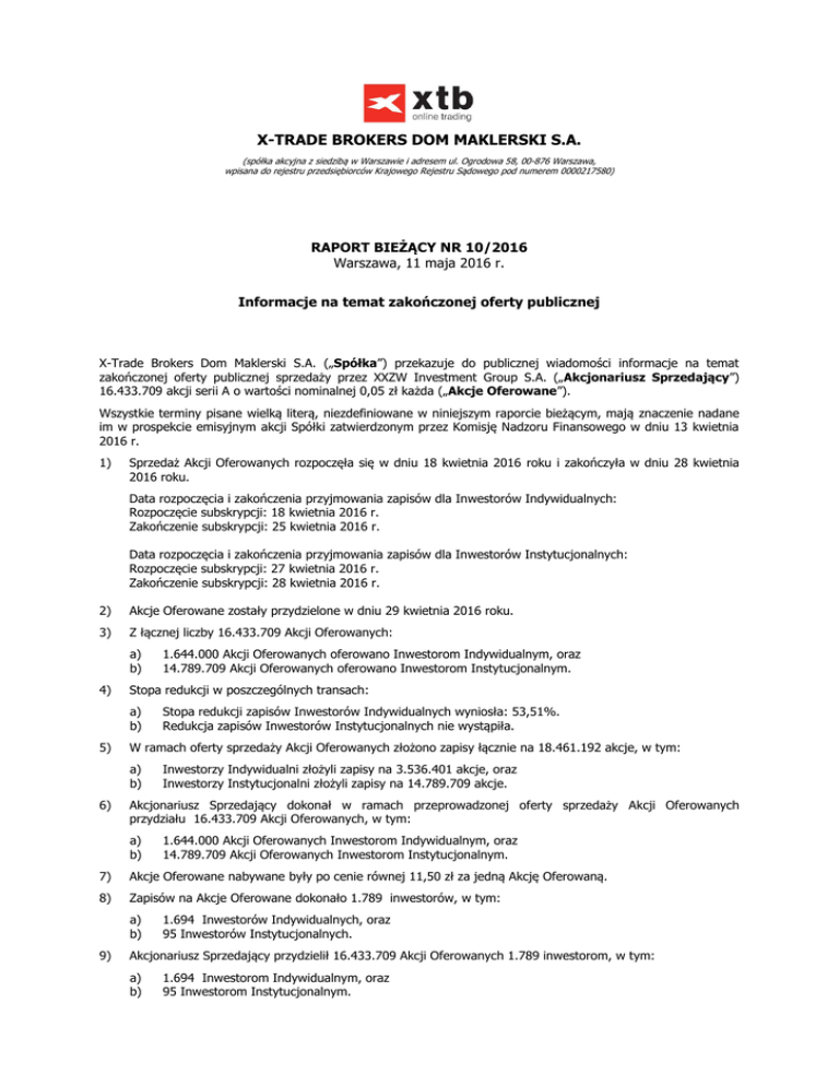 X-TRADE BROKERS DOM MAKLERSKI S.A. (spółka akcyjna z siedzibą w Warszawie i adresem ul. Ogrodowa 58, 00-876 Warszawa, wpisana do rejestru przedsiębiorców Krajowego Rejestru Sądowego pod numerem 0000217580) RAPORT BIEŻĄCY NR 10/2016 Warszawa, 11 maja 2016 r. Informacje na temat zakończonej oferty publicznej X-Trade Brokers Dom Maklerski S.A. („Spółka”) przekazuje do publicznej wiadomości informacje na temat zakończonej oferty publicznej sprzedaży przez XXZW Investment Group S.A. („Akcjonariusz Sprzedający”) 16.433.709 akcji serii A o wartości nominalnej 0,05 zł każda („Akcje Oferowane”). Wszystkie terminy pisane wielką literą, niezdefiniowane w niniejszym raporcie bieżącym, mają znaczenie nadane im w prospekcie emisyjnym akcji Spółki zatwierdzonym przez Komisję Nadzoru Finansowego w dniu 13 kwietnia 2016 r. 1) Sprzedaż Akcji Oferowanych rozpoczęła się w dniu 18 kwietnia 2016 roku i zakończyła w dniu 28 kwietnia 2016 roku. Data rozpoczęcia i zakończenia przyjmowania zapisów dla Inwestorów Indywidualnych: Rozpoczęcie subskrypcji: 18 kwietnia 2016 r. Zakończenie subskrypcji: 25 kwietnia 2016 r. Data rozpoczęcia i zakończenia przyjmowania zapisów dla Inwestorów Instytucjonalnych: Rozpoczęcie subskrypcji: 27 kwietnia 2016 r. Zakończenie subskrypcji: 28 kwietnia 2016 r. 2) Akcje Oferowane zostały przydzielone w dniu 29 kwietnia 2016 roku. 3) Z łącznej liczby 16.433.709 Akcji Oferowanych: a) b) 4) Stopa redukcji w poszczególnych transach: a) b) 5) Stopa redukcji zapisów Inwestorów Indywidualnych wyniosła: 53,51%. Redukcja zapisów Inwestorów Instytucjonalnych nie wystąpiła. W ramach oferty sprzedaży Akcji Oferowanych złożono zapisy łącznie na 18.461.192 akcje, w tym: a) b) 6) 1.644.000 Akcji Oferowanych oferowano Inwestorom Indywidualnym, oraz 14.789.709 Akcji Oferowanych oferowano Inwestorom Instytucjonalnym. Inwestorzy Indywidualni złożyli zapisy na 3.536.401 akcje, oraz Inwestorzy Instytucjonalni złożyli zapisy na 14.789.709 akcje. Akcjonariusz Sprzedający dokonał w ramach przeprowadzonej oferty sprzedaży Akcji Oferowanych przydziału 16.433.709 Akcji Oferowanych, w tym: a) b) 1.644.000 Akcji Oferowanych Inwestorom Indywidualnym, oraz 14.789.709 Akcji Oferowanych Inwestorom Instytucjonalnym. 7) Akcje Oferowane nabywane były po cenie równej 11,50 zł za jedną Akcję Oferowaną. 8) Zapisów na Akcje Oferowane dokonało 1.789 inwestorów, w tym: a) b) 9) 1.694 Inwestorów Indywidualnych, oraz 95 Inwestorów Instytucjonalnych. Akcjonariusz Sprzedający przydzielił 16.433.709 Akcji Oferowanych 1.789 inwestorom, w tym: a) b) 1.694 Inwestorom Indywidualnym, oraz 95 Inwestorom Instytucjonalnym. 10) W ramach wykonywania Umów o Gwarantowanie Oferty nie zostały przez Gwarantów Oferty nabyte żadne akcje Spółki. 11) Wartość przeprowadzonej oferty publicznej sprzedaży 16.433.709 Akcji Oferowanych wyniosła 189,0 mln zł. 12) Na dzień sporządzenia niniejszego raportu Spółka nie posiada informacji o ostatecznym rozliczeniu kosztów emisji. Koszty te zostaną podane do wiadomości publicznej w formie raportu bieżącego po otrzymaniu zestawienia i akceptacji wszystkich kosztów od podmiotów zaangażowanych w pracę nad przygotowaniem i przeprowadzeniem Oferty. 13) Na dzień sporządzenia niniejszego raportu Spółka nie posiada informacji o ostatecznym rozliczeniu kosztów emisji i w związku z tym nie jest znany średni koszt przeprowadzenia sprzedaży przypadający na jedną Akcję Oferowaną. Koszty te zostaną podane do wiadomości publicznej w formie raportu bieżącego po otrzymaniu zestawienia i akceptacji wszystkich kosztów od podmiotów zaangażowanych w pracę nad przygotowaniem i przeprowadzeniem Oferty. Podstawa prawna: Art. 56 ust. 1 pkt 2 lit. a) Ustawy z dnia 29 lipca 2005 r. o ofercie publicznej i warunkach wprowadzania instrumentów finansowych do zorganizowanego systemu obrotu oraz o spółkach publicznych w związku z § 33 ust. 1 Rozporządzenia Ministra Finansów z dnia 19 lutego 2009 r. w sprawie informacji bieżących i okresowych przekazywanych przez emitentów papierów wartościowych oraz warunków uznawania za równoważne informacji wymaganych przepisami prawa państwa niebędącego państwem członkowskim.
