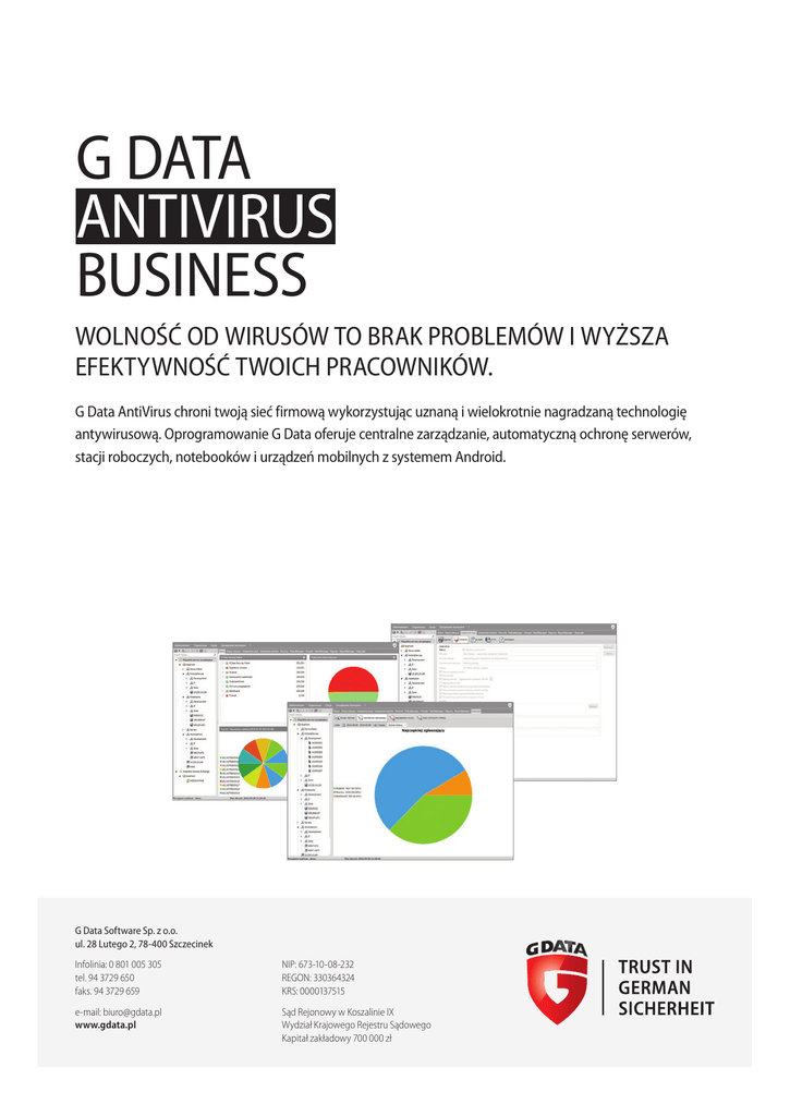G DATA ANTIVIRUS BUSINESS WOLNOŚĆ OD WIRUSÓW TO BRAK PROBLEMÓW I WYŻSZA EFEKTYWNOŚĆ TWOICH PRACOWNIKÓW. G Data AntiVirus chroni twoją sieć firmową wykorzystując uznaną i wielokrotnie nagradzaną technologię antywirusową. Oprogramowanie G Data oferuje centralne zarządzanie, automatyczną ochronę serwerów, stacji roboczych, notebooków i urządzeń mobilnych z systemem Android. G Data Software Sp. z o.o. ul. 28 Lutego 2, 78-400 Szczecinek Infolinia: 0 801 005 305 tel. 94 3729 650 faks. 94 3729 659 NIP: 673-10-08-232 REGON: 330364324 KRS: 0000137515 e-mail: [email protected] www.gdata.pl Sąd Rejonowy w Koszalinie IX Wydział Krajowego Rejestru Sądowego Kapitał zakładowy 700 000 zł Doskonała ochrona serwerów i stacji roboczych Technologia hybrydowa CloseGap najlepsza ochrona dzięki ochronie proaktywnej oraz maksymalnie aktualnym bazom sygnatur G Data BankGuard 2.0 bezpieczna bankowość bez potrzeby instalowania zbędnych dodatków do przeglądarki Kontrola zachowania obrona przed nieznanymi zagrożeniami, szkodnikami, wirusami Antywirus dla Linuxa ochrona stacji roboczych z systemem Linux w sieci firmowej Centralne zarządzanie Prosta administracja i przejrzysty interfejs zdalne instalacje, skanowanie i zarządzanie klientami w sieci Raport instalacji status oraz historia dotychczasowych instalacji Zaprojektowany na nowo dashboard intuicyjne okno do przeglądu wszelkich istotnych informacji o systemie wraz z podpowiedziami kontekstowymi Zdalne administrowanie zarządzaj siecią z okna przeglądarki na urządzeniu mobilnym korzystając z zabezpieczonego połączenia Synchronizacja z Active Directory odwzorowanie struktury organizacyjnej i automatyczna instalacja klientów Mobile Device Management centralne zarządzenie urządzeniami mobilnymi z Androidem w sieci firmowej - funkcje antykradzieżowe, kontrola instalowanych aplikacji, filtr połączeń Katalog sprzętu i oprogramowania zestawienie wykorzystywanych urządzeń i zainstalowanego oprogramowania w sieci firmowej Aktualizacje i pomoc techniczna darmowa aktualizacja do najnowszej wersji programu w ramach licencji oraz polskojęzyczna pomoc techniczna na wypadek kłopotów Moduły opcjonalne APPROVED Business Product OCT 2013 Wymagania programów MailSecurity centralny filtr spamu i zagrożeń (SMTP/POP3) dla dowolnego serwera poczty - Exchange, Domino itp. Zawiera plug-in dla MS Exchange od wersji 2007 do 2013 Centralne kopie zapasowe zabezpieczaj oraz zarządzaj danymi w sieci firmowej PatchManagement centralne zarządzanie aktualizacjami oprogramowania na stacjach klienckich Antywirus dla Mac kompleksowa ochrona dla komputerów z systemem Mac OS w Twojej sieci G Data Security Client, ManagementServer, G Data MailSecurity (32/64 bit): Windows 8/7/Vista/XP (tylko 32 bit), Windows Server 2003/2008/2012, od 1 GB RAM G Data MailSecurity (MS Exchange Plugin, 64 bit): Microsoft Exchange 2007/2010/2013 Android jest znakiem towarowym Google Inc. Użycie tego znaku wymaga uzyskania zgody Google Inc. Microsoft®, Windows®, Windows Vista™, Windows®8 i Windows®7 są znakami towarowymi Microsoft Corporation zastrzeżonymi w USA i/lub innych krajach.