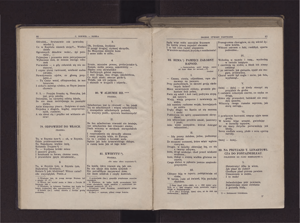 66 C. NORWID. — DZIEŁA Odrodek... Brutusowie cóż powiedzą miedni'), Co w Kapitolu niszach stoją?!... Wielkie dzieło Ogromnych dziadów wola!... śpi poto mek!... — Pojmujesz i prawemu mnie patrycjuszowi Wybaczasz dziś, że miecza starego odlomek Porwałem — a gdy człowiek się nie za stanowi, I czyste piersi twórczość, wielkość cudza zdraźni, Nawoływania ojców, co głoszą przy jaźni...)) — Tu Cezar wstał, ((Nieprawdaż, że noc lazurowa I cicha?» mówiąc ((Jedno, co Rzym jeszcze chowa!» P. S. — Przyjm fraszkę tę, Henryku, jak jest, przy ostatku Dziennika, na ojczystej odbitą bibule, Bo nie mam zacniejszego na pamiątki statku, Anim klasyczny pisarz... Dośpiewa ci czule Niejedną z długich, bogdaj nieprzerwa nych, rozmów; A nie smuć się i prędko też widzenie od nów! 79. ODPOWIEDŹ DO WŁOCH. FRASZKA. 1. Tu, w Rzymie tym ) — oh, w Rzymie, Gdzie przebronzowana Na Napoleona wielkie imię, Kolumna Trajana ») — Tu — Irydjona krótki miecz I pancerz grecki, I katakumb tu łzawa, ciemna rzecz, I prawników język zdradziecki... 2 3. Oh, Irydjona, Irydjona 0 potęgi drugiej, wyższej skrzydle, Bo Masynissa dziejów kona 1 samo sidło w sidle... 4. Straże, mieczów pewne, pretorjańskie ')> Rozum, siebie pewny, zakończony — Błędne oczy słowiańskie I Galilejczyk gdzieś męczony... I moc druga, moc druga, młodzieńcza, Co Atyli znaki, smocze garla a ), Wzięła, jak nić pajęcza, I złamała w kręgach i odparła... 80. W ALBUMIE HR. *** FRASZKA. I. Szlachectwo jest to równość — bo, jeżeli Się na szlachetnych i więcej szlachetnych I niezupełnie szlachetnych podzieli, To wszyscy podli... synowie bezdzietnych! II. Bo bez szlachectwa równość nie istnieje, Ani szlachectwa bez równości niema; Duch wieczny w mrokach staropolskich dnieje I rozpromienia się skrzydły obiema. I czasy przyjdą takie, że Europa, Co tu i owdzie o foremki wola. Będzie jak koło kruszwickiego chłopa, A ramię boże jak oś tego koła' 81. KWIRYTY! 3 ). FRASZKA. «Ne sutor ultra Crepidam» «).. 2. 67 DROBNE UTWORY POETYCZNE Tu, w Rzymie tym, w Rzymie tym, Białowłosy Słowianie, Koturn') jaki kładziesz? Witasz czćm? «Że zwyciężyłeś, Panie...» Na Bo Nie Ale każdą iskrę rzucam się, jak osa, nie ukaja mię żaden uczynek — potrafiłbym narysować nosa, mam szlafrok i ciepły kominek. 1) Wiadomo jest, źe posąg starego Brutusa byl z miedzi. (P. P.). 2) Wiersz ten wysiał poeta w liście z Paryża 29 listopada 1851 r. 3 ) Wiadomo, że kolumna Vendóme jest kopjq ko lumny trajanowej albo antonjuszowej. (P. P.). 4 ) koturn (or.), rodzaj obuwia z bardzo grubą podeszwą. 1) pretorianie (łac.), gwardia przyboczna cezarów rzymskich. 2) Wiadomo, źe hufce Alylli prowadzone były przez chorążych, znaki smoków z rozwartemi pa szczami noszących. (P. P.). 3) kwiryci, tytuł Rzymian, posiadających pełne obywatelstwo. 4) (łac.) — szewcze, pilnuj swego kopyta. Przeogromna chorągiew, co się wśród dy Będę więc sobie szerokim frazesem mów koleba, Na każdą pracę napadał obcesem Włóczni ostrzem o łuki, rzekłbyś, oparta I te lub owe radził ulepszenia podniebne... W krainie natchnień, krytyką z natchnienia! IV. Wchodzą w wąwóz i toną... wychodzą 82. BEMA ) PAMIĘCI ŻAŁOBNY w światło księżyca RAPSOD. I czernieją na niebie, a blask ich zimny «...Iusiurandum, patri datum, usque omusnął ad hanc diem ita servavi...» ). I po ostrzach, jak gwiazda, spaść nie mo Annibal. gąca, prześwićca. I. Chorał ucichł był nagle i znów, jak fala,, wyplusnął... — Czemu, cieniu, odjeżdżasz, ręce zła mawszy na pancerz, V. Przy pochodniach, co skrami grają około twych kolan? Dalej — dalej — aż kiedy stoczyć się Miecz wawrzynem zielony, gromnic pła przyjdzie do grobu kaniem dziś polan, I czeluście zobaczym czarne, co czyha za Rwie się sokół i koń twój podrywa stopę, drogą, jak tancerz. Wieją, wieją proporce i zawiewają na Które aby przesadzić, ludzkość nie znaj dzie sposobu, siebie, Włócznią twego rumaka zeprzem, jak Jak namioty ruchome wojsk, koczujących starą ostrogą... po niebie. Trąby długie we łkaniu aż się zanoszą VI. i znaki Pokłaniają się zgóry opuszczonemi skrzy I powleczeni korowód, smęcąc ujęte snem dłami, grody, Jak włóczniami przebite smoki, jaszczury W bramy bijąc urnami, gwizdając i ptaki, w szczerby toporów, Jako wiele pomysłów, któreś dościgał Aż się mury Jerycha porozwalają jak włóczniami... kłody, Serca zmdlałe ocucą, pleśń z oczu zgarną II. narody. — Idą panny żałobne, jedne, podnosząc ramiona Dalej — dalej... Ze snopami wonnemi, które wiatr wgórze rozrywa, Drugie, w konchy zbierając łzę, co się z twarzy odrywa, 83. NA PRZYJAZD T. LENARTOWI Inne, drogi szukając, choć przed wiekami CZA DO FONTAINEBLEAU. zrobiona... POLECENIE GO PANU BOHDANOWI 0. Inne, tłukąc o ziemię wielkie gliniane na czynia, 1. Czego klekot w pękaniu jeszcze smętności przyczynia. Złotostruny! Albo ja wiem, Jak pisać do ciebie? III. Choćbym pisał piórem pawiem Chłopcy biją w topory, pobłękitniale od Umaczanem w niebie, nieba, . I to mało! W tarcze, rude od świateł, biją pachołki służebne, Jedwabniejsze piór powianie, Błękitniejsze znasz otchłanie 1) Bem Józef (1791—1850), w r. 1831 major artylerji, W r. 1849 nieugięty wódz powstania węgier Z gwiazdą białą... 1 2 skiego w Siedmiogrodzie. 2 ) — (Inc.) Przysięgi, danej ojcu, aż do dziś tak dochowałem... Hanibal. i) *= Bohdanowi Zaleskiemu. 5*