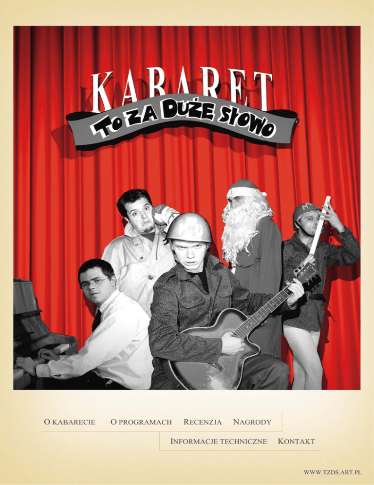O KABARECIE O PROGRAMACH RECENZJA NAGRODY INFORMACJE TECHNICZNE KONTAKT WWW.TZDS.ART.PL O KABARECIE Jako kabaret zadowalamy wszystkich. Zarówno naszych zwolenników jak i zatwardziałych antagonistów. Wygraliśmy kilka imprez ku uciesze tych pierwszych, natomiast tych drugich zadowoliliśmy nie wygrywając kilku innych. Obie grupy są nam bardzo za ten fakt wdzięczne. Wielu zadaje sobie pytanie dlaczego robimy kabaret. Możemy na nie odpowiedzieć w sposób jednoznaczny i nie budzący niezdrowych emocji. Odpowiedź jest prosta - przyczyn jest wiele. Stanowimy grupę ludzi różnych od siebie, jak i różnych jako grupa od wszystkiego wokół. N AGRODY Kabaret „To za Duże słowo” jest laureatem wielu festiwali kabaretowych. I nagroda przeglądu kabaretów PaKA, Kraków 2004 Ponadto kabaret otrzymał: - nagrodę publiczności - nagrodę za najlepszy rekwizyt - nagrodę specjalną - wyróżnienie aktorskie dla Daniela Sędy I nagroda Kabaretowej Ligii Dwójki (TVP2), Kraków 2005 I nagroda kabaretowego festiwalu pozytywnej kultury Studenckiej Wrocek 2004 Ponadto kabaret otrzymał: - nagrodę publiczności I nagroda na IX Ogólnopolskim Festiwalu Sztuki Słowa „Czy to jest kochanie..?”, Elbląg 2005 WWW.TZDS.ART.PL O PROGRAMACH Program „We mgle po łydki” – czas trwania: ok. 40 minut Kabaret TzDs powstał w palarni Wydziału Nauk Społecznych Uniwersytetu Śląskiego w lutym 2003 roku. Dokładnie. Skutkiem tego palaczami są bohaterowie naszych skeczy, a także nasza muszka maskotka, którą można spotkać na stronie internetowej kabaretu www.tzds.art.pl. Kabaret TzDs wyszedł z okopów, ale dalej jest na offie. Takim demonstracyjnym offie ze skreczami. A na PACE jak raz przypadkowo straciliśmy orientację, to od razu nas wrobili w jakieś nagrody. Trzeba uważać. Lubimy Martynę Jakubowicz za niezły float, hip-hop life style za dystans, filmy Davida Lynch’a za lekkość przekazu i Szopena za hardcore formy. W wolnych chwilach jesteśmy zapalonymi zielarzami. A niektórzy z nas kiszą, ale nie kapustę. Nie lubimy clubbingu, chyba ze podlewany bograczem w sosie a’ la Masłowska. Program „Za Drzwiami” – czas trwania: ok. 30 minut Czy można wierzyć, że istnieje granica oddzielająca życie na scenie od codziennego bytu? Poznać siebie w innej rzeczywistości? Czy żyjemy w stanie simulacrum? Dlaczego krowa daje mleko? Czy media kreują rzeczywistość? Dlaczego drzwi się nie domykają? Na te i inne pytania może znajdziesz odpowiedź oglądając nowy program kabaretu To za Duże słowo. Gdy dzień niszczy noc, a noc dzieli dzień zostaje nam tylko jedno wyjście. Program „MIX” – czas trwania: ok. 80 minut MIX to kompilacja „We mgle po łydki” oraz „Za Drzwiami” wzbogacona nowymi skeczami, które powstają na potrzeby trzeciego programu o roboczym tytule „Testament”. Czyli spodziewać się należy czegoś w rodzaju "best-off", ale bardziej "off" niz "best". WWW.TZDS.ART.PL R ECENZJE Recenzja Wyższej Szkoły Promocji w Warszawie Program „We mgle po łydki”, 10 maja 2004 Kabaret To za Duże słowo powstał 2 lata temu. Mimo tak niewielkiego (z racji czasu istnienia) doświadczenia radzi sobie całkiem dobrze. Najlepszym tego dowodem jest zajęcie pierwszego miejsca na XX Przeglądzie PaKA 2004. Kabaret TzDs ma na swoim koncie także wiele wyróżnień i atrakcyjnych nagród oraz dowodów uznania konkurencji. W skład kabaretu wchodzi pięciu utalentowanych studentów różnych wydziałów. Każdy z nich jest indywidualistą i specjalistą w swojej dziedzinie, ale mimo to na scenie tworzą zgrany zespół. Program, który prezentują, jest dość zróżnicowany, ale mimo to bardzo spójny. Zastosowano tu coś w rodzaju miksowania, które robi świetne wrażenie na widzach. Nie zdradzę, czego dotyczyły skecze, ale przeglądając biografię każdego z aktorów, umieszczoną na ich stronie, można dostrzec związek tematyki poruszanej w skeczach z życiem poza sceną. Podsumowując - mamy do czynienia ze świeżym, intrygującym programem, który jest wynikiem połączenia sprawności intelektualnej, okraszonej humorem, i przyzwoitej gry aktorskiej. Najlepszą rekomendacją powinien być werdykt zacnego jury PaKI 2004. Dominik Markowski WWW.TZDS.ART.PL I NFORMACJE TECHNICZNE Kabaret stosuje w obu programach wyciemnienia. Wymagania dotyczące oświetlenia: - światło białe sceniczne - światło czerwone sceniczne - reflektor punktowy - możliwość wyciemnienia sceny Wymagania dotyczące nagłośnienia: - 4 mikrofony dynamiczne na statywach - 2 mikrofony pojemnościowe - 1 mikrofon dynamiczny bezprzewodowy - przynajmniej jeden sceniczny monitor odsłuchowy - nastrojone i nagłośnione pianino/fortepian, ew. keyboard (6 oktaw + pedał) - linia do gitary akustycznej (jack) - odtwarzacz CD Pozostałe wymagania techniczne: - 2 popielniczki, nóż, talerz, widelec - dwie butelki/puszki z piwem - cztery krzesła oraz stolik na scenie - opona samochodowa bez felgi - oświetlone lampką kulisy (zastawki sceniczne) - garderoba, a w niej napoje zimne i gorące K OSZT Koszt występu jest niezależny od jego długości. Maksymalny czas trwania występu to 80 minut. Występy biletowane: Występy zamknięte, formowe: 2 tys. zł. brutto (UoD) + koszty podróży 3 tys. zł. brutto (UoD) + koszty podróży K ONTAKT Więcej informacji na stronie internetowej: www.tzds.art.pl TADEUSZ DULIAN, menadżer 501 263 565 [email protected] MACIEJ MICHALSKI, członek kabaretu 600 264 747 [email protected] WWW.TZDS.ART.PL