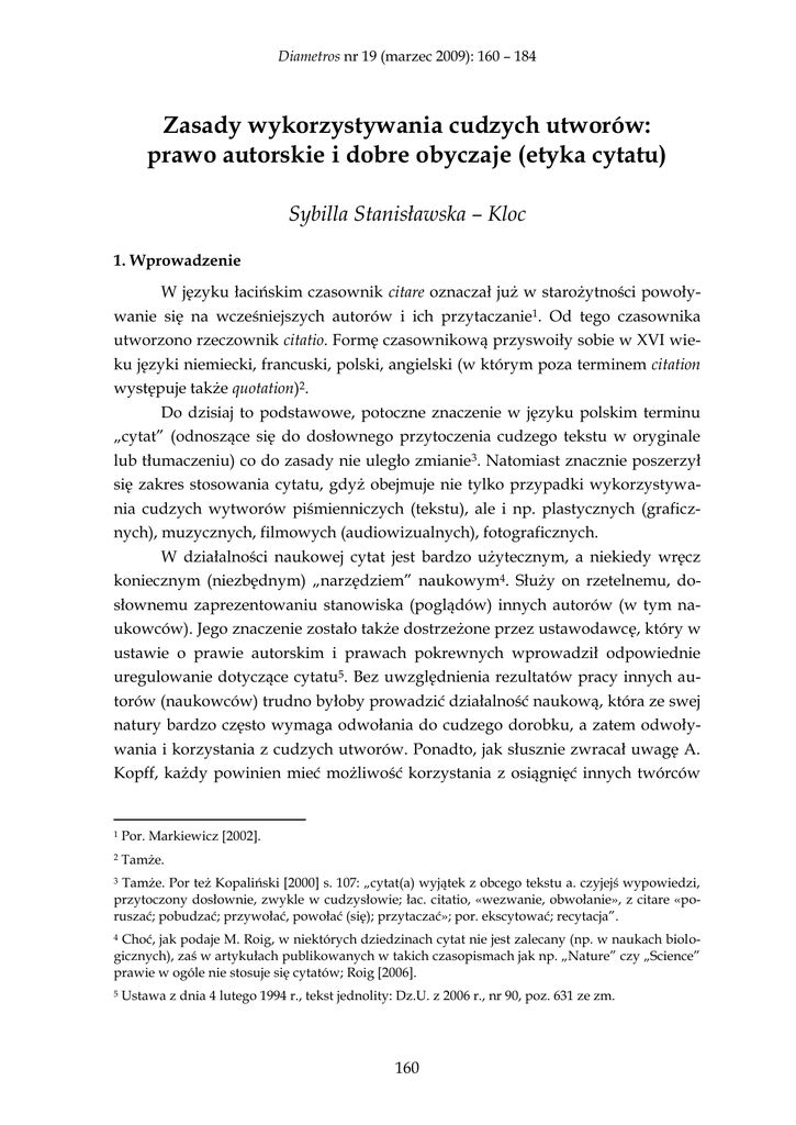 Diametros nr 19 (marzec 2009): 160 – 184 Zasady wykorzystywania cudzych utworów: prawo autorskie i dobre obyczaje (etyka cytatu) Sybilla Stanisławska – Kloc 1. Wprowadzenie W języku łacińskim czasownik citare oznaczał już w starożytności powoływanie się na wcześniejszych autorów i ich przytaczanie1. Od tego czasownika utworzono rzeczownik citatio. Formę czasownikową przyswoiły sobie w XVI wieku języki niemiecki, francuski, polski, angielski (w którym poza terminem citation występuje także quotation)2. Do dzisiaj to podstawowe, potoczne znaczenie w języku polskim terminu „cytat” (odnoszące się do dosłownego przytoczenia cudzego tekstu w oryginale lub tłumaczeniu) co do zasady nie uległo zmianie3. Natomiast znacznie poszerzył się zakres stosowania cytatu, gdyż obejmuje nie tylko przypadki wykorzystywania cudzych wytworów piśmienniczych (tekstu), ale i np. plastycznych (graficznych), muzycznych, filmowych (audiowizualnych), fotograficznych. W działalności naukowej cytat jest bardzo użytecznym, a niekiedy wręcz koniecznym (niezbędnym) „narzędziem” naukowym4. Służy on rzetelnemu, dosłownemu zaprezentowaniu stanowiska (poglądów) innych autorów (w tym naukowców). Jego znaczenie zostało także dostrzeżone przez ustawodawcę, który w ustawie o prawie autorskim i prawach pokrewnych wprowadził odpowiednie uregulowanie dotyczące cytatu5. Bez uwzględnienia rezultatów pracy innych autorów (naukowców) trudno byłoby prowadzić działalność naukową, która ze swej natury bardzo często wymaga odwołania do cudzego dorobku, a zatem odwoływania i korzystania z cudzych utworów. Ponadto, jak słusznie zwracał uwagę A. Kopff, każdy powinien mieć możliwość korzystania z osiągnięć innych twórców 1 Por. Markiewicz [2002]. 2 Tamże. Tamże. Por też Kopaliński [2000] s. 107: „cytat(a) wyjątek z obcego tekstu a. czyjejś wypowiedzi, przytoczony dosłownie, zwykle w cudzysłowie; łac. citatio, «wezwanie, obwołanie», z citare «poruszać; pobudzać; przywołać, powołać (się); przytaczać»; por. ekscytować; recytacja”. 3 Choć, jak podaje M. Roig, w niektórych dziedzinach cytat nie jest zalecany (np. w naukach biologicznych), zaś w artykułach publikowanych w takich czasopismach jak np. „Nature” czy „Science” prawie w ogóle nie stosuje się cytatów; Roig [2006]. 4 5 Ustawa z dnia 4 lutego 1994 r., tekst jednolity: Dz.U. z 2006 r., nr 90, poz. 631 ze zm. 160 Sybilla Stanisławska – Kloc Zasady wykorzystywania cudzych utworów… (poprzedników), którzy przecież także nie tworzyli w pustce, ale „nawiązywali do zastanego dorobku wiedzy i sztuki”6. Cytat o czym jeszcze będzie mowa poniżej – jest chyba tą właśnie formą dozwolonego użytku utworów (art. 29 pr. aut.), która najpełniej realizuje (i obrazuje) potrzebę wyważenia, z jednej strony interesów autorów, a z drugiej – użytkowników, w celu zapewnienia rozwoju nauki oraz upowszechniania nauki, postępu cywilizacyjnego7, jak i swobody wypowiedzi (w tym wypowiedzi naukowej). Swoboda ta została zagwarantowana w art. 54 Konstytucji RP, art. 19 Powszechnej Deklaracji Praw Człowieka oraz art. 10 Konwencji o Ochronie Praw Człowieka i Podstawowych Wolności8. Wolność cytowania służy realizacji idei wolności wypowiedzi. Ponadto ostatnio problematyka cytatu, a właściwie należałoby powiedzieć zasad oznaczania cytowanego utworu, w związku z licznymi występującymi w praktyce nieprawidłowościami nabiera coraz większego znaczenia w kontekście zjawiska plagiatu. W mojej ocenie nieprzypadkowo Umberto Eco w opracowaniu pt. Jak napisać pracę dyplomową. Poradnik dla humanistów w tytule jednego z podrozdziałów używa w następującej kolejności terminów: cytat, parafraza, plagiat 9. Pomimo istotnych zasadniczych różnic pomiędzy tymi terminami, w praktyce nieoznaczone (lub niewłaściwie oznaczone) fragmenty cudzych utworów stanowią znaczną liczbę pośród przypadków plagiatów. Do uczynionego powyżej wyliczenia można jeszcze dodać dwa terminy: zapożyczenie oraz autoplagiat, które wiążą się z omawianą problematyką i wzmiankowane będą w dalszej części opracowania. Przywołane na wstępie kwestie stanowią tylko wycinek z bogatej, szeroko rozumianej problematyki prawnej cytatu10. Sygnalizując rozważania dotyczące sfery etycznej cytatu rozpocznę od odwołania do zabawnego i zarazem przekornego aforyzmu „Przykazanie XI: Nie cudzysłów”11. Nie grzeszmy zatem korzysta6 Grzybowski, Kopff, Serda [1973] s. 159. „Celem umożliwienia, by twórczość naukowa miała jak najbardziej społeczny charakter, by przyczyniła się do postępu poprzez jak najobszerniejsze poznanie, opracowanie i zużytkowanie dzieł już istniejących”. Ritterman [1937] s. 101. 7 Por. Dimmich [2008]. Na temat relacji między prawem autorskim i prawami człowieka (zwłaszcza w kontekście swobody wypowiedzi) por. Torremans [2008]; por. też Kolasiński [2008] s. 741 i n. 8 9 Eco [2007] s. 204. Choć równocześnie należy zauważyć, że np. plagiat który stanowi naruszenie prawa autorskiego jest przecież także przypadkiem nieuczciwości akademickiej, jednym z najbardziej nieetycznych zachowań pracownika naukowego. 10 Które, jak podaje Markiewicz [2002] s. 156, sformułowali niezależnie od siebie Hugon Steinhaus i Stanisław Jerzy Lec. 11 161 Sybilla Stanisławska – Kloc Zasady wykorzystywania cudzych utworów… jąc z cudzej twórczości, ale cytujmy innych autorów, używając ich utworów w należyty, uczciwy sposób. W związku z masowym, odbywającym się na dużą skalę i bardzo zróżnicowanym korzystaniem z cudzej twórczości (głównie, choć już nie tylko piśmienniczej) w działalności naukowej, oprócz regulacji prawnych, także normy etyczne, i odwołujące się do nich dobre obyczaje naukowe odgrywają istotną rolę przy wyznaczaniu granic dopuszczalnego cytatu. Co więcej, jak postaram się wskazać