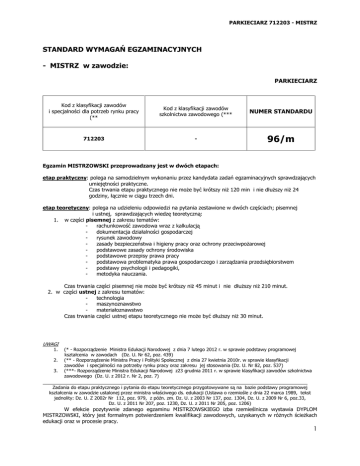 PARKIECIARZ 712203 - MISTRZ STANDARD WYMAGAŃ EGZAMINACYJNYCH - MISTRZ w zawodzie: PARKIECIARZ Kod z klasyfikacji zawodów i specjalności dla potrzeb rynku pracy (** Kod z klasyfikacji zawodów szkolnictwa zawodowego (*** NUMER STANDARDU 712203 - 96/m Egzamin MISTRZOWSKI przeprowadzany jest w dwóch etapach: etap praktyczny: polega na samodzielnym wykonaniu przez kandydata zadań egzaminacyjnych sprawdzających umiejętności praktyczne. Czas trwania etapu praktycznego nie może być krótszy niż 120 min i nie dłuższy niż 24 godziny, łącznie w ciągu trzech dni. etap teoretyczny: polega na udzieleniu odpowiedzi na pytania zestawione w dwóch częściach; pisemnej i ustnej, sprawdzających wiedzę teoretyczną: 1. w części pisemnej z zakresu tematów: rachunkowość zawodowa wraz z kalkulacją dokumentacja działalności gospodarczej rysunek zawodowy zasady bezpieczeństwa i higieny pracy oraz ochrony przeciwpożarowej podstawowe zasady ochrony środowiska podstawowe przepisy prawa pracy podstawowa problematyka prawa gospodarczego i zarządzania przedsiębiorstwem podstawy psychologii i pedagogiki, metodyka nauczania. Czas trwania części pisemnej nie może być krótszy niż 45 minut i nie dłuższy niż 210 minut. 2. w części ustnej z zakresu tematów: technologia maszynoznawstwo materiałoznawstwo Czas trwania części ustnej etapu teoretycznego nie może być dłuższy niż 30 minut. UWAGI 1. 2. 3. (* - Rozporządzenie Ministra Edukacji Narodowej z dnia 7 lutego 2012 r. w sprawie podstawy programowej kształcenia w zawodach (Dz. U. Nr 62, poz. 439) (** - Rozporządzenie Ministra Pracy i Polityki Społecznej z dnia 27 kwietnia 2010r. w sprawie klasyfikacji zawodów i specjalności na potrzeby rynku pracy oraz zakresu jej stosowania (Dz. U. Nr 82, poz. 537) (***- Rozporządzenie Ministra Edukacji Narodowej z23 grudnia 2011 r. w sprawie klasyfikacji zawodów szkolnictwa zawodowego (Dz. U. z 2012 r. Nr 2, poz. 7) _________________________________________________________________________________________ Zadania do etapu praktycznego i pytania do etapu teoretycznego przygotowywane są na bazie podstawy programowej kształcenia w zawodzie ustalonej przez ministra właściwego ds. edukacji (Ustawa o rzemiośle z dnia 22 marca 1989, tekst jednolity: Dz. U. Z 2002r Nr 112, poz. 979, z późn. zm. Dz. U. z 2003 Nr 137, poz. 1304, Dz. U. z 2009 Nr 6, poz.33, Dz. U. z 2011 Nr 207, poz. 1230, Dz. U. z 2011 Nr 205, poz. 1206) W efekcie pozytywnie zdanego egzaminu MISTRZOWSKIEGO izba rzemieślnicza wystawia DYPLOM MISTRZOWSKI, który jest formalnym potwierdzeniem kwalifikacji zawodowych, uzyskanych w różnych ścieżkach edukacji oraz w procesie pracy. 1 PARKIECIARZ 712203 - MISTRZ Od Mistrza, osoby posiadającej Dyplom mistrzowski, wymagana jest wiedza i umiejętności związane z wykonywaniem zawodu, w warunkach zatrudnienia lub samodzielnie prowadzonej działalności gospodarczej oraz szkolenia pracowników, w tym pracowników młodocianych i uczniów wyrażające się kompetencjami dotyczącymi: • • • • • • • • • • • • • • • • • • • • samodzielnego, prawidłowego wykonywania prac przypisanych dla danego zawodu - kompleksowe wykonanie określonych przedmiotów lub usługi, organizowania stanowiska pracy, organizowania pracy w małej firmie i nadzór nad wykonywaniem prac w ramach powierzonego odcinka - planowanie i nadzorowanie pracy zespołu pracowniczego, planowania, organizowania i nadzorowania przebiegu procesów technologicznych związanych z wytworzeniem produktu lub wykonaniem usługi, odpowiedzialności za personel: zarządzanie i kierowanie zespołem pracowniczym zaangażowanym do wykonania określonego produktu lub usługi, wykonywania pracy i zadań zgodnie z zasadami; bezpiecznej i higienicznej pracy oraz ochrony przeciwpożarowej, stosowania zasad równości traktowania pracowników ze względu na płeć, wiek i narodowość, wykonywania pracy zgodnie z zasadami ochrony środowiska naturalnego -wykonywanie zawodu w ramach procesu wytwarzania produktów lub świadczenia usług w większym lub mniejszym stopniu wpływa na środowisko naturalne np. zagospodarowywanie odpadów, postępowanie z odpadami niebezpiecznymi, posługiwania się; dokumentacją techniczną, normami, instrukcjami obsługi, poradnikami oraz innymi materiałami źródłowymi, dotyczącymi prac wykonywanych w obrębie danego zawodu, regulacji prawnych związanych z samodzielnym prowadzeniem działalności gospodarczej, zatrudnianiem i szkoleniem pracowników, projektowania nowych wzorów produktów oraz modyfikacji procesu świadczenia usług, postawy i postępowania w sytuacjach kryzysowych i nietypowych pojawiających się w zespole pracowniczym, radzenia sobie w sytuacjach nietypowych, wynikających np. na tle problemu technicznego, technologicznego lub organizacyjnego w trakcie procesu wytwarzania lub świadczenia usługi, oceny sytuacji w firmie lub na powierzonym odcinku pracy i formułowanie wniosków i propozycji odnośnie niezbędnych zmian, wykonywania zadań nietypowych – specyficzne zamówienia wymagające dużego doświadczenia, umiejętności i wiedzy z zakresu danego zawodu, odpowiedzialności za współtworzenie wizerunku firmy lub zespołu pracowniczego, udzielania instruktażu i doradztwa związanego z doskonaleniem zawodowym pracowników wewnątrz firmy i poprzez uczestnictwo w różnych formach edukacji ustawicznej, otwartości i gotowości do formułowania własnej ścieżki doskonalenia zawodowego poprzez udział w różnych formach edukacji ustawicznej, ocena pracy i motywacja personelu, zasad współżycia społecznego i etyki zawodowej. Wyspecyfikowane oczekiwania od mistrza są weryfikowane poprzez: określone warunki dopuszczenia do egzaminu mistrzowskiego (wykształcenie ogólne i zawodowe oraz doświadczenie zawodowe) oraz wymagania egzaminacyjne zawarte w procedurach przeprowadzania egzaminu mistrzowskiego. 1.PROFIL UMIEJĘTNOŚCI Mist