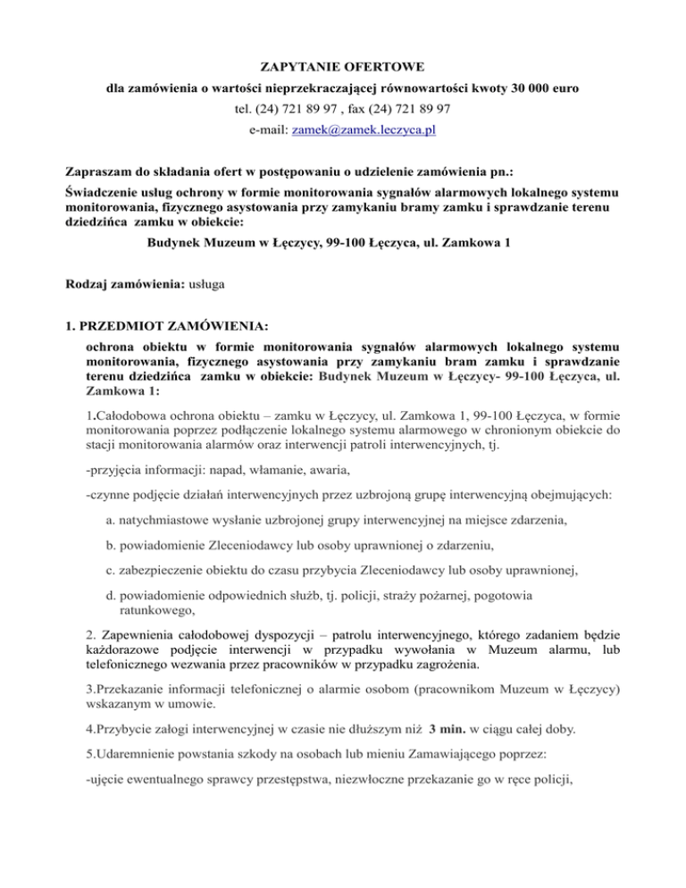 ZAPYTANIE OFERTOWE dla zamówienia o wartości nieprzekraczającej równowartości kwoty 30 000 euro tel. (24) 721 89 97 , fax (24) 721 89 97 e-mail: [email protected] Zapraszam do składania ofert w postępowaniu o udzielenie zamówienia pn.: Świadczenie usług ochrony w formie monitorowania sygnałów alarmowych lokalnego systemu monitorowania, fizycznego asystowania przy zamykaniu bramy zamku i sprawdzanie terenu dziedzińca zamku w obiekcie: Budynek Muzeum w Łęczycy, 99-100 Łęczyca, ul. Zamkowa 1 Rodzaj zamówienia: usługa 1. PRZEDMIOT ZAMÓWIENIA: ochrona obiektu w formie monitorowania sygnałów alarmowych lokalnego systemu monitorowania, fizycznego asystowania przy zamykaniu bram zamku i sprawdzanie terenu dziedzińca zamku w obiekcie: Budynek Muzeum w Łęczycy- 99-100 Łęczyca, ul. Zamkowa 1: 1.Całodobowa ochrona obiektu – zamku w Łęczycy, ul. Zamkowa 1, 99-100 Łęczyca, w formie monitorowania poprzez podłączenie lokalnego systemu alarmowego w chronionym obiekcie do stacji monitorowania alarmów oraz interwencji patroli interwencyjnych, tj. -przyjęcia informacji: napad, włamanie, awaria, -czynne podjęcie działań interwencyjnych przez uzbrojoną grupę interwencyjną obejmujących: a. natychmiastowe wysłanie uzbrojonej grupy interwencyjnej na miejsce zdarzenia, b. powiadomienie Zleceniodawcy lub osoby uprawnionej o zdarzeniu, c. zabezpieczenie obiektu do czasu przybycia Zleceniodawcy lub osoby uprawnionej, d. powiadomienie odpowiednich służb, tj. policji, straży pożarnej, pogotowia ratunkowego, 2. Zapewnienia całodobowej dyspozycji – patrolu interwencyjnego, którego zadaniem będzie każdorazowe podjęcie interwencji w przypadku wywołania w Muzeum alarmu, lub telefonicznego wezwania przez pracowników w przypadku zagrożenia. 3.Przekazanie informacji telefonicznej o alarmie osobom (pracownikom Muzeum w Łęczycy) wskazanym w umowie. 4.Przybycie załogi interwencyjnej w czasie nie dłuższym niż 3 min. w ciągu całej doby. 5.Udaremnienie powstania szkody na osobach lub mieniu Zamawiającego poprzez: -ujęcie ewentualnego sprawcy przestępstwa, niezwłoczne przekazanie go w ręce policji, zabezpieczenie obiektu do czasu przybycia Zamawiającego, -zapobieganie kradzieży i interwencyjnych, dewastacji mienia zgodnie z instrukcją działania grup -w razie zbrojnego napadu, rabunku Wykonawca podejmuje wszelkie mieszczące się w granicach prawa działania zmierzające do eliminacji zagrożenia oraz współdziała z policją. 6.-Sprawdzanie przez grupę interwencyjną, przed zamknięciem wewnętrznej bramy zamku, terenu całego dziedzińca pod względem obecności turystów, -Uczestniczenie grupy interwencyjnej w zamykaniu bramy wewnętrznej i zewnętrznej zamku po zakończeniu pracy w Muzeum. 7.Każde wywołanie alarmu spowoduje przyjazd patrolu interwencyjnego. 8.Firma posiada na terenie miasta Łęczycy samochód przystosowany do monitorowania przez załogi interwencyjne. 9.Firma nie będzie zlecać innym podmiotom wykonywania umowy, bez pisemnej zgody Zamawiającego. 10. Firma musi przestrzegać postanowień wynikających z Planu Ochrony Muzeum w Łęczycy w części dotyczącej monitorowania sygnałów alarmowych wraz z grupą interwencyjną. 11.Firma posiada własną stację monitorowania, spełniającą wymagania określone przez Komendanta Głównego Policji w metodyce uzgadniania Planów Ochrony. 2. SPOSÓB UZYSKANIA INFORMACJI DOTYCZĄCYCH PRZEDMIOTU ZAMÓWIENIA : Szczegółowe informacje dotyczące przedmiotu zamówienia można uzyskać osobiście w siedzibie Zamawiającego - Muzeum w Łęczycy, ul. Zamkowa 1, zamek- III piętro,pierwszy pokój po prawej stronie lub telefonicznie pod numerem tel. 024 721 89 97. Pracownikami uprawnionymi do kontaktów z wykonawcami są: Andrzej Borucki - Dyrektor Muzeum w Łęczycy 3. TERMIN WYKONANIA ZAMÓWIENIA: Rozpoczęcie z dniem 01.01.2017 r. Zakończenie 31.12.2017 r. 4. OFERTA WINNA ZAWIERAĆ: 1) prawidłowo wypełniony druk -FORMULARZ OFERTOWY, 2) aktualne: koncesję na wykonywanie działalności gospodarczej w zakresie ochrony osób i mienia realizowanych w formie bezpośredniej ochrony fizycznej i zabezpieczenia technicznego oraz pozwolenie (decyzja) na broń na okaziciela -status SUFO (kserokopie poświadczone za zgodność z oryginałem przez Wykonawcę), 3) oświadczenie, 4) zaakceptowany projekt umowy wraz z załącznikiem nr 1 do umowy. 5. OPIS SPOSOBU WYBORU OFERTY NAJKORZYSTNIEJSZEJ: Oferta z najniższą łączną ceną brutto podaną w formularzu ofertowym, złożonym przez Wykonawcę, spełniającego określone w pkcie 4 oferty wymagania zostanie wybrana jako oferta najkorzystniejsza. 6. MIEJSCE I TERMIN SKŁADANIA OFERT: Oferty należy składać w siedzibie Muzeum w Łęczycy, 99-100 Łęczyca, ul. Zamkowa 1,zamek- III piętro, pierwszy pokój po prawej stronie osobiście lub pocztą w terminie do dnia 22.11.2016 roku do godz. 11.00. 7. INFORMACJA O WYBORZE NAJKORZYSTNIEJSZEJ OFERTY: Informacja o wyborze najkorzystniejszej oferty zawierająca: nazwę (firmę), siedzibę i adres Wykonawcy, którego ofertę wybrano zostanie opublikowana na stronie internetowej www.bip.leczyca.info.pl. 8. INFORMACJA O TERMINIE I MIEJSCU PODPISANIA UMOWY: Informacja o terminie i miejscu podpisania umowy zostanie przekazana pisemnie Wykonawcy, którego ofertę wybrano. Łęczyca, dnia 10.11.2016 r.