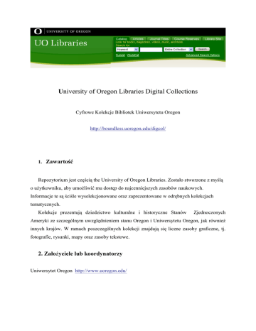 University of Oregon Libraries Digital Collections Cyfrowe Kolekcje Bibliotek Uniwersytetu Oregon http://boundless.uoregon.edu/digcol/ 1. Zawartość Repozytorium jest częścią the University of Oregon Libraries. Zostało stworzone z myślą o uŜytkowniku, aby umoŜliwić mu dostęp do najcenniejszych zasobów naukowych. Informacje te są ściśle wyselekcjonowane oraz zaprezentowane w odrębnych kolekcjach tematycznych. Kolekcje prezentują dziedzictwo kulturalne i historyczne Stanów Zjednoczonych Ameryki ze szczególnym uwzględnieniem stanu Oregon i Uniwersytetu Oregon, jak równieŜ innych krajów. W ramach poszczególnych kolekcji znajdują się liczne zasoby graficzne, tj. fotografie, rysunki, mapy oraz zasoby tekstowe. 2. ZałoŜyciele lub koordynatorzy Uniwersytet Oregon http://www.uoregon.edu/ 3. Krótka historia projektu Celem projektu jest ułatwienie uŜytkownikom dostępu do naukowych zasobów. W 2000 roku pojawił się pomysł stworzenia cyfrowych kolekcji bibliotek Uniwersytetu Oregon. Do 2002 roku stworzono oraz wdroŜono projekt. W październiku 2002 roku Metadata Implementation Group zajęło się obsługą techniczną projektu. 4. Kolekcje Repozytorium udostępnia tylko kilka kolekcji. Niektóre z nich mają ograniczony dostęp np. Art Images. • Art Images • Athletics and the Academy • Historical Photograph Collection • Percent for Art • Picturing the Cayuse, Walla Walla and Umatilla Tribes • Ulmann Photograph Collection • University of Oregon Office of the President • University of Oregon's Scholars' Bank • Western Waters Digital Library: The Columbia River Basin in Oregon • e-Asia Digital Library • Northwest Digital Archive • School of Journalism and Communications Advertising Archive • UO Channel Do najciekawszych naleŜą: • Athletics and the Academy – udostępnia historyczne dokumenty, zdjęcia, przedmioty osobiste, nagrania audiowizualne sławnych sportowców w dziedzinie lekkoatletyki na Uniwersytecie Oregon. • University of Oregon's Scholars' Bank – gromadzi dokumenty powstałe w wyniku działalności naukowej pracowników Uniwersytetu Oregon, a takŜe studentów. Obejmuje artykuły, raporty, czasopisma, biuletyny, projekty studenckie, materiały konferencyjne i raporty z badań. Kolekcja liczy ok. 5480 pozycji. • University of Oregon Office of the President – prezentuje spuściznę po 21 rektorach UO od 1876 roku. Kolekcja oczekuje na uzupełnienie. 5. Interfejs Interfejs w języku angielskim. KaŜda kolekcja stanowi odrębną całość, dlatego część z nich posiada własny interfejs. Tylko 9 kolekcji posiada ten sam mechanizm wyszukiwawczy. Przykład na podstawie Historical Photograph Collection: Wykorzystuje system CONTENTdm, który umoŜliwia wyszukiwanie oraz przeglądanie zawartości kolekcji. a). Przeglądanie – funkcja „browse” - moŜliwe jest wg obrazu, kolekcji, fotografa, przedmiotu, miejsca wydania. b). Wyszukiwanie – funkcja „search” • poprzez wszystkie pola - moŜna wyszukiwać poprzez: zawiera wszystkie słowa, zawiera dokładną frazę, zawiera dowolne słowo z frazy, nie zawiera słowa. • poprzez wybrane pola - moŜna wyszukiwać poprzez: zawiera wszystkie słowa, zawiera dokładną frazę, zawiera dowolne słowo z frazy, nie zawiera słowa. Źródło: http://boundless.uoregon.edu/cgi-bin/advsearch.exe [odczyt: 15.09.2007] Istnieje moŜliwość wyboru kolekcji, w której chcemy wyszukać określonej informacji. 6. Metadane System CONTENTdm wykorzystuje system metadanych - Dublin Core. źródło: http://boundless.uoregon.edu/cgibin/viewer.exe?CISOROOT=/Bestof&CISOPTR=100&CISORESTMP=/sitetemplates/search_results.html&CISOVIEWTMP=/sitetemplates/item_viewer.html&CISOMODE=grid&CISOGRID=thumbnail,A,1;title,A,1;subjec,A,0;descri,200,0;0,A,0;10&CI SOBIB=title,A,1,N;subjec,A,0,N;descri,K,0,N;0,A,0,N;0,A,0,N;10&CISOTHUMB=2,5&CISOTITLE=10 [odczyt: 15.09.2007] 7. Format zasobów cyfrowych: System udostępnia dokumenty w formacie JPG, PDF. 8. Osobliwości i atrakcje Projekt zawiera bardzo ciekawą kolekcje School of Journalism and Communications Advertising Archive. Jest to baza reklam telewizyjnych dostępnych dla studentów, pracowników naukowych oraz wszystkich zainteresowanych. Kolekcja zawiera 1000 reklam. Zródło:http://kindling.uoregon.edu:81/vssbin/vss_SR/JCOMM/search?&query=*&chooser_menu=AllClips&template=result s.tmpl&offset=90& [15.09.2007]. 9. Wykorzystane źródła informacji: • University of Oregon Libraries Digital Collections http://boundless.uoregon.edu/digcol/ [odczyt: 15.09.2007]. • University of Oregon http://www.uoregon.edu/ [odczyt: 15.09.2007]. Magdalena Sendor Kraków: 2007-09-16 Zgadzam się na publikację mego tekstu w sieci Internet
