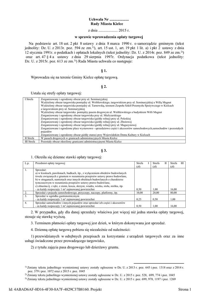 Uchwała Nr .................... Rady Miasta Kielce z dnia .................... 2015 r. w sprawie wprowadzenia opłaty targowej Na podstawie art. 18 ust. 2 pkt 8 ustawy z dnia 8 marca 1990 r. o samorządzie gminnym (tekst jednolity: Dz. U. z 2013r. poz. 594 ze zm.1)), art. 15 ust. 1, art. 19 pkt 1 lit. a) i pkt 2 ustawy z dnia 12 stycznia 1991r. o podatkach i opłatach lokalnych (tekst jednolity: Dz. U. z 2014r. poz. 849 ze zm.2)) oraz art. 47 § 4 a ustawy z dnia 29 sierpnia 1997r. Ordynacja podatkowa (tekst jednolity: Dz. U. z 2015r. poz. 613 ze zm.3)) Rada Miasta uchwala co następuje: § 1. Wprowadza się na terenie Gminy Kielce opłatę targową. § 2. Ustala się strefy opłaty targowej: I Strefa Zorganizowany i ogrodzony obszar przy ul. Seminaryjskiej Wydzielony obszar targowiska pomiędzy ul. Wróblewskiego, targowiskiem przy ul. Seminaryjskiej a Willą Magnat Wydzielony obszar targowiska pomiędzy ul. Tarnowską, terenem Zespołu Szkół Przemysłu Spożywczego w Kielcach a targowiskiem przy ul. Seminaryjskiej Wydzielony obszar targowiska pomiędzy pasem drogowym ul. Wróblewskiego a budynkiem Willi Magnat Zorganizowany i ogrodzony obszar targowiska przy ul. Mielczarskiego Zorganizowany i ogrodzony obszar targowiska (giełdy rolnej) przy ul. Poleskiej Zorganizowany i ogrodzony obszar targowiska (giełdy rolnej) przy ul. Zbożowej Zorganizowany i ogrodzony obszar targowiska (giełdy rolnej) przy ul. Magazynowej Zorganizowane i ogrodzone place wystawowo - sprzedażowe części i akcesoriów samochodowych,samochodów i pozostałych pojazdów Zorganizowany i ogrodzony obszar giełdy staroci przy Wojewódzkim Domu Kultury w Kielcach W pasach drogowych w granicach administracyjnych Miasta Kielce Pozostały obszar określony granicami administracyjnymi Miasta Kielce II Strefa III Strefa § 3. 1. Określa się dzienne stawki opłaty targowej: L.p. Przedmiot opłaty targowej 1. Sprzedaż: a) w kioskach, pawilonach, budkach, itp., z wyłączeniem obiektów budowlanych trwale związanych z gruntem w rozumieniu przepisów ustawy prawo budowlane, b) w straganach, namiotach oraz innych obiektach budowlanych o charakterze tymczasowym w rozumieniu przepisów ustawy prawo budowlane, c) obnośna tj. z ręki, z ziemi, kosza, skrzyni, wiadra, wózka, stołu, stolika, itp. - za każdy rozpoczęty 1 m² zajmowanej powierzchni Sprzedaż z pojazdu samochodowego, przyczepy, naczepy, platformy, itp. Sprzedaż w ogródku gastronomicznym - za każdy rozpoczęty 1 m² zajmowanej powierzchni Sprzedaż samochodów i innych pojazdów oraz sprzedaż ich części i akcesoriów - za każdy rozpoczęty 1 m² zajmowanej powierzchni 2. 3. 4. Strefa (zł) I Strefa (zł) II Strefa (zł) 0,50 10,00 1,00 20,00 16,00 80,00 0,25 0,50 1,00 0,50 1,00 16,00 III 2. W przypadku, gdy dla danej sprzedaży właściwa jest więcej niż jedna stawka opłaty targowej, stosuje się stawkę wyższą. 3. Terminem płatności opłaty targowej jest dzień, w którym dokonywana jest sprzedaż. 4. Dzienną opłatę targową pobiera się niezależnie od należności: 1) przewidzianych w odrębnych przepisach za korzystanie z urządzeń targowych oraz za inne usługi świadczone przez prowadzącego targowisko, 2) z tytułu zajęcia pasa drogowego lub dzierżawy gruntu. 1) Zmiany tekstu jednolitego wymienionej ustawy zostały ogłoszone w Dz. U. z 2013 r. poz. 645 i poz. 1318 oraz z 2014 r. poz. 379 i poz. 1072 oraz z 2015 r. poz. 1045 2) Zmiany tekstu jednolitego wymienionej ustawy zostały ogłoszone w Dz. U. z 2015 r. poz. 528, 699, 774 i poz. 1045 3) Zmiany tekstu jednolitego wymienionej ustawy zostały ogłoszone w Dz. U. z 2015 r. poz. 699, 978, 1197 i poz. 1269 Id: 4ABAD6AF-0D16-4F30-8A7F-4829C37B8160. Projekt Strona 1 § 4. 1. Zarządza się pobór opłaty targowej w drodze inkasa. 2. Wyznacza się inkasentów opłaty targowej oraz określa się wynagrodzenie za inkaso zgodnie z załącznikiem do uchwały. 3. Inkasent dokonując poboru opłaty targowej, każdorazowo potwierdza pobrane opłaty biletem opłaty targowej będącym drukiem ścisłego zarachowania. 4. Inkasent przekazuje pobraną opłatę targową w całości na rachunek Urzędu Miasta Kielce trzy razy w miesiącu według stanu środków na: 1) 10 dzień miesiąca - w terminie do 15 danego miesiąca, 2) 20 dzień miesiąca - w terminie do 25 danego miesiąca, 3) ostatni dzień miesiąca - w terminie do dnia 5 następnego miesiąca. § 5. 1. Zwalnia się z opłaty targowej: 1) sprzedaż dokonywaną w miejscach wyznaczonych w trakcie trwania zorganizowanych festynów, kiermaszów i jarmarków o charakterze promocyjnym Miasta Kielce, 2) sprzedaż dokonywaną na terenach zamkniętych wokół hal przeznaczonych i używanych do organizowania imprez targowych, wystawienniczych i aukcyjnych. § 6. Z dniem wejścia w życie niniejszej uchwały traci moc Uchwała Nr XVII/375/2011 z dnia 27 października 2011r. w sprawie określenia zasad ustalenia i poboru, terminu płatności i wysokości stawek opłaty targowej, zarządzenia poboru opłaty targowej w drodze inkasa, określenia inkasentów i wysokości wynagrodzenia za inkaso oraz wprowadzenia zwolnień z opłaty targowej, zmieniona Uchwałami Nr XXXII/596/2012 z dnia 6 września 2012r., Nr LVIII/1018/2014 z dnia 20 marca 2014r. i Nr LXVII/1201/2014 z dnia 6 listopada 2014r. § 7. Wykonanie uchwały powierza się Prezydentowi Miasta Kielce. § 8. Uchwała wchodzi w życie po upływie 14 dni od dnia ogłoszenia w Dzienniku Urzędowym Województwa Świętokrzyskiego, jednak nie wcześniej niż z dniem 1 stycznia 2016r. Przewodnicząca Rady Miasta Joanna Winiarska Id: 4ABAD6AF-0D16-4F30-8A7F-4829C37B8160. Projekt Strona 2 Załącznik do Nr .................... Rady Miasta Kielce Wykaz inkasentów opłaty targowej L.p. 1 1. 2. 3. 4. 5. Nazwa inkasenta 2 Rejonowe Przedsiębiorstwo Zieleni i Usług Komunalnych Sp. z o .o. Rejonowe Przedsiębiorstwo Zieleni i Usług Komunalnych Sp. z o. o. Rejonowe Przedsiębiorstwo Zieleni i Usług Komuna