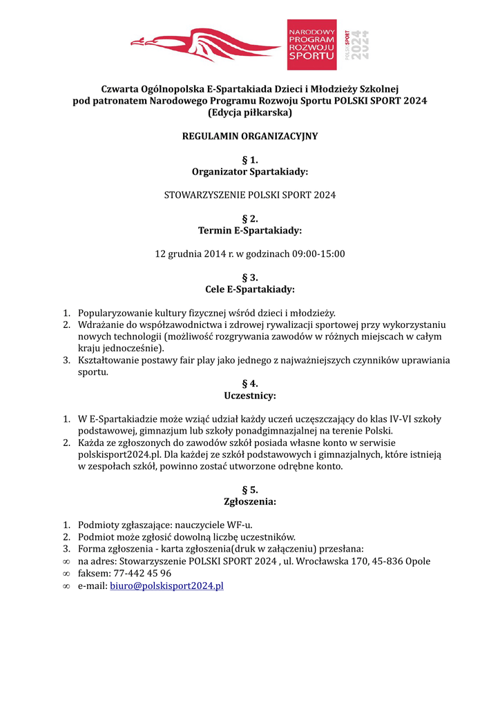 Czwarta Ogólnopolska E-Spartakiada Dzieci i Młodzieży Szkolnej pod patronatem Narodowego Programu Rozwoju Sportu POLSKI SPORT 2024 (Edycja piłkarska) REGULAMIN ORGANIZACYJNY § 1. Organizator Spartakiady: STOWARZYSZENIE POLSKI SPORT 2024 § 2. Termin E-Spartakiady: 12 grudnia 2014 r. w godzinach 09:00-15:00 § 3. Cele E-Spartakiady: 1. Popularyzowanie kultury fizycznej wśród dzieci i młodzieży. 2. Wdrażanie do współzawodnictwa i zdrowej rywalizacji sportowej przy wykorzystaniu nowych technologii (możliwość rozgrywania zawodów w różnych miejscach w całym kraju jednocześnie). 3. Kształtowanie postawy fair play jako jednego z najważniejszych czynników uprawiania sportu. § 4. Uczestnicy: 1. W E-Spartakiadzie może wziąć udział każdy uczeń uczęszczający do klas IV-VI szkoły podstawowej, gimnazjum lub szkoły ponadgimnazjalnej na terenie Polski. 2. Każda ze zgłoszonych do zawodów szkół posiada własne konto w serwisie polskisport2024.pl. Dla każdej ze szkół podstawowych i gimnazjalnych, które istnieją w zespołach szkół, powinno zostać utworzone odrębne konto. § 5. Zgłoszenia: 1. 2. 3. • • • Podmioty zgłaszające: nauczyciele WF-u. Podmiot może zgłosić dowolną liczbę uczestników. Forma zgłoszenia - karta zgłoszenia(druk w załączeniu) przesłana: na adres: Stowarzyszenie POLSKI SPORT 2024 , ul. Wrocławska 170, 45-836 Opole faksem: 77-442 45 96 e-mail: [email protected] § 6. Sposób rozegrania zawodów: 1. Każda ze zgłoszonych szkół przeprowadza zawody w dniu 12.12.2014 r. w przedziale godzinowym 09:00-15:00. 2. Nauczyciel może wybrać liczbę testów piłkarskich, które zrealizuje jego szkoła w ramach zawodów. 3. Wyniki uzyskane podczas E-Spartakiady w poszczególnych testach nauczyciel powinien wpisać 12.12.2014 r. do godz. 15:00 na platformie polskisport2024.pl w zakładce „Zawody sportowe on-line” (http://www.polskisport2024.pl/contest). 4. Po godzinie 15:00 możliwość wpisywania wyników zostaje automatycznie zablokowana. 5. Po zamknięciu zawodów zostaną opublikowane ogólnopolskie wyniki zawodów. 6. Listy rankingowe będą niewidoczne aż do zamknięcia zawodów, tj. do godziny 15:00. 7. Do 14.12.2014 r. każdy nauczyciel może złożyć protest. Po uwzględnieniu protestów 15.12 zostanie zamieszczona ostateczna wersja list rankingowych. 8. Wszelkie problemy techniczne w trakcie trwania zawodów można zgłaszać. telefonicznie: 77-442 45 96, 506 271 488 lub na adres e-mail: [email protected] § 7. Wykaz konkurencji: Dla szkół podstawowych, gimnazjów, szkół ponadgimnazjalnych: • • • • piłka siatkowa: http://www.polskisport2024.pl/help/pilka_siatkowa piłka ręczna: http://www.polskisport2024.pl/help/pilka_reczna koszykówka: http://www.polskisport2024.pl/help/koszykowka piłka nożna: http://www.polskisport2024.pl/help/pilka_nozna § 8. Przebieg zawodów: 1. Podczas udziału w zawodach sportowych każdy zawodnik zobowiązany jest zachowywać się z szacunkiem dla innych zawodników i sędziów oraz zgodnie z duchem sportowej rywalizacji, kulturą i dobrymi obyczajami. 2. Niedopuszczalne są jakiekolwiek zachowania sprzeczne z zasadami bezpieczeństwa w szczególności: umyślne naruszanie reguł danej dyscypliny sportu, zmierzające do wyrządzenia krzywdy współzawodnikom, używanie słów wulgarnych i obelżywych, czy nierespektowanie uwag i decyzji sędziów zawodów sportowych bądź nauczycieli. § 9. Sędziowie: 1. Komisja sędziowska powołana będzie przez Nauczyciela WF/trenera, będącego partnerem Narodowego Programu Rozwoju Sportu Polski Sport 2024. 2. Komisja składa się z 2 osób (jeden nauczyciel WF-u + nauczuciel innego przedmiotu lub dwóch nauczycieli WF-u). 3. Zadaniem Komisji Sędziowskiej będzie zatwierdzenie poprawności przeprowadzonych zawodów oraz zapisanie wyników uzyskanych przez poszczególnych zawodników w odpowiednim panelu na stronie polskisport2024.pl. 4. Członkowie Komisji w orzekaniu są niezawiśli oraz samodzielni, orzekają i zapisują wyniki w sposób sprawiedliwy i zgodny z zasadami fair play. §10. Laureaci: 1. W każdej dyscyplinie sportowej rozgrywanej na E-Spartakiadzie spośród wszystkich szkół w poszczególnych kategoriach wiekowych zostaną nagrodzeni zwycięzcy miejsc 1-3. 2. Kategorie wiekowe kształtują się następująco: - szkoły podstawowe: kategoria „A” – klasy 4 i 5, kategoria „B” – klasa 6 - gimnazja: kategoria „A” – klasy 1 i 2, kategoria „B” – klasa 3. - szkoły ponadgimnazjalne: klasy 1-4 w ramach jednej kategorii 3. Medale, dyplomy, podziękowania dla szkół i nauczycieli zostaną wysłane na adres szkoły 02.01.2015 r. § 11. Postanowienia końcowe: 1. W przypadku nieprzestrzegania regulaminu lub przepisów bezpieczeństwa sędzia ma prawo dokonać dyskwalifikacji zawodnika. 2. Każdy uczestnik Spartakiady przystępując do udziału w Spartakiadzie przyjmuje do wiadomości postanowienia niniejszego regulaminu i zobowiązuje się do ich przestrzegania. 3. Do interpretacji niniejszego regulaminu uprawniony jest jedynie organizator. STOWARZYSZENIE POLSKI SPORT 2024