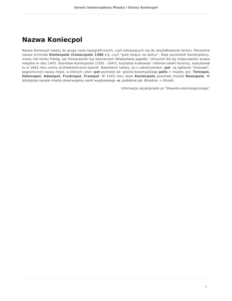 Serwis Samorządowy Miasta i Gminy Koniecpol Nazwa Koniecpol Nazwa Koniecpol należy do grupy nazw topograficznych, czyli odnoszących się do ukształtowanie terenu. Pierwotna nazwa brzmiała Koniecpole (Coneczpole 1386 r.), czyli "pole leżące na końcu". Stąd pochodzili Koniecpolscy, znany ród herbu Pobóg. Jan Koniecpolski był kanclerzem Władysława Jagiełły i otrzymał dla tej miejscowości prawa miejskie w roku 1443. Stanisław Koniecpolski (1591 - 1647), kasztelan krakowski i hetman wielki koronny, wybudował tu w 1642 roku cenny architektonicznie kościół. Nadmienić należy, że z zakończeniem -pol są (głównie "kresowe", pograniczne) nazwy miast, w których człon -pol pochodzi od grecko-bizantyjskiego polis = miasto; por. Terespol, Helenopol, Adampol, Fredropol, Frampol. W 1443 roku obok Koniecpola powstało miasto Nowopole. W dzisiejszej nazwie miasta obserwujemy zanik wygłosowego -e, podobnie jak: Brzeście -> Brześć. Informacje zaczerpnięte ze "Słownika etymologicznego" 1