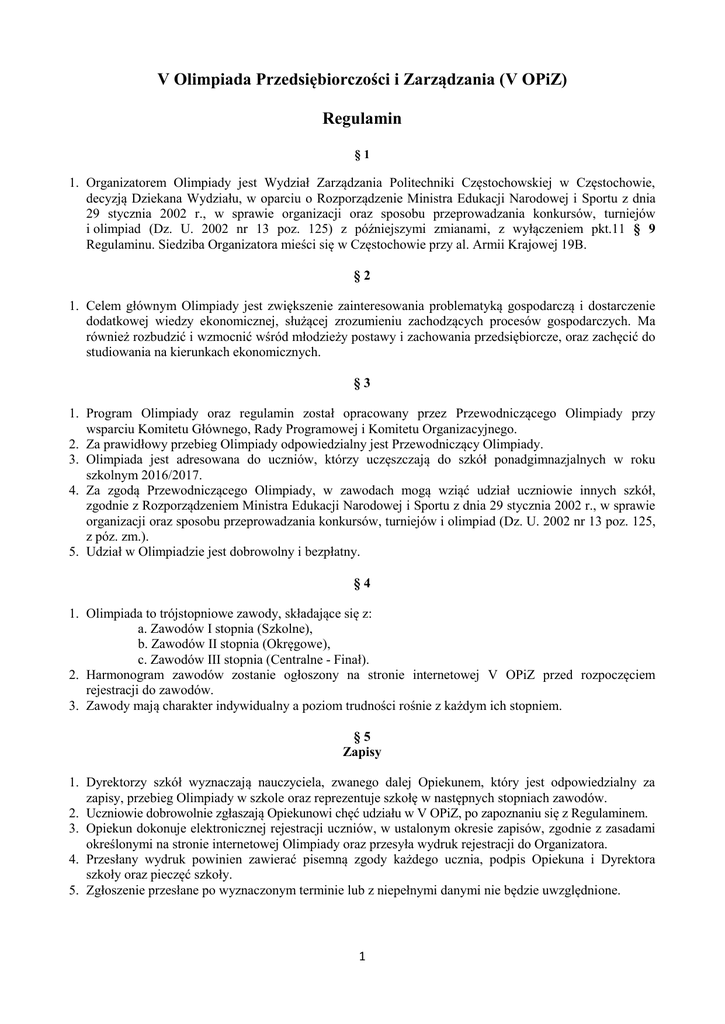 V Olimpiada Przedsiębiorczości i Zarządzania (V OPiZ) Regulamin §1 1. Organizatorem Olimpiady jest Wydział Zarządzania Politechniki Częstochowskiej w Częstochowie, decyzją Dziekana Wydziału, w oparciu o Rozporządzenie Ministra Edukacji Narodowej i Sportu z dnia 29 stycznia 2002 r., w sprawie organizacji oraz sposobu przeprowadzania konkursów, turniejów i olimpiad (Dz. U. 2002 nr 13 poz. 125) z późniejszymi zmianami, z wyłączeniem pkt.11 § 9 Regulaminu. Siedziba Organizatora mieści się w Częstochowie przy al. Armii Krajowej 19B. §2 1. Celem głównym Olimpiady jest zwiększenie zainteresowania problematyką gospodarczą i dostarczenie dodatkowej wiedzy ekonomicznej, służącej zrozumieniu zachodzących procesów gospodarczych. Ma również rozbudzić i wzmocnić wśród młodzieży postawy i zachowania przedsiębiorcze, oraz zachęcić do studiowania na kierunkach ekonomicznych. §3 1. Program Olimpiady oraz regulamin został opracowany przez Przewodniczącego Olimpiady przy wsparciu Komitetu Głównego, Rady Programowej i Komitetu Organizacyjnego. 2. Za prawidłowy przebieg Olimpiady odpowiedzialny jest Przewodniczący Olimpiady. 3. Olimpiada jest adresowana do uczniów, którzy uczęszczają do szkół ponadgimnazjalnych w roku szkolnym 2016/2017. 4. Za zgodą Przewodniczącego Olimpiady, w zawodach mogą wziąć udział uczniowie innych szkół, zgodnie z Rozporządzeniem Ministra Edukacji Narodowej i Sportu z dnia 29 stycznia 2002 r., w sprawie organizacji oraz sposobu przeprowadzania konkursów, turniejów i olimpiad (Dz. U. 2002 nr 13 poz. 125, z póz. zm.). 5. Udział w Olimpiadzie jest dobrowolny i bezpłatny. §4 1. Olimpiada to trójstopniowe zawody, składające się z: a. Zawodów I stopnia (Szkolne), b. Zawodów II stopnia (Okręgowe), c. Zawodów III stopnia (Centralne - Finał). 2. Harmonogram zawodów zostanie ogłoszony na stronie internetowej V OPiZ przed rozpoczęciem rejestracji do zawodów. 3. Zawody mają charakter indywidualny a poziom trudności rośnie z każdym ich stopniem. §5 Zapisy 1. Dyrektorzy szkół wyznaczają nauczyciela, zwanego dalej Opiekunem, który jest odpowiedzialny za zapisy, przebieg Olimpiady w szkole oraz reprezentuje szkołę w następnych stopniach zawodów. 2. Uczniowie dobrowolnie zgłaszają Opiekunowi chęć udziału w V OPiZ, po zapoznaniu się z Regulaminem. 3. Opiekun dokonuje elektronicznej rejestracji uczniów, w ustalonym okresie zapisów, zgodnie z zasadami określonymi na stronie internetowej Olimpiady oraz przesyła wydruk rejestracji do Organizatora. 4. Przesłany wydruk powinien zawierać pisemną zgody każdego ucznia, podpis Opiekuna i Dyrektora szkoły oraz pieczęć szkoły. 5. Zgłoszenie przesłane po wyznaczonym terminie lub z niepełnymi danymi nie będzie uwzględnione. 1 §6 Zawody I stopnia (Szkolne) 1. Zawody I stopnia odbywają się jednocześnie we wszystkich zgłoszonych szkołach. 2. Do rywalizacji mogą przystąpić wyłącznie uczniowie, wymienieni w § 3 p.2 i 3, zgłoszeni przez szkoły, zgodnie z procedurą rejestracyjną, którzy znajdą się na liście zakwalifikowanych do zawodów, zamieszczonej na stronie internetowej Olimpiady. 3. Zawody mają formę pisemnego testu złożonego z 50 pytań zamkniętych i trwać będą 60 min. Zakres tematyczny pytań obejmuje program przedmiotu „Podstawy przedsiębiorczości”, znajomości zagadnień dotyczących zarządzania przedsiębiorstwem, podstawowych pojęć ekonomicznych i znajomości bieżących wydarzeń życia gospodarczego. 4. Testy i karty odpowiedzi zostaną dostarczone do szkół przez Organizatora. 5. Rywalizacja odbywa przed Komisją (3-osobową) wyznaczoną przez Dyrektora szkoły. W przypadku gdy w szkole, do której uczęszcza uczeń, nie organizuje się eliminacji, może do nich przystąpić w szkole wskazanej przez Dyrektora szkoły. §7 Zawody II stopienia (Okręgowe) 1. Zawody II stopnia zostaną przeprowadzone w sześciu okręgach, w wyznaczonych Szkołach Partnerskich oraz u Organizatora, w następujących miastach: - okręg Północo-zachodni - Poznań, - okręg Północny – Olsztyn, - okręg Centralny – Warszawa, - okręg Zachodni – Wrocław, - okręg Południowy – Częstochowa, - okręg Wschodni – Lublin. 2. Lista Szkół Partnerskich, wyłonionych przez Komitet Główny, zostanie zamieszczona na stronie internetowej Olimpiady wraz z listą zakwalifikowanych do zawodów II stopnia. 3. W przypadku braku możliwości przeprowadzenia eliminacji w wybranej Szkole Partnerskiej, uczestnicy z tego regionu będą rywalizować w innym okręgu lub obiektach Organizatora w Częstochowie. 4. Komisje Okręgowe, powołane przez Przewodniczącego Olimpiady, składają się z minimum 5 osób. Przewodniczącym Komisji Okręgowej jest przedstawiciel Organizatora lub Dyrektor Szkoły Partnerskiej a Członkami, powołani przez Przewodniczącego Olimpiady, Nauczyciele – Opiekunowie uczestników tych Eliminacji. 5. Przydział uczniów do poszczególnych Komisji zostanie ogłoszony wraz z wynikami Eliminacji Szkolnych, w oparciu o lokalizację szkoły, możliwości organizacyjne Szkół Partnerskich i dojazdu uczestników. 6. Do zawodów II stopnia zakwalifikowane zostaną osoby, które uzyskały w zawodach I stopnia minimum kwalifikacyjne, wyznaczone przez Przewodniczącego Olimpiady. 7. Zawody Okręgowe mają formę testu pisemnego, złożonego z 60 pytań zamkniętych, na rozwiązanie którego przewidziano 60 minut. Zakres tematyczny pytań dotyczy zagadnień wymienionych w załączniku nr 1 do regulaminu. 8. Testy i karty odpowiedzi zostaną dostarczone przez Organizatora, najpóźniej w dniu zawodów. §8 Zawody III stopnia (Centralne - Finał) 1. Finał V OPiZ zostanie przeprowadzony w Auli Wydziału Zarządzania w Częstochowie i trwać będzie 90 minut. 2. Do Finału dopuszczonych zostanie 50 osób, które uzyskały najwyższą ilość punktów w zawodach II stopnia. Liczba finalistów może być zwiększona jeśli