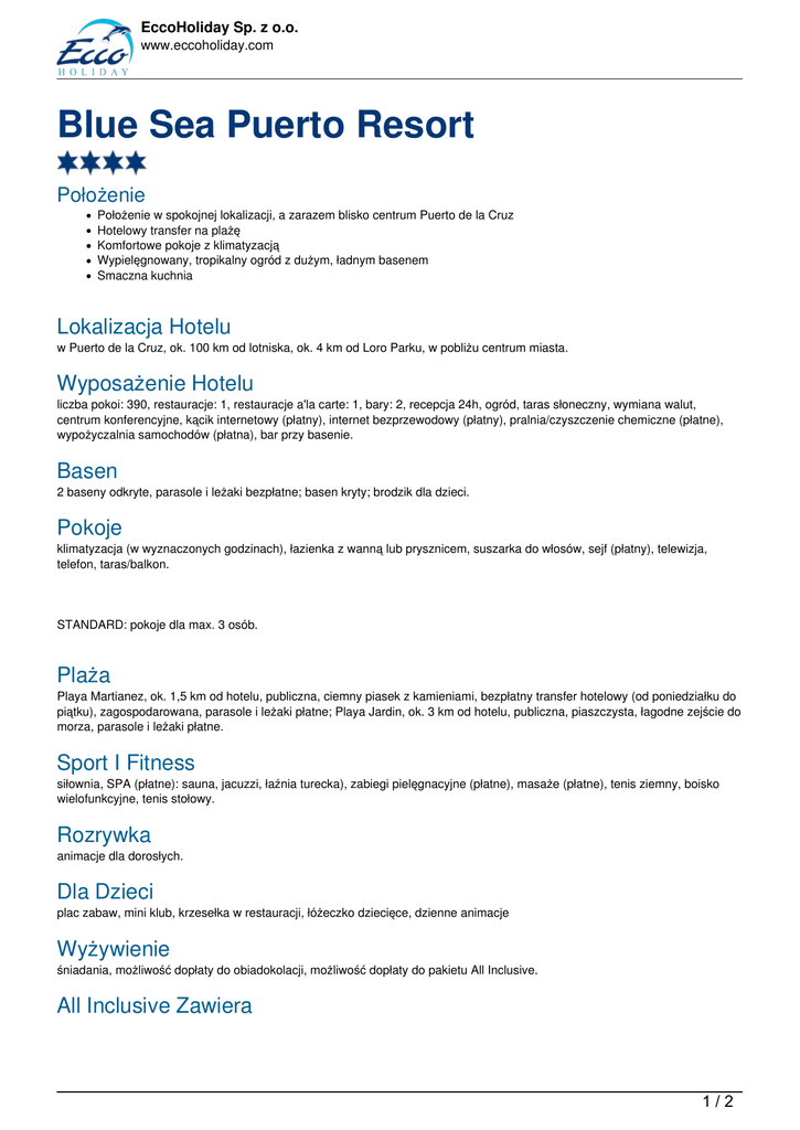 EccoHoliday Sp. z o.o. www.eccoholiday.com Blue Sea Puerto Resort Położenie Położenie w spokojnej lokalizacji, a zarazem blisko centrum Puerto de la Cruz Hotelowy transfer na plażę Komfortowe pokoje z klimatyzacją Wypielęgnowany, tropikalny ogród z dużym, ładnym basenem Smaczna kuchnia Lokalizacja Hotelu w Puerto de la Cruz, ok. 100 km od lotniska, ok. 4 km od Loro Parku, w pobliżu centrum miasta. Wyposażenie Hotelu liczba pokoi: 390, restauracje: 1, restauracje a'la carte: 1, bary: 2, recepcja 24h, ogród, taras słoneczny, wymiana walut, centrum konferencyjne, kącik internetowy (płatny), internet bezprzewodowy (płatny), pralnia/czyszczenie chemiczne (płatne), wypożyczalnia samochodów (płatna), bar przy basenie. Basen 2 baseny odkryte, parasole i leżaki bezpłatne; basen kryty; brodzik dla dzieci. Pokoje klimatyzacja (w wyznaczonych godzinach), łazienka z wanną lub prysznicem, suszarka do włosów, sejf (płatny), telewizja, telefon, taras/balkon. STANDARD: pokoje dla max. 3 osób. Plaża Playa Martianez, ok. 1,5 km od hotelu, publiczna, ciemny piasek z kamieniami, bezpłatny transfer hotelowy (od poniedziałku do piątku), zagospodarowana, parasole i leżaki płatne; Playa Jardin, ok. 3 km od hotelu, publiczna, piaszczysta, łagodne zejście do morza, parasole i leżaki płatne. Sport I Fitness siłownia, SPA (płatne): sauna, jacuzzi, łaźnia turecka), zabiegi pielęgnacyjne (płatne), masaże (płatne), tenis ziemny, boisko wielofunkcyjne, tenis stołowy. Rozrywka animacje dla dorosłych. Dla Dzieci plac zabaw, mini klub, krzesełka w restauracji, łóżeczko dziecięce, dzienne animacje Wyżywienie śniadania, możliwość dopłaty do obiadokolacji, możliwość dopłaty do pakietu All Inclusive. All Inclusive Zawiera 1/2 EccoHoliday Sp. z o.o. www.eccoholiday.com śniadanie (7.30 - 10.30), lunch (12.00 - 14.15), kolację (18.00 - 21.45) w formie bufetu; przekąski między posiłkami głównymi, ciasta, lody (11.00 - 19.00); lokalne alkohole oraz napoje bezalkoholowe 11.00 - 23.30. Oferta: Wylot 01.01.1970 Powrót 01.01.1970 godz. godz. Zakwaterowanie -() Dni dni Cena os. dorosła 2/2 Powered by TCPDF (www.tcpdf.org)
