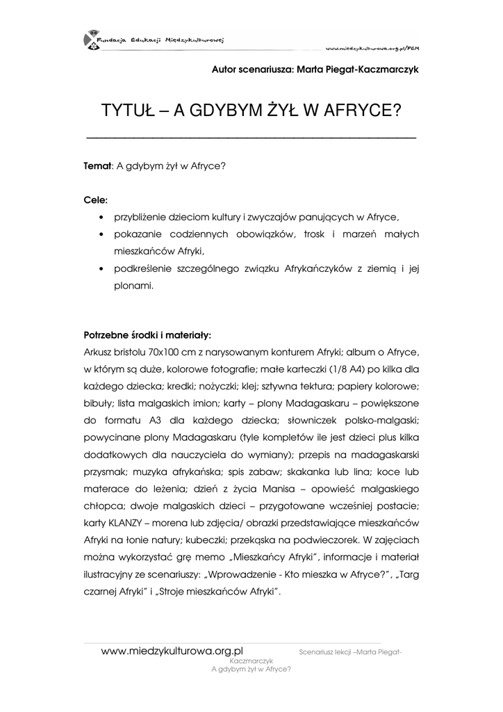 Autor scenariusza: Marta Piegat-Kaczmarczyk TYTUŁ – A GDYBYM śYŁ W AFRYCE? ___________________________________ Temat: A gdybym Ŝył w Afryce? Cele: • przybliŜenie dzieciom kultury i zwyczajów panujących w Afryce, • pokazanie codziennych obowiązków, trosk i marzeń małych mieszkańców Afryki, • podkreślenie szczególnego związku Afrykańczyków z ziemią i jej plonami. Potrzebne środki i materiały: Arkusz bristolu 70x100 cm z narysowanym konturem Afryki; album o Afryce, w którym są duŜe, kolorowe fotografie; małe karteczki (1/8 A4) po kilka dla kaŜdego dziecka; kredki; noŜyczki; klej; sztywna tektura; papiery kolorowe; bibuły; lista malgaskich imion; karty – plony Madagaskaru – powiększone do formatu A3 dla kaŜdego dziecka; słowniczek polsko-malgaski; powycinane plony Madagaskaru (tyle kompletów ile jest dzieci plus kilka dodatkowych dla nauczyciela do wymiany); przepis na madagaskarski przysmak; muzyka afrykańska; spis zabaw; skakanka lub lina; koce lub materace do leŜenia; dzień z Ŝycia Manisa – opowieść malgaskiego chłopca; dwoje malgaskich dzieci – przygotowane wcześniej postacie; karty KLANZY – morena lub zdjęcia/ obrazki przedstawiające mieszkańców Afryki na łonie natury; kubeczki; przekąska na podwieczorek. W zajęciach moŜna wykorzystać grę memo „Mieszkańcy Afryki”, informacje i materiał ilustracyjny ze scenariuszy: „Wprowadzenie - Kto mieszka w Afryce?”, „Targ czarnej Afryki” i „Stroje mieszkańców Afryki”. ________________________________________________________________________________________ www.miedzykulturowa.org.pl Kaczmarczyk A gdybym Ŝył w Afryce? Scenariusz lekcji –Marta Piegat- Realizacja 1. Wspólne kolorowanie wielkiej mapy Afryki. Kiedy dzieci schodzą się do sali, zapraszaj je po kolei do kolorowania mapy Afryki. Karton z konturem mapy moŜna połoŜyć na podłodze, Ŝeby mogło ją kolorować kilkoro dzieci na raz. 2. Mieszkańcy Afryki – ludzie, rośliny i zwierzęta. Przygotowaną i pokolorowaną mapę zawieś na ścianie lub tablicy, zapytaj jaki kontynent przedstawia. MoŜe któreś z dzieci było w Afryce? Usiądźcie w kręgu na podłodze. Powiedz dzieciom, Ŝe cały dzisiejszy dzień spędzicie na podróŜowaniu po Afryce, poznawaniu jej tajemnic i zagadek, a zwłaszcza tych dotyczących pewnej wielkiej afrykańskiej wyspy. Obejrzyjcie wspólnie album ze zdjęciami z Afryki – przeczytaj dzieciom podpisy pod zdjęciami, Ŝeby udzielić im więcej informacji. Następnie rozdaj małe karteczki i poproś o narysowanie kilku roślin, zwierząt i ludzi – kaŜdy rysunek powinien być na osobnej karteczce. Następnie powycinajcie je. Tak przygotowane rysunki przyklejcie na stworzonej wcześniej mapie Afryki – dzięki temu stanie się ona miejscem pełnym ciekawych ludzi, dzikich zwierząt i egzotycznych roślin. 3. Dwoje malgaskich dzieci i malgaskie imiona. Usiądźcie w kole na podłodze. Zaproś dzieci do odgadnięcia zagadki w języku malgaskim. Przeczytaj imiona malgaskich dzieci i zapytaj: co mogą oznaczać te słowa? Kiedy dzieci odgadną, Ŝe są to imiona, spróbujcie wspólnie stwierdzić, które mogą być imionami chłopców, a które dziewczynek. Następnie zaproponuj zrobienie dwóch postaci naturalnej wielkości, które przedstawiałyby dzieci z Madagaskaru. Obrysujcie kontury jednej dziewczynki i jednego chłopca na kremowym kartonie, a następnie przyklejcie je do sztywnej tektury i wytnijcie (trzeba teŜ zrobić podpórkę z tektury, Ŝeby postacie mogły stać stabilnie). Chłopcy kolorują wspólnie postać chłopca, a dziewczynki – dziewczynkę. Zwróć uwagę, ________________________________________________________________________________________ www.miedzykulturowa.org.pl Kaczmarczyk A gdybym Ŝył w Afryce? Scenariusz lekcji –Marta Piegat- Ŝeby postacie miały ciemną skórę i odpowiedni strój – wskazówki do rysowania dzieci znajdą w albumie. Kiedy rysunkowy chłopiec i dziewczynka są juŜ gotowi, wybierzcie dla nich malgaskie imiona z listy. Od teraz przez cały dzień będzie nam towarzyszyło dwoje dzieci z Madagaskaru. 4. Plony Madagaskaru – rysowanie, wycinanie. Powiedz dzieciom, Ŝe głównym zajęciem mieszkańców Madagaskaru jest rolnictwo i Ŝe teraz poznamy podstawowe uprawy tej wyspy. Rozdaj dzieciom karty PLONY MADAGASKARU. Omów krótko co się na nich znajduje i jak jest wykorzystywane. Poproś o pokolorowanie rysunków i wycięcie ich. 5. Co dobrego „afrykańskiego” dziś przygotuję? Kiedy wszystkie plony są pokolorowane i wycięte, zaproś dzieci do kręgu na podłodze i zapytaj co moŜna przyrządzić z tych składników. Poproś dzieci, Ŝeby chwilę się zastanowiły nad tym: co mogłyby ugotować, gdyby mogły pozamieniać się róŜnymi składnikami. Wszystkie pomysły zapisz po kolei na tablicy lub arkuszu papieru np. Krysia ugotuje zupę z kukurydzy i manioku, Adaś deser ryŜowo-waniliowy itd. 6. Afrykański bazar – handlowanie warzywami – próba języka malgaskiego. Zaproś dzieci do zabawy w afrykański bazar: kaŜdy będzie miał za zadanie tak pozamieniać się na produkty, Ŝeby mógł ugotować to co zaplanował. Uwaga – będziemy się porozumiewać w języku malgaskim – powtórzcie podstawowe zwroty: cześć, dziękuję, dowidzenia… Poćwiczcie razem język malgaski, Ŝeby kaŜdy mógł porozumieć się na bazarze. Poinformuj dzieci o waŜnej zasadzie – wszyscy zaczynamy zabawę z zestawem takich samych 9 produktów: KUKURYDZA, KAWA, TRZCINA CUKROWA, RYś, WANILIA, TYTOŃ, MANIOK, GOŹDZIKI I MANGO. Kiedy ktoś ma juŜ zebrane prawie wszystkie produkty i brakuje mu juŜ tylko jednego, to moŜe oddać nauczycielowi kartę TYTOŃ – bo jest on szkodliwy ________________________________________________________________________________________ www.miedzykulturowa.org.pl Kaczmarczyk A gdybym Ŝył w Afryce? Scenariusz lekcji –Marta Piegat- i niezdatny do jedzenia – a w zamian za to otrz