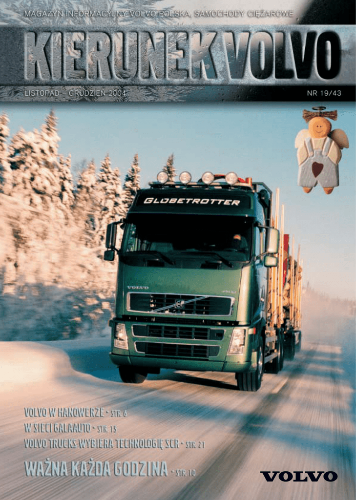 Z okazji Âwiàt Bo˝ego Narodzenia oraz zbli˝ajàcego si´ Nowego Roku pragniemy z∏o˝yç Naszym Klientom, Przyjacio∏om, Sympatykom Volvo i ich Bliskim moc goràcych ˝yczeƒ, zdrowia, szcz´Êcia i wszelkiej pomyÊlnoÊci. Âwi´ta Bo˝ego Narodzenia to szczególny czas, kiedy pami´tamy o tych najbardziej potrzebujàcych, dlatego po raz kolejny nie wysy∏amy kartek, lecz drukujemy ˝yczenia na ∏amach „Kierunku Volvo”. Zaoszcz´dzone w ten sposób pieniàdze wspierajà akcje charytatywnà „Misie ratujà dzieci”. To dla nas ogromny zaszczyt przywróciç uÊmiech dziecku, które prze˝y∏o tragiczne chwile. Volvo Polska, Samochody Ci´˝arowe KIERUNEK VOLVO MAGAZYN INFORMACYJNY VOLVO POLSKA, SAMOCHODY CI¢˚AROWE WYDAWCA: Volvo Polska, Samochody Ci´˝arowe REDAGUJE ZESPÓ¸: Magdalena Szczygie∏ redaktor naczelna Krzysztof Sobczak cz´Êci zamienne Jaros∏aw Duchliƒski serwis Bart∏omiej Górzyƒski marketing Piotr ˚urawski sprzeda˝ Witold Szlachta redaktor S P I S T R E  C I WST¢P 2 AKTUALNOÂCI Z POLSKI I ZE ÂWIATA 4 NASI KLIENCI 10 NASZE SERWISY 15 CIEKAWE ZABUDOWY 18 MOTOLABORATORIUM 20 VOLVO NAJLEPSZYM DOSTAWCÑ POJAZDÓW CI¢˚AROWYCH MISIE RATUJÑ DZIECI” Z VOLVO ” WYNIKI SPRZEDA˚Y VOLVO W HANOWERZE. MI¢DZYNARODOWA WYSTAWA POJAZDÓW U˚YTKOWYCH (IAA) SAMOCHODY CI¢˚AROWE W ROLACH G¸ÓWNYCH WA˚NA KA˚DA GODZINA W SIECI GALAAUTO VOLVO FM JAK GROM Z JASNEGO NIEBA PODUSZKA POWIETRZNA - JAK TO DZIA¸A? VOLVO TRUCKS WYBIERA TECHNOLOGI¢ SCR OPRACOWANIE GRAFICZNE: Szwejkowski Target Project ZDJ¢CIA: Studio Marmolada PORADY SERWISOWE 24 OFERTA DLA BIZNESU 26 POZNAJ LEPIEJ SWOJE VOLVO. WYÂWIETLACZ (CZ. III) FILTRY VOLVO ¸A¡CUCHY ÂNIEGOWE ÂCI O N L A TA U A T I W AK  E IIZ K S L O P Z VOLVO NAJLEPSZYM DOSTAWCÑ POJAZDÓW CI¢˚AROWYCH Mi∏o nam poinformowaç, i˝ firma Volvo zdoby∏a zaszczytne wyró˝- nienie w programie „Operator Logistyczny Roku”, realizowanym przez Agencj´ Badawczà Data Group Consulting we wspó∏pracy z czasopismem „Eurologistics”. W ramach ca∏ego projektu, dla firm z bran˝y transportowej istotna jest tzw. Rekomendacja logistyka, o którà rozszerzona by∏a równie˝ tegoroczna, trzecia edycja programu. Rekomendacj´ logistyka przyznano w siedmiu kategoriach, po przeprowadzeniu badania „Dostawcy rekomendowani przez mened˝erów logistyki”. Wyró˝nienie dla Volvo przyznane zosta∏o w kategorii „Producenci pojazdów ci´˝arowych”. Za∏o˝eniem projektu „Dostawcy rekomendowani przez mened˝e- rów logistyki” jest wskazanie i promocja najlepszych na polskim rynku firm Êwiadczàcych us∏ugi lub oferujàcych produkty dla bran˝y logistycznej. W badaniu brane pod uwag´ sà takie elementy, jak: znajomoÊç firmy, korzystanie z us∏ug firmy oraz rekomendacja produktów i us∏ug. Zgodnie z za∏o˝eniem projektu, kluczowy element stanowi rekomendacja – czy urzàdzenia/us∏ugi danego producenta/dostawcy zosta∏yby polecone innym firmom. Wyniki rankingu w kategorii „Producenci pojazdów ci´˝arowych” wskazujà, i˝ 37,5% respondentów korzysta z produktów i us∏ug firmy Volvo, a 36,1% zdecydowanie poleci∏oby jà innym. Wyró˝nienie dla Volvo przyznane zosta∏o podczas uroczystej Gali „Operator Logistyczny Roku 2004”, która w tym roku odby∏a si´ w dniu 25 listopada w Hotelu Mazurkas w O˝arowie Mazowieckim k. Warszawy. ZMIANA „KIERUNKU VOLVO” Szanowni Paƒstwo Zaczynajàc od roku 2005, „Kierunek Volvo” b´dzie ukazywa∏ si´ co trzy miesiàce jako kwartalnik, podobnie jak wi´kszoÊç lokal- 4 nych magazynów dla Klientów Volvo w Europie. Podà˝ajàc za nowymi standardami, mamy nadziej´, ˝e w przysz∏ym roku przeka˝emy Paƒstwu nowe, lepsze pismo, które b´dzie w u˝yteczny sposób wspiera∏o Paƒstwa codziennà dzia∏alnoÊç transportowà. Redakcja „Kierunku Volvo” „MISIE RATUJÑ DZIECI” Z VOLVO Volvo Polska, Samochody Ci´˝arowe od listopada 2004 roku wspiera na terenie województwa ma∏opolskiego akcj´ charytatywnà „Misie Ratujà Dzieci”. Akcja polega na wyposa˝eniu samochodów wyje˝d˝ajàcych do wypadku (samochody ratownictwa policji, stra- ˝y po˝arnej, stra˝y miejskiej i pogotowia ratunkowego) w maskotki pluszowego misia – tzw. Misia Ratownika. Misie sà dla dzieci, które uleg∏y nieszcz´Êliwemu wypadkowi. Majà one na celu z∏agodzenie urazu psychicznego. Stowarzyszenie „Misie Ratujà Dzieci” MiÊ Volvo jest organizacjà humanitarnà. Jego g∏ównym statutowym celem jest dzia∏alnoÊç profilaktyczna zmierzajàca do zmniejszenia liczby wypadków, zw∏aszcza tych z udzia∏em dzieci, i praktyczna pomoc psychologiczna dla ofiar tragicznych zdarzeƒ. Pomoc ta skierowana jest g∏ównie do najm∏odszych uczestników wypadków, a tak˝e ich rodzin oraz do s∏u˝b ratownictwa – grupy zawodowej najsilniej nara˝onej na psychologiczne konsekwencje zwiàzane z interwencjà kryzysowà. Dodatkowo, corocznie w sezonie wakacyjnym stowarzyszenie organizuje turnusy terapeutyczne dla dzieci ofiar wypadków poszkodowanych w tragicznych zdarzeniach losowych. Prowadzi równie˝ szkolenia s∏u˝b ratownictwa z zakresu udzielania wsparcia psychologicznego ofiarom tragedii i ich bliskim. WYNIKI SPRZEDA˚Y Sprzeda˝ nowych samochodów ci´˝arowych w Polsce: styczeƒ – listopad 2004 Dopuszczalna masa ca∏kowita 10 –16 ton Dopuszczalna masa ca∏kowita powy˝ej 16 ton Marka Liczba sztuk Marka Volvo MAN Scania DAF Mercedes Renault V. I. Iveco Jelcz 1465 1343 1226 1170 1121 1029 305 49 Star Mercedes Renault V. I. MAN Iveco DAF Volvo Razem 7708 Razem Liczba sztuk 307 245 203 191 190 150 106 1392 5 ÂCI O N L A TA U A T I W AK  E IIZ K S L O P Z VOLVO W HANOWERZE MI¢DZYNARODOWA WYSTAWA POJAZDÓW U˚YTKOWYCH IAA We wrzeÊniu firma Volvo Trucks wzi´∏a udzia∏ w 60. Mi´dzynarodowej Wystawie Pojazdów U˝ytkowych (IAA). G∏ównà rol´ na stoisku Volvo odgrywa∏y oczywiÊcie pojazdy, które znajdujà si´ w aktualnej ofercie Volvo, 