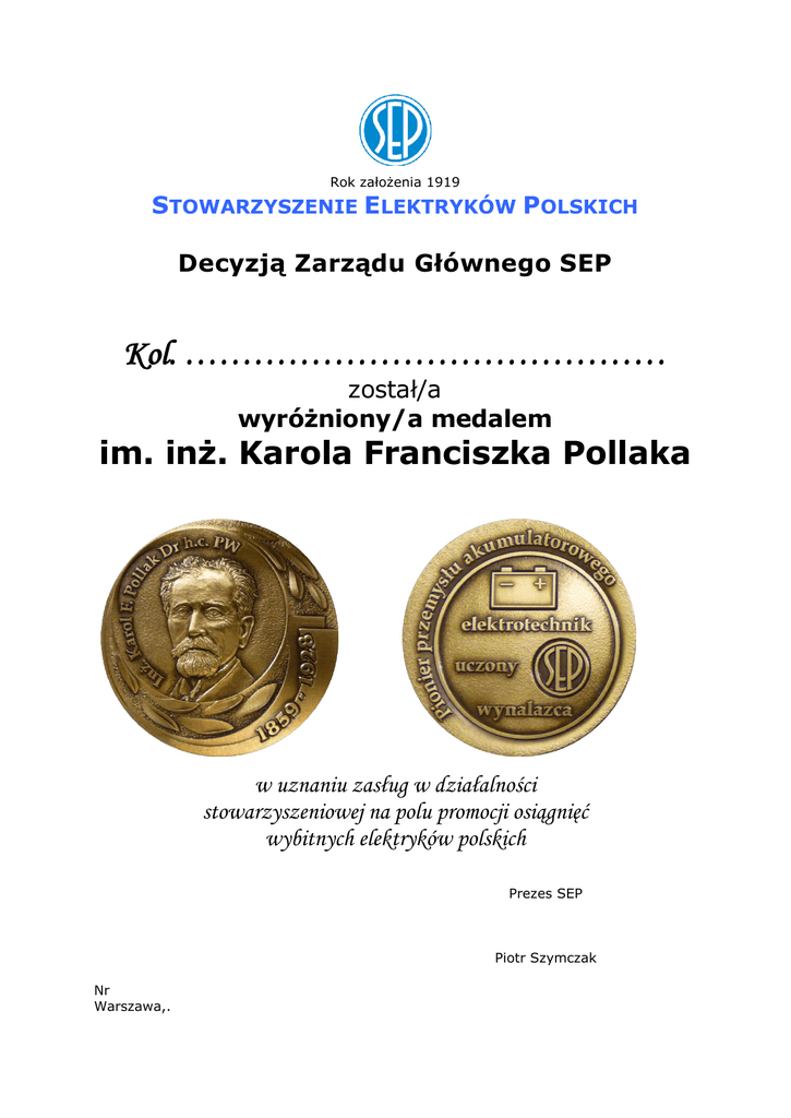 Rok założenia 1919 STOWARZYSZENIE ELEKTRYKÓW POLSKICH Decyzją Zarządu Głównego SEP Kol. …………………………………… został/a wyróżniony/a medalem im. inż. Karola Franciszka Pollaka w uznaniu zasług w działalności stowarzyszeniowej na polu promocji osiągnięć wybitnych elektryków polskich Prezes SEP Piotr Szymczak Nr Warszawa,. Inż. Karol Franciszek Pollak (1859-1928) – Dr h.c. Politechniki Warszawskiej – pionier przemysłu akumulatorowego, wynalazca, autor 98. patentów, jeden z najbardziej znanych elektro-techników europejskich, innowa-cyjnych inżynierów. Urodził się w Sanoku gdzie rozpoczęła się jego owocna przygoda życiowa z elektrotechniką. Niezwykłe zdolności poznawcze rozwijał kolejno w Stryju i we Lwowie a na Politechnice w Berlinie Charlotenburgu ukończył studia na Oddziale Elektrotechnicznym Wydziału Maszynowego. Jeszcze jako student ujawnił swoje predyspozycje wynalazcze. Były to ogniwa suche i samoładujące, które zostały opatentowane w Anglii a ich wdrożeniem zajął się osobiście. W połowie lat osiemdziesiątych XIX - ego wieku zainteresował się zagadnieniami trakcji elektrycznej. Akumulatorowy system zasilania tramwajowej trakcji elektrycznej, to kolejny etap działalności wynalazczej. Wprowadza go do eksploatacji w Niemczech i we Francji. Jest określany jako system Pollaka. Inżynier Karol F. Pollak staje się znanym na skalę światową wynalazcą i przemysłowcem. Pod jego patronatem powstają fabryki akumulatorów w Lessing /Austria/ w Marly-le-Grand w Szwajcarii i w Nancy/ Francja/. Kolejne jego wynalazki w dziedzinie akumulatorów stają się szybko popularne i mają przemysłowe zastosowanie. Zdobywa prestiżowe medale i dyplomy na międzynarodowych wystawach w Paryżu i w Columbii w USA. Na wystawie w Paryżu w 1900 r., jego akumulator został wyróżniony złotym medalem. Prace badawcze nad budową akumulatorów, które prowadził w laboratoriach Sorbony – przysporzyły mu dużego rozgłosu i zapewniły sukces na skalę europejską. U schyłku XIX - ego wieku Karol F. Pollak staje się pionierem przemysłu akumulatorowego na świecie. Po odzyskaniu przez Polskę niepodległości, jako 63. letni już weteran elektrotechniki praktycznej, wraca do kraju. Pozostawił we Francji dobrze prosperujące laboratorium, dom i spokojną pracę, by się włączyć w organizowanie przemysłu w Polsce. Podejmuje współpracę z profesorem Ignacym Mościckim. W 1922 r. zakłada Spółkę Akcyjną Polskie Towarzystwo Akumulatorowe ( PETEA ) w Białej k/Bielska i zostaje jej dyrektorem. W sierpniu 1923 r. zostaje uruchomiona fabryka w której dzięki patentom K. Pollaka, produkuje się akumulatory i baterie akumulatorowe na potrzeby: motoryzacji, kolejnictwa, lotnictwa, radia i telefonii. Fabryka prowadzi działalność pro-aukcyjną nieprzerwanie do dziś. Po kolejnych transformacjach ustrojowych – fabryka nosi obecnie nazwę EnerSys i wchodzi w skład koncernu EnerSys Inc. ( USA ).