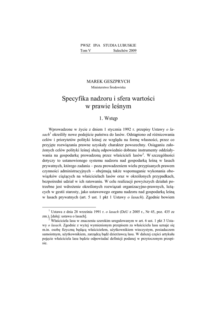 PWSZ IPiA STUDIA LUBUSKIE Tom V Sulechów 2009 MAREK GESZPRYCH Ministerstwo Środowiska Specyfika nadzoru i sfera wartości w prawie leśnym 1. Wstęp Wprowadzone w życie z dniem 1 stycznia 1992 r. przepisy Ustawy o lasach1 określiły nowe podejście państwa do lasów. Odstąpiono od różnicowania celów i priorytetów polityki leśnej ze względu na formę własności, przez co przyjęte rozwiązania prawne uzyskały charakter powszechny. Osiąganiu założonych celów polityki leśnej służą odpowiednio dobrane instrumenty oddziaływania na gospodarkę prowadzoną przez właścicieli lasów2. W szczególności dotyczy to ustanowionego systemu nadzoru nad gospodarką leśną w lasach prywatnych, którego zadania – poza prowadzeniem wielu przypisanych prawem czynności administracyjnych – obejmują także wspomaganie wykonania obowiązków ciążących na właścicielach lasów oraz w określonych przypadkach, bezpośredni udział w ich ratowaniu. W celu realizacji powyższych działań potrzebne jest wdrożenie określonych rozwiązań organizacyjno-prawnych, leżących w gestii starosty, jako ustawowego organu nadzoru nad gospodarką leśną w lasach prywatnych (art. 5 ust. 1 pkt 1 Ustawy o lasach). Zgodnie bowiem 1 Ustawa z dnia 28 września 1991 r. o lasach (DzU z 2005 r., Nr 45, poz. 435 ze zm.), [dalej: ustawa o lasach]. 2 Właściciela lasu w znaczeniu szerokim uregulowanym w art. 6 ust. 1 pkt 3 Ustawy o lasach. Zgodnie z wyżej wymienionym przepisem za właściciela lasu uznaje się m.in. osobę fizyczną będącą właścicielem, użytkownikiem wieczystym, posiadaczem samoistnym, użytkownikiem, zarządcą bądź dzierżawcą lasu. W dalszej części artykułu pojęcie właściciela lasu będzie odpowiadać definicji podanej w przytoczonym przepisie. 160 MAREK GESZPRYCH z obowiązującymi regulacjami prawnymi, należy stwierdzić, że funkcjonująca konstrukcja nadzoru w leśnictwie prywatnym jest nieskuteczna. 2. Uwarunkowania dotyczące leśnictwa prywatnego3 2.1. Historyczne uwarunkowania nadzoru w leśnictwie prywatnym Geneza rozwoju nadzoru nad lasami prywatnymi sięga czasów wystąpienia J.S. Milla w drugiej połowie XIX w.4 Rozważania tego filozofa znalazły odzwierciedlenie w gospodarce leśnej, gdzie wielu leśników zaczęło dostrzegać negatywne skutki nieograniczonego prawa do dysponowania swoimi gruntami leśnymi. Z tych idei narodziło się przesłanie stworzenia nadzoru państwowego nad lasami prywatnymi5. Historia nadzoru nad gospodarką leśną w polskich lasach prywatnych sięga 1918 r., kiedy to w Sekcji Lasów Ministerstwa Rolnictwa i Dóbr Koronnych w Warszawie utworzono Wydział Lasów Prywatnych6. Wraz z upływem czasu kolejne akty prawne uszczegółowiały sposoby sprawowania nadzoru nad lasami niepaństwowymi i precyzowały zasady prowadzenia w nich gospodarki. Pierwszym polskim aktem prawnym, regulującym zagadnienia nadzoru w leśnictwie 3 Określenie lasy prywatne jest pojęciem niedookreślonym w obowiązującym prawie polskim, wobec czego na gruncie prawnym przyjmuje się definicję lasów prywatnych, wynikającą z wykładni ustawy o lasach oraz z orzecznictwa sądowego. W przeszłości pojęcia związane z leśnictwem prywatnym były bardziej dookreślone, np. przepisy austriackiej ustawy lasowej z dnia 3 grudnia 1852 r. (DzUP Nr 250), obowiązujące przed pierwszą wojną światową na obszarze obecnej Galicji definiowały lasy prywatne jako „lasy należące do: pojedynczych obywateli, różnych zakonów, klasztorów, beneficjów, fundacji, oraz spółek opierających się na jakimś stosunku prywatno-prawnym” (§ 1 lit. c). 4 J.S. Mill wydał w 1848 r. Zasady ekonomii politycznej, w których w imię wyższego celu społecznego, wyraził potrzebę odstąpienia od liberalnych zasad: pełnej gospodarczej wolności jednostki, prywatnej własności i nieingerencji państwa w stosunki ekonomiczne. Oznaczało to uzasadnienie potrzeby wkraczania przez administrację państwową w sferę działalności gospodarczej, podyktowane potrzebą realizacji dóbr publicznych w interesie ogółu, za: J.S. Mill, Zasady ekonomii politycznej, przeł. E. Taylor, Warszawa 1966, s. 37-40. 5 J. Broda, Historia leśnictwa w Polsce, Poznań 2000, s. 62 i nast. 6 Za K. Heymanowski, Sytuacja prawno-organizacyjna lasów niepaństwowych w Polsce na tle dokonań w tej dziedzinie po II wojnie światowej, „Sylwan” 1992, nr 3, s. 7-8. Specyfikacja nadzoru i sfera wartości... 161 prywatnym było postanowienie Rady Ministrów z 1919 r. o organizacji urzędów ochrony lasu7, a następnie rozporządzenie Prezydenta RP z 1927 r. o zagospodarowaniu lasów8. Do kolejnych regulacji odnoszących się do lasów prywatnych należały: dekret z 1948 r. o ochronie lasów9, Ustawa z 1960 r. o zagospodarowaniu lasów i nieużytków10, Ustawa z 1973 r. o zagospodarowaniu lasów11 oraz obecnie obowiązująca Ustawa z 1991 r. o lasach. Sprawowanie nadzoru nad gospodarką leśną w lasach prywatnych odbywa się również na podstawie przepisów Kodeksu postępowania administracyjnego12, Ustawy o egzekucji w administracji13, Ustawy Prawo geodezyjne i kartograficzne14 i innych aktów prawnych powszechnie obowiązujących. 2.2. Uwarunkowania powierzchniowo-organizacyjne Powierzchnia lasów i gruntów leśnych15 związanych z gospodarką leśną zajmuje w Polsce 9049 tys. ha, co stanowi 28,5% powierzchni kraju. W strukturze własnościowej dominują lasy stanowiące własność Skarbu Państwa; ich powierzchnia wynosi 7343 tys. ha, z czego 7060 tys. ha znajduje się w zarządzie Państwowego Gospodarstwa Leśnego Lasy Państwowe i 184 tys. ha w zarządzie Parków Narodowych. Udział lasów niepublicznych w ogólnej powierzchni lasów wynosi 17,94%. Lasy będące własnością prywatną zajmują 7 Postanowienie z dnia 16 stycznia 1919 r. w przedmiocie organizacji urzędów ochrony lasów (DzPPP 1919, Nr 8, poz. 117). 8 Rozporządzenie Prezydenta RP z dnia 24 czerwca 1927 r. o zagosp