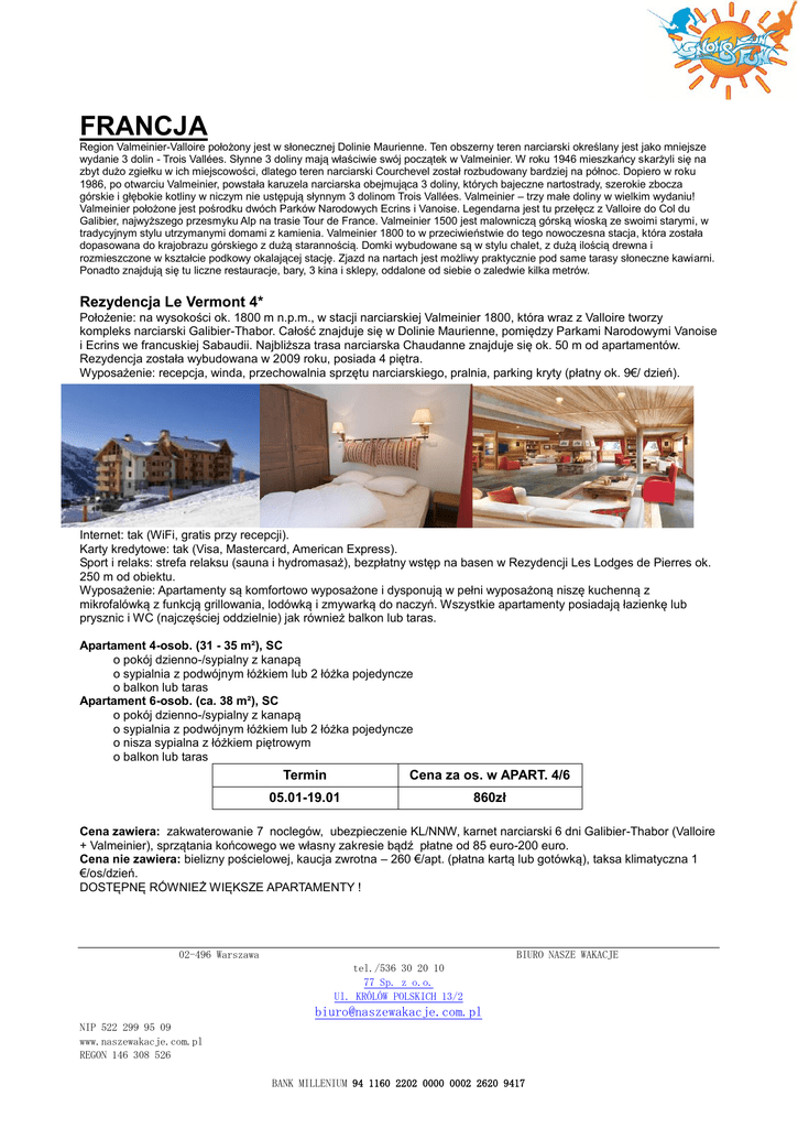 FRANCJA Region Valmeinier-Valloire położony jest w słonecznej Dolinie Maurienne. Ten obszerny teren narciarski określany jest jako mniejsze wydanie 3 dolin - Trois Vallées. Słynne 3 doliny mają właściwie swój początek w Valmeinier. W roku 1946 mieszkańcy skarżyli się na zbyt dużo zgiełku w ich miejscowości, dlatego teren narciarski Courchevel został rozbudowany bardziej na północ. Dopiero w roku 1986, po otwarciu Valmeinier, powstała karuzela narciarska obejmująca 3 doliny, których bajeczne nartostrady, szerokie zbocza górskie i głębokie kotliny w niczym nie ustępują słynnym 3 dolinom Trois Vallées. Valmeinier – trzy małe doliny w wielkim wydaniu! Valmeinier położone jest pośrodku dwóch Parków Narodowych Ecrins i Vanoise. Legendarna jest tu przełęcz z Valloire do Col du Galibier, najwyższego przesmyku Alp na trasie Tour de France. Valmeinier 1500 jest malowniczą górską wioską ze swoimi starymi, w tradycyjnym stylu utrzymanymi domami z kamienia. Valmeinier 1800 to w przeciwieństwie do tego nowoczesna stacja, która została dopasowana do krajobrazu górskiego z dużą starannością. Domki wybudowane są w stylu chalet, z dużą ilością drewna i rozmieszczone w kształcie podkowy okalającej stację. Zjazd na nartach jest możliwy praktycznie pod same tarasy słoneczne kawiarni. Ponadto znajdują się tu liczne restauracje, bary, 3 kina i sklepy, oddalone od siebie o zaledwie kilka metrów. Rezydencja Le Vermont 4* Położenie: na wysokości ok. 1800 m n.p.m., w stacji narciarskiej Valmeinier 1800, która wraz z Valloire tworzy kompleks narciarski Galibier-Thabor. Całość znajduje się w Dolinie Maurienne, pomiędzy Parkami Narodowymi Vanoise i Ecrins we francuskiej Sabaudii. Najbliższa trasa narciarska Chaudanne znajduje się ok. 50 m od apartamentów. Rezydencja została wybudowana w 2009 roku, posiada 4 piętra. Wyposażenie: recepcja, winda, przechowalnia sprzętu narciarskiego, pralnia, parking kryty (płatny ok. 9€/ dzień). Internet: tak (WiFi, gratis przy recepcji). Karty kredytowe: tak (Visa, Mastercard, American Express). Sport i relaks: strefa relaksu (sauna i hydromasaż), bezpłatny wstęp na basen w Rezydencji Les Lodges de Pierres ok. 250 m od obiektu. Wyposażenie: Apartamenty są komfortowo wyposażone i dysponują w pełni wyposażoną niszę kuchenną z mikrofalówką z funkcją grillowania, lodówką i zmywarką do naczyń. Wszystkie apartamenty posiadają łazienkę lub prysznic i WC (najczęściej oddzielnie) jak również balkon lub taras. Apartament 4-osob. (31 - 35 m²), SC o pokój dzienno-/sypialny z kanapą o sypialnia z podwójnym łóżkiem lub 2 łóżka pojedyncze o balkon lub taras Apartament 6-osob. (ca. 38 m²), SC o pokój dzienno-/sypialny z kanapą o sypialnia z podwójnym łóżkiem lub 2 łóżka pojedyncze o nisza sypialna z łóżkiem piętrowym o balkon lub taras Termin Cena za os. w APART. 4/6 05.01-19.01 860zł Cena zawiera: zakwaterowanie 7 noclegów, ubezpieczenie KL/NNW, karnet narciarski 6 dni Galibier-Thabor (Valloire + Valmeinier), sprzątania końcowego we własny zakresie bądź płatne od 85 euro-200 euro. Cena nie zawiera: bielizny pościelowej, kaucja zwrotna – 260 €/apt. (płatna kartą lub gotówką), taksa klimatyczna 1 €/os/dzień. DOSTĘPNĘ RÓWNIEŻ WIĘKSZE APARTAMENTY ! 02-496 Warszawa BIURO NASZE WAKACJE tel./536 30 20 10 77 Sp. z o.o. Ul. KRÓLÓW POLSKICH 13/2 [email protected] NIP 522 299 95 09 www.naszewakacje.com.pl REGON 146 308 526 BANK MILLENIUM 94 1160 2202 0000 0002 2620 9417