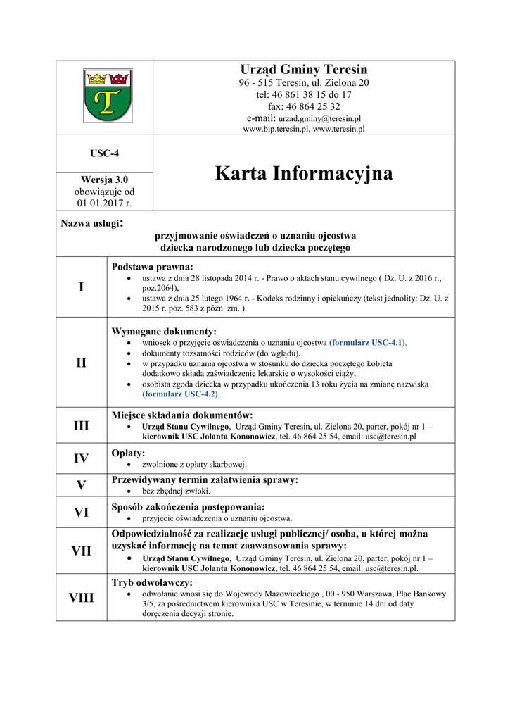 Urząd Gminy Teresin 96 - 515 Teresin, ul. Zielona 20 tel: 46 861 38 15 do 17 fax: 46 864 25 32 e-mail: [email protected] www.bip.teresin.pl, www.teresin.pl USC-4 Karta Informacyjna Wersja 3.0 obowiązuje od 01.01.2017 r. Nazwa usługi: przyjmowanie oświadczeń o uznaniu ojcostwa dziecka narodzonego lub dziecka poczętego Podstawa prawna: I ustawa z dnia 28 listopada 2014 r. - Prawo o aktach stanu cywilnego ( Dz. U. z 2016 r., poz.2064), ustawa z dnia 25 lutego 1964 r. - Kodeks rodzinny i opiekuńczy (tekst jednolity: Dz. U. z 2015 r. poz. 583 z późn. zm. ). Wymagane dokumenty: II III IV V VI VII wniosek o przyjęcie oświadczenia o uznaniu ojcostwa (formularz USC-4.1), dokumenty tożsamości rodziców (do wglądu). w przypadku uznania ojcostwa w stosunku do dziecka poczętego kobieta dodatkowo składa zaświadczenie lekarskie o wysokości ciąży, osobista zgoda dziecka w przypadku ukończenia 13 roku życia na zmianę nazwiska (formularz USC-4.2), Miejsce składania dokumentów: Urząd Stanu Cywilnego, Urząd Gminy Teresin, ul. Zielona 20, parter, pokój nr 1 – kierownik USC Jolanta Kononowicz, tel. 46 864 25 54, email: [email protected] Opłaty: zwolnione z opłaty skarbowej. Przewidywany termin załatwienia sprawy: bez zbędnej zwłoki. Sposób zakończenia postępowania: przyjęcie oświadczenia o uznaniu ojcostwa. Odpowiedzialność za realizację usługi publicznej/ osoba, u której można uzyskać informację na temat zaawansowania sprawy: Urząd Stanu Cywilnego, Urząd Gminy Teresin, ul. Zielona 20, parter, pokój nr 1 – kierownik USC Jolanta Kononowicz, tel. 46 864 25 54, email: [email protected]. Tryb odwoławczy: VIII odwołanie wnosi się do Wojewody Mazowieckiego , 00 - 950 Warszawa, Plac Bankowy 3/5, za pośrednictwem kierownika USC w Teresinie, w terminie 14 dni od daty doręczenia decyzji stronie. Dodatkowe informacje: IX uznanie ojcostwa następuje, gdy mężczyzna, od którego pochodzi dziecko, oświadczy przed kierownikiem USC, że jest ojcem biologicznym dziecka, a matka dziecka potwierdzi, że mężczyzna składający oświadczenie jest ojcem dziecka. Matka może dokonać potwierdzenia w ciągu trzech miesięcy od dnia oświadczenia złożonego przez mężczyznę, uznanie ojcostwa może nastąpić, jeżeli nie zachodzi domniemanie, że ojcem dziecka jest mąż matki (czyli po upływie 300 dni od zgonu męża matki bądź od daty uprawomocnienia się orzeczenia sądowego ustalającego rozwód, unieważnienie lub separację małżeństwa), uznanie ojcostwa nie może nastąpić, jeżeli toczy się sprawa o ustalenie ojcostwa, można uznać ojcostwo dziecka: małoletniego oraz nienarodzonego, jeżeli zostało poczęte, uznanie ojcostwa dziecka może nastąpić przed wybranym kierownikiem Urzędu Stanu Cywilnego albo przed sądem opiekuńczym, a za granicą - przed polskim konsulem lub osobą wyznaczoną do wykonywania funkcji konsula, jeżeli uznanie dotyczy dziecka, którego przynajmniej jedno z rodziców jest obywatelem polskim, w razie niebezpieczeństwa grożącego bezpośrednio życiu ojca lub dziecka, uznanie może nastąpić także przed notariuszem, wójtem, burmistrzem, prezydentem miasta, starostą, marszałkiem województwa, sekretarzem powiatu albo gminy, z chwilą uznania dziecko nosi nazwisko ojca chyba, że przy uznaniu – rodzice dziecka złożą oświadczenie, że dziecko będzie nosić nazwisko matki, jeżeli kierownik Urzędu Stanu Cywilnego odmówił przyjęcia oświadczeń koniecznych do uznania ojcostwa, nie później niż w terminie 7 dni na piśmie powiadamia mężczyznę , który twierdzi że jest ojcem dziecka i matkę dziecka o przyczynach odmowy i możliwości uznania ojcostwa przed Sądem Opiekuńczym. Uwagi: wnioski niezgodne ze wzorami załączonych formularzy USC - 4.1, USC - 4.2, X zawierające informacje określone w niniejszej karcie są również wnioskami spełniającymi ustalone wymagania, w przypadku braku kompletu wymaganych dokumentów wnioskodawca zostaje wezwany do ich uzupełnienia, wnioski nie uzupełnione w terminie wyznaczonym przez wójta Gminy, pozostawia się bez rozpatrzenia, interesanci w sprawie skarg i wniosków dotyczących działalności Urzędu Gminy Teresin przyjmowani są przez: - wójta Gminy w każdy wtorek w godzinach: 10 - 14, - zastępcę wójta Gminy w każdy piątek w godzinach: 10 - 14, - sekretarza Gminy w każdą środę w godzinach: 12 - 16. Opracowała: Jolanta Kononowicz Zaopiniował: Andrzej Jaworski Zaakceptowała: Grażyna Cierpis-Przysucha Godziny pracy Urzędu Gminy Teresin: poniedziałek, wtorek: 8 - 16, środa: 8 - 16, (dyżur: Biuro Obsługi Mieszkańców do 18.00), czwartek, piątek: 7 - 15. Zatwierdził: Marek Olechowski